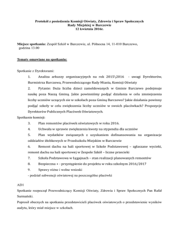Protokół z posiedzenia Komisji Oświaty, Zdrowia i Spraw Społecznych Rady Miejskiej w Barczewie 12 kwietnia 2016r. Miejsce spotkania: Zespół Szkół w Barczewie, ul. Północna 14, 11-010 Barczewo, godzina 13.00 Tematy omawiane na spotkaniu: Spotkanie z Dyrektorami: 1. Analiza arkuszy organizacyjnych na rok 2015\2016 - uwagi Dyrektorów, Burmistrza Barczewa, Przewodniczącego Rady Miasta, Komisji Oświaty 2. Pytanie: Duża liczba dzieci zameldowanych w Gminie Barczewo podejmuje naukę poza Naszą Gminą. Jakie powinniśmy podjąć działania w celu zmniejszenia liczby uczniów uczących sie w szkołach poza Gminą Barczewo? Jakie działania powinny podjąć szkoły w celu zwiększenia liczby uczniów w swoich placówkach? Propozycje Dyrektorów Publicznych Placówek Oświatowych. Spotkanie komisji: 3. Plan remontów placówek oświatowych w roku 2016. 4. Uchwała w sprawie zwiększenia kwoty na stypendia dla uczniów 5. Plan wydatków związanych z uzyskaniem dofinansowania na organizacje oddziałów żłobkowych w Przedszkolu Miejskim w Barczewie 6. Remont dachu na hali sportowej w Szkole Podstawowej – zgłaszane wycieki, remont dachu na hali sportowej w Zespole Szkół – liczne przecieki 7. Szkoła Podstawowa w Łęgajnach – stan realizacji planowanych remontów 8. Bezpieczna + - przystąpienie do projektu w roku szkolnym 2016/2017 9. Sprawy różne i wolne wnioski - podział subwencji oświatowej na poszczególne placówki AD1 Spotkanie rozpoczął Przewodniczący Komisji Oświaty, Zdrowia i Spraw Społecznych Pan Rafał Surmański. Poprosił obecnych na spotkaniu przedstawicieli placówek oświatowych o przedstawienie wyników audytu, który miał miejsce w szkołach. Burmistrz Nitkowski wyraził pozytywną opinię na temat audytu. Uważa, że audyt jest uzasadniony i pomoże w utrzymaniu porządku i dyscypliny zatrudnienia w placówkach oświatowych. Burmistrz poprosił, aby nie odbierać audytu jako braku zaufania do zarządzających placówkami. Pierwsza głos zabrała Pani Sawicka, która odniosła się do wykonanego audytu. Skomentowała punkty, które w jej opinii są niezgodne ze stanem faktycznym. Negatywnie oceniła propozycje zmniejszenia etatu w świetlicy, ze względu na ilość dzieci dojeżdżających (ok. 100 osób), które czekają na gimbusy w szkole i zmniejszenie etatu doradcy zawodowego i pedagoga, ze względu na zwiększoną ilość problemów wychowawczych. Pani Dyrektor poinformowała o problemie z uczniami, a szczególnie z dziewczętami, które sprawiają problemy wychowawcze (wagary oraz palenie papierosów przez nieletnich. Poprosiła Burmistrza, aby zgłosił problem straży miejskiej, która poprzez częstszą kontrolę miejsc przebywania wagarowiczów, może pomóc w zmniejszeniu tego zjawiska. Pan Surmański uważa, że Szkoła Muzyczna, która korzysta z pomieszczeń Zespołu Szkół w Barczewie, powinna partycypować w kosztach związanych z funkcjonowaniem szkoły (środki czystości, energia elektryczna, sprzątanie sal lekcyjnych). Pani Dyrektor Sawicka twierdzi, że Zespół Szkół powinien otrzymywać większą stawkę za korzystanie z hali sportowej. Uważa, że obecna stawka jest niewystarczająca do pokrycia kosztów związanych z obsługą hali. Przewodniczący Rady Miejskiej Pan Andrzej Maciejewski uważa, że Zespół Szkół powinien dokładnie przeanalizować wyniki audytu i wskazać sektory, w który można poczynić oszczędności. Wyniki audytu w Szkole Podstawowej nr 1 w Barczewie przedstawiła Pani Hemmerling, wicedyrektor placówki. Zapoznała wszystkich obecnych ze szczegółami zawartymi w raporcie z audytu oraz zaleceniami dotyczącymi placówki. Pan Moszczyński zauważył dużą rozbieżność między wynikami audytu a opiniami dyrektorów placówek, w których audyt miał miejsce. Burmistrz zaproponował, aby szkoły przeanalizowały dokładnie poszczególne punkty audytu i odniosły się do niego na piśmie w punktach. Pani Dyrektor Kozłowska uważa, że odnoszenie się do audytu pisemnie nic nie wniesie, gdyż występują w nim błędne zapisy. Dodała również, że jeżeli zauważy możliwość oszczędności to z pewnością z niej skorzysta. Audyt wskazuje sektory, w których teoretycznie można poczynić oszczędności, lecz kwoty, które przyjął audytor do swoich wyliczeń są zawyżone i nie odpowiadają rzeczywistości. Przewodniczący Maciejewski uważa, że pozostawienie wyników audytu, z których wynikają możliwości oszczędności rzędu 800 tysięcy złotych bez komentarza ze strony dyrektorów placówek będzie zwyczajną niegospodarnością ze strony Burmistrza. Pani Dyrektor Chyżyńska uważa, że obliczenia dotyczące kosztów zatrudnienia w poszczególnych placówkach wykonane przez audytora są niepoprawne. Przedstawiła własne wyliczenia, które znacząco się różnią od tych w raporcie. Pan Surmański zaproponował by Dyrektorzy odnieśli się na piśmie do audytu do 16 maja 2016 r. AD2 Pan Surmański poprosił szkoły, o przedstawienie pomysłów na skuteczną promocję placówek. Uczniowie mieszkający na terenie gminy Barczewo wybierają szkoły w Olsztynie oraz w Biskupcu. Pan Surmański chciałby wypracować mechanizmy, które zatrzymają uczniów w Barczewie, gdyż gmina wg sugestii Pani Dyrektor Chyżyńskiej traci rocznie blisko 1,5 mln zł. Pan Surmański poprosił dyrektorów szkół, aby do 16 maja przygotowali pomysły na skuteczną promocję swoich placówek. AD3 Pani Chyżyńska poinformowała, że na fundusz remontowy szkół wynosi 150 tysięcy złotych. Pani Dyrektor przedstawiła podział środków między placówkami: 1. Przedszkole Miejskie w Barczewie - 50 000 zmiana sposobu użytkowania obiektu - daszek nad kotłownią 10 000 - udrożnienie kanalizacji 5 000 2. Szkoła Podstawowa nr 1 w Barczewie - schody hala – 6 000 - schody budynek B – 20 000 3. SP w Barczewku 5 tysięcy złotych – wymiana instalacji elektrycznej 4. Z.S. – Hala sportowa 20 000 5. Wak