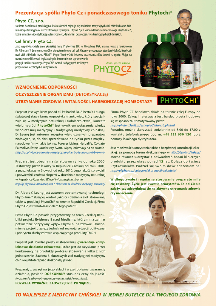 Prezentacja spółki Phyto Cz i ponadczasowego toniku Phytochi® Phyto CZ, s.r.o. to firma handlowa i produkcyjna, która również zajmuje się badaniem tradycyjnych ziół chińskich oraz działalnością edukacyjną w sferze zdrowego stylu życia. Phyto CZ jest współwłaścicielem technologii Phyto-True™, która umożliwia identyfikację autentyczności, działania i bezpieczeństwa tradycyjnych ziół chińskich. Cel firmy Phyto CZ: Jako współwłaściciele amerykańskiej firmy Phyto-True LLC, w Woodbine USA, mamy, wraz z naukowcem Dr. Albertem Y. Leungem, wspólny długoterminowy cel. cel. Chcemy propagować standardy jakości tradycyjnych ziół chińskich (tzw. PTRM™ Phyto-True) wśród lekarstw oraz standardów jakości na rynku. Mając na uwadze rozwój kwestii legislacyjnych, interesuje nas ugruntowanie pozycji toniku ziołowego PhytoChi® wśród tradycyjnych roślinnych preparatów leczniczych z certyfikatem. WZMOCNIENIE ODPORNOŚCI OCZYSZCZENIE ORGANIZMU (DETOKSYKACJĘ) UTRZYMANIE ZDROWIA I WITALNOŚCI, HARMONIZACJĘ HOMEOSTAZY Preparat jest wynikiem ponad 40 lat badań Dr. Alberta Y. Leunga, światowej sławy farmakognostyka (naukowiec, który specjalizuje się w medycynie naturalnej i ziołolecznictwie), laureata wielu nagród. PhytoChi® jest wynikiem połączenia wiedzy współczesnej medycyny i tradycyjnej medycyny chińskiej. Dr Leung jest autorem receptur wielu uznanych preparatów ziołowych, są do dziś sprzedawane na rynku przez między narodowe firmy, takie jak np. Forever Living, Herbalife, Colgate, Palmolive, Estee Lauder czy Avon. Więcej informacji na na stronie : http://pl.phyto.cz/zdrowie-i-medycyna/albert-y-leung-ph-d-b-s-m-s/ Preparat jest obecny na światowym rynku od roku 2000. Testowany przez lekarzy w Republice Czeskiej od roku 2001, a przez lekarzy w Słowacji od roku 2010. Jego jakość sprawdzili i potwierdzili czołowi eksperci w dziedzinie medycyny naturalnej w Republice Czeskiej. Więcej informacji na stronie: http://pl.phyto.cz/o-nas/wspolpraca-z-ekspertami-w-dziedzinie-medycyny-naturalnej/ Dr. Albert Y. Leung jest autorem opatentowanej technologii Phyto-True™ służącej kontroli jakości i działania zioł, stosowanej także w produkcji PhytoChi® na terenie Republiki Czeskiej. Firma Phyto CZ jest wsółwłaścicielem tego patentu. Firma Phyto CZ handlowo działa na terenie całej Europy od roku 2000. Zakup i rejestracja jest bardzo prosta i odbywa się w sposób zautomatyzowany przez: http://phyto.d3soft.cz/eshop/pl/info/vsl_pl.html Ponadto, można skorzystać codziennie od 8.00 do 17.00 z kontaktu telefonicznego pod nr. +48 532 630 120 lub z pomocy lokalnego dystrybutora. Jest możliwość skorzystania także z bezpłatnej konsultacji lekarskiej, za pomocą forum dyskusyjnego w: http://pl.phyto.cz/dyskusja/ Można również skorzystać z doświadczeń badań klinicznych produktu przez okres ponad 12 lat. Dołącz do tysięcy użytkowników. Podziel się swoim doświadczeniem na: http://pl.phyto.cz/category/zkusenosti-uzivatelu/ W długotrwałe i regularne stosowanie preparatu mile cię zaskoczy. Życie jest kwestią priorytetów. To od Ciebie zależy, czy zdecydujesz się na aktywne utrzymanie zdrowia czy na leczenie. Firma Phyto CZ posiada przygotowany na teren Czeskiej Republiki projekt Evidence Based Medicine, którym ma zamiar potwierdzić pozytywny wpływ PhytoChi na zdrowie. Uruchomienie projektu zależy jednak od rozwoju sytuacji politycznej i priorytetu służby zdrowia wspierającego produkty TMCH. Preparat jest bardzo prosty w stosowaniu, gwarantuje kompleksowe działanie zdrowotne, które jest do uzyskania przez konkurencyjne produkty podczas stosowania kilku z nich jednocześnie. Zawiera 8 kluczowych zioł tradycyjnej medycyny chińskiej (fitoterapii) o doskonałej jakości. Preparat, z uwagi na jego skład i wyżej opisaną gwarancję działania, posiada DOSKONAŁY stosunek ceny do jakości (w zakresie zdrowotnego wpływu na ludzki organizm). POZWALA WYRAŹNIE ZAOSZCZĘDZIĆ PIENIĄDZE. TO NAJLEPSZE Z MEDYCYNY CHIŃSKIEJ W JEDNEJ BUTELCE DLA TWOJEGO ZDROWIA