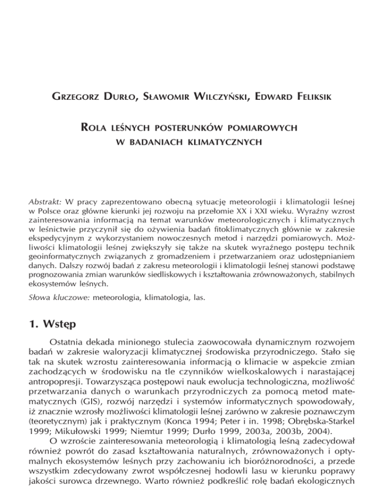 Grzegorz Durło, Sławomir Wilczyński, Edward Feliksik Rola leśnych posterunków pomiarowych w badaniach klimatycznych Abstrakt: W pracy zaprezentowano obecną sytuację meteorologii i klimatologii leśnej w Polsce oraz główne kierunki jej rozwoju na przełomie XX i XXI wieku. Wyraźny wzrost zainteresowania informacją na temat warunków meteorologicznych i klimatycznych w leśnictwie przyczynił się do ożywienia badań fitoklimatycznych głównie w zakresie ekspedycyjnym z wykorzystaniem nowoczesnych metod i narzędzi pomiarowych. Możliwości klimatologii leśnej zwiększyły się także na skutek wyraźnego postępu technik geoinformatycznych związanych z gromadzeniem i przetwarzaniem oraz udostępnianiem danych. Dalszy rozwój badań z zakresu meteorologii i klimatologii leśnej stanowi podstawę prognozowania zmian warunków siedliskowych i kształtowania zrównoważonych, stabilnych ekosystemów leśnych. Słowa kluczowe: meteorologia, klimatologia, las. 1. Wstęp Ostatnia dekada minionego stulecia zaowocowała dynamicznym rozwojem badań w zakresie waloryzacji klimatycznej środowiska przyrodniczego. Stało się tak na skutek wzrostu zainteresowania informacją o klimacie w aspekcie zmian zachodzących w środowisku na tle czynników wielkoskalowych i narastającej antropopresji. Towarzysząca postępowi nauk ewolucja technologiczna, możliwość przetwarzania danych o warunkach przyrodniczych za pomocą metod matematycznych (GIS), rozwój narzędzi i systemów informatycznych spowodowały, iż znacznie wzrosły możliwości klimatologii leśnej zarówno w zakresie poznawczym (teoretycznym) jak i praktycznym (Konca 1994; Peter i in. 1998; Obrębska-Starkel 1999; Mikułowski 1999; Niemtur 1999; Durło 1999, 2003a, 2003b, 2004). O wzroście zainteresowania meteorologią i klimatologią leśną zadecydował również powrót do zasad kształtowania naturalnych, zrównoważonych i optymalnych ekosystemów leśnych przy zachowaniu ich bioróżnorodności, a przede wszystkim zdecydowany zwrot współczesnej hodowli lasu w kierunku poprawy jakości surowca drzewnego. Warto również podkreślić rolę badań ekologicznych 180 Grzegorz Durło, Sławomir Wilczyński, Edward Feliksik i biologicznych w zakresie rozpoznania reakcji środowiska na nowe, dynamiczne kierunki w jego zagospodarowaniu, co stanowi obecnie jedno z podstawowych zadań leśnictwa wielofunkcyjnego (Łonkiewicz 1986; Łonkiewicz, Głuch 1991; Krzymowska-Kostrowicka 1999; Obrębska-Starkel 1999; Głaz 2001; Grzywacz 2001; Matzarakis 2002; Durło 2004). 2. Organizacja sieci Obecnie w kraju wdrażany jest system funkcjonowania sieci całorocznych leśnych stacji meteorologicznych na terenach Lasów Państwowych (Zarządzenie nr 7, Dyr. Gener. LP z dn. 2004-02-11). W skład sieci wchodzą 34 „punkty prognostyczne” działające pod nadzorem Samodzielnego Zakładu Ochrony Przeciwpożarowej Instytutu Badawczego Leśnictwa, w których gromadzone są dane meteorologiczne, wykorzystywane do oceny zagrożenia pożarowego. Z 34 stacji jedynie dziesięć wykonuje pomiary i obserwacje w zakresie przewidzianym dla równorzędnych stacji III rzędu państwowej sieci IMiGW, pozostałe 24 w zakresie obowiązującym na stacjach IV rzędu. Ponadto, pomiary i obserwacje wykonywane są na siedemdziesięciu „pomocniczych punktach pomiarowych” oraz kilku innych posterunkach i stacjach fitoklimatycznych działających na potrzeby Wydziału Ochrony Lasu Dyrekcji Generalnej Lasów Państwowych, których liczbę szacuje się na 6-8 (tab. 1). Poza wyżej wymienionymi na terenie kraju działa kilkanaście leśnych stacji meteorologicznych, posterunków fitoklimatycznych, fenologicznych oraz opadowych związanych z jednostkami naukowymi szkół wyższych, instytutami Polskiej Akademii Nauk, sekcjami naukowymi parków narodowych i samodzielTab. 1. Stan sieci meteorologicznej Lasów Państwowych na dzień 2003-12-31 Table 1. Meteorological network in the state forests on 2003-12-31 Rola leśnych posterunków pomiarowych w badaniach klimatycznych 181 nymi pracowniami realizującymi badania w zakresie monitoringu ekologicznego, współpracującymi z jednostkami samorządowymi. Na podstawie danych zebranych w trakcie trwania konferencji naukowej pt. „Klimatyczne uwarunkowania życia lasu”, jaka odbyła się w Zakopanym w 1999 roku, ustalono, że liczba takich stacji wynosi blisko 70 w tym 25 zlokalizowanych jest pod okapem drzewostanu (tab. 2). Specjalistyczne badania z zakresu meteorologii i klimatologii leśnej realizowane są głównie na terenach leśnych zakładów doświadczalnych w Rogowie i Sękocinie koło Warszawy, Krynicy koło Nowego Sącza, Murowanej Goślinie koło Poznania, oraz na obszarach parków narodowych i krajobrazowych: Białowieskiego, Świętokrzyskiego, Tatrzańskiego, Pienińskiego, Babiogórskiego, Bieszczadzkiego i Popradzkiego. W ostatnich trzech latach powstały dodatkowo 4 posterunki meteorologiczne związane z działalnością naukowo-badawczą prowadzoną w ramach leśnych kompleksów promocyjnych, nad którymi nadzór sprawuje Dyrekcja Generalna Lasów Państwowych. Zgodnie z założeniami wdrażanego systemu przewiduje się utworzenie krajowej sieci leśnych stacji meteorologicznych w liczbie około 60. Docelowo stacje mają być w pełni zautomatyzowane z możliwością bezpośredniego dostępu do danych. Na terenach o podwyższonym ryzyku wystąpienia pożarów, drzewostanach o strategicznym dla gospodarstwa leśnego znaczeniu oraz tych wyjątkowo cennych powierzchniach, stacje i posterunki zostaną wyposażone w systemy ciągłego monitorowania audiowizualnego. Tab. 2. Stacje meteorologiczne, klimatologiczne i fitoklimatyczne działające w ramach jednostek naukowo-badawczych (stan na dzień 1999-06-30) Table 2. Meteorological, climatological and phytoclimatological stations, belonging to research institutions and operating on 1999-06-30 182 Grzegorz Durło, Sławomir Wilczyński, Edward Feliksik 3