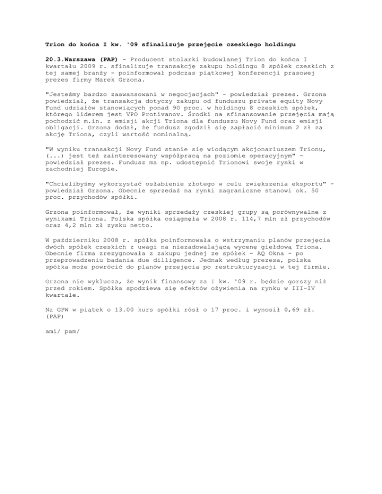 Trion do końca I kw. '09 sfinalizuje przejęcie czeskiego holdingu 20.3.Warszawa (PAP) - Producent stolarki budowlanej Trion do końca I kwartału 2009 r. sfinalizuje transakcję zakupu holdingu 8 spółek czeskich z tej samej branŜy - poinformował podczas piątkowej konferencji prasowej prezes firmy Marek Grzona. "Jesteśmy bardzo zaawansowani w negocjacjach" - powiedział prezes. Grzona powiedział, Ŝe transakcja dotyczy zakupu od funduszu private equity Novy Fund udziałów stanowiących ponad 90 proc. w holdingu 8 czeskich spółek, którego liderem jest VPO Protivanov. Środki na sfinansowanie przejęcia mają pochodzić m.in. z emisji akcji Triona dla funduszu Novy Fund oraz emisji obligacji. Grzona dodał, Ŝe fundusz zgodził się zapłacić minimum 2 zł za akcję Triona, czyli wartość nominalną. "W wyniku transakcji Novy Fund stanie się wiodącym akcjonariuszem Trionu, (...) jest teŜ zainteresowany współpracą na poziomie operacyjnym" powiedział prezes. Fundusz ma np. udostępnić Trionowi swoje rynki w zachodniej Europie. "Chcielibyśmy wykorzystać osłabienie złotego w celu zwiększenia eksportu" powiedział Grzona. Obecnie sprzedaŜ na rynki zagraniczne stanowi ok. 50 proc. przychodów spółki. Grzona poinformował, Ŝe wyniki sprzedaŜy czeskiej grupy są porównywalne z wynikami Triona. Polska spółka osiągnęła w 2008 r. 114,7 mln zł przychodów oraz 4,2 mln zł zysku netto. W październiku 2008 r. spółka poinformowała o wstrzymaniu planów przejęcia dwóch spółek czeskich z uwagi na niezadowalającą wycenę giełdową Triona. Obecnie firma zrezygnowała z zakupu jednej ze spółek - AQ Okna - po przeprowadzeniu badania due dilligence. Jednak według prezesa, polska spółka moŜe powrócić do planów przejęcia po restrukturyzacji w tej firmie. Grzona nie wyklucza, Ŝe wynik finansowy za I kw. '09 r. będzie gorszy niŜ przed rokiem. Spółka spodziewa się efektów oŜywienia na rynku w III-IV kwartale. Na GPW w piątek o 13.00 kurs spółki rósł o 17 proc. i wynosił 0,69 zł. (PAP) ami/ pam/