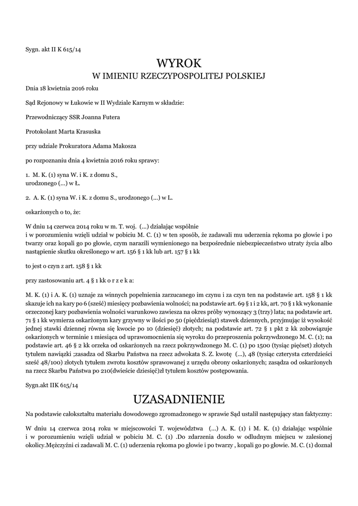 Sygn. akt II K 615/14 WYROK W IMIENIU RZECZYPOSPOLITEJ POLSKIEJ Dnia 18 kwietnia 2016 roku Sąd Rejonowy w Łukowie w II Wydziale Karnym w składzie: Przewodniczący SSR Joanna Futera Protokolant Marta Krasuska przy udziale Prokuratora Adama Makosza po rozpoznaniu dnia 4 kwietnia 2016 roku sprawy: 1. M. K. (1) syna W. i K. z domu S., urodzonego (...) w Ł. 2. A. K. (1) syna W. i K. z domu S., urodzonego (...) w L. oskarżonych o to, że: W dniu 14 czerwca 2014 roku w m. T. woj. (...) działając wspólnie i w porozumieniu wzięli udział w pobiciu M. C. (1) w ten sposób, że zadawali mu uderzenia rękoma po głowie i po twarzy oraz kopali go po głowie, czym narazili wymienionego na bezpośrednie niebezpieczeństwo utraty życia albo nastąpienie skutku określonego w art. 156 § 1 kk lub art. 157 § 1 kk to jest o czyn z art. 158 § 1 kk przy zastosowaniu art. 4 § 1 kk o r z e k a: M. K. (1) i A. K. (1) uznaje za winnych popełnienia zarzucanego im czynu i za czyn ten na podstawie art. 158 § 1 kk skazuje ich na kary po 6 (sześć) miesięcy pozbawienia wolności; na podstawie art. 69 § 1 i 2 kk, art. 70 § 1 kk wykonanie orzeczonej kary pozbawienia wolności warunkowo zawiesza na okres próby wynoszący 3 (trzy) lata; na podstawie art. 71 § 1 kk wymierza oskarżonym kary grzywny w ilości po 50 (pięćdziesiąt) stawek dziennych, przyjmując iż wysokość jednej stawki dziennej równa się kwocie po 10 (dziesięć) złotych; na podstawie art. 72 § 1 pkt 2 kk zobowiązuje oskarżonych w terminie 1 miesiąca od uprawomocnienia się wyroku do przeproszenia pokrzywdzonego M. C. (1); na podstawie art. 46 § 2 kk orzeka od oskarżonych na rzecz pokrzywdzonego M. C. (1) po 1500 (tysiąc pięćset) złotych tytułem nawiązki ;zasadza od Skarbu Państwa na rzecz adwokata S. Z. kwotę (...), 48 (tysiąc czterysta czterdzieści sześć 48/100) złotych tytułem zwrotu kosztów sprawowanej z urzędu obrony oskarżonych; zasądza od oskarżonych na rzecz Skarbu Państwa po 210(dwieście dziesięć)zł tytułem kosztów postępowania. Sygn.akt IIK 615/14 UZASADNIENIE Na podstawie całokształtu materiału dowodowego zgromadzonego w sprawie Sąd ustalił następujący stan faktyczny: W dniu 14 czerwca 2014 roku w miejscowości T. województwa (...) A. K. (1) i M. K. (1) działając wspólnie i w porozumieniu wzięli udział w pobiciu M. C. (1) .Do zdarzenia doszło w odludnym miejscu w zalesionej okolicy.Mężczyźni ci zadawali M. C. (1) uderzenia rękoma po głowie i po twarzy , kopali go po głowie. M. C. (1) doznał obrażeń ciała w postaci :stłuczenia głowy, krwiaka okularowego prawego, złamania kości nosa z przemieszczeniem odłamów ,które naruszyły prawidłowe funkcje jego organizmu na okres powyżej siedmiu dni. Powyższy stan faktyczny Sąd ustalił w oparciu o następujące dowody: zeznania świadków :M. C. (1) (k.3-4,32,33,81-81v,121-122),W. B.(k.170),M. S.(k.11,34,35,81v-82), A. K. (k.12,82) , A. C.(k.136),P. P. (1)(k.136-137) oraz dowody w postaci: informacja o przestępstwie( k 3-4 ), koperty z dokumentacją medyczną M. C. (1)( k.27 ), opinia sądowo lekarska (k.16 ) , wywiad policyjny dot. M. K. (1) (k.29), wywiad policyjny dot. A. K. (1)( k.30 ), zaświadczenie o stanie majątkowym dot. M. K. (1) (k.36), Zaświadczenie o stanie majątkowym dot. A. K. (1)( k.37), dane o karalności dot. M. K. (1)( k.38-39,78-79,102-103,117-118 ), dane o karalności dot. A. K. (1)( k.41-41,77-78,101,116), wywiad środowiskowy dot. A. K. (1) i M. K. (1)( k.90, 91). Oskarżony M. K. (1) nie przyznał się do popełnienia zarzucanego mu czynu (k.80v)i wyjaśnił ,że tego dnia pił z pokrzywdzonym alkohol w lesie do około 22:00.Wypił z nim ze 3 kieliszki po 50gramów,a następnie pokrzywdzony zaprowadził go na swoją posesję ,gdyż się przewracał i źle czuł .Na drugi dzień dowiedział się ,że miał pobić C.. C. pojechał rowerem i jego brat go tego wieczora nie widział .Nie przepraszał C. za nic. Potwierdził wyjaśnienia złożone w postępowaniu przygotowawczym(k.20-21,32,35),w których także nie przyznał się do popełnienia zarzucanego mu czynu i wyjaśnił, że pił wieczorem w lesie alkohol z C. i pytał go dlaczego ten mówi na niego nieprawdziwe rzeczy czemu ten zaprzeczył .Po spożyciu alkoholu C. powiedział, że musi jechać i poszedł w stronę T. .On sam zaś poszedł w stronę domu brata A., którego po drodze spotkał i brat zabrał go do siebie. Około 1-ej w nocy wyszedł od brata i poszedł do domu. Oskarżony A. K. (1) nie przyznał się do popełnienia zarzucanego mu czynu (k.122-123)i odmówił składania wyjaśnień ,potwierdził wyjaśnienia złożone w postępowaniu przygotowawczym(k.25-26,33-33v,34-34v),gdzie podał że było ciemno ,wyszedł na drogę i zobaczył brata M. pod dość silnym działaniem alkoholu, który mu powiedział ,że pił w lesie wódkę z C. .On i jego brat nie pobili C.. Następnie odpowiadając na pytania obrońcy wyjaśnił ,że wyszedł około 23:00 do lasu i przyprowadził brata M. do domu, co widzieli żona i rodzice .Potem ani on ani brat nie wychodzili już z domu. W dniu zdarzenia widział C. w lesie. Sąd zważył , co następuje: W przedmiotowej sprawie oskarżeni M. K. (1) i A. K. (1) stoją pod zarzutem popełnienia przestępstwa przeciwko życiu i zdrowiu stypizowanego w art.158§1kk..W zakresie ustalenia stanu faktycznego miarodajne dla Sądu były dowody z dokumentów ,w tym w szczególności dokumentacja medyczna dotycząca doznanych obrażeń i przebiegu procesu leczenia pokrzywdzonego M. C. (1), specjalistyczna opinia biegłego chirurga ,a także zeznania świadków ,którzy nie byli osobiście zainteresowani rozstrzygnięciem mającym zapaść w sprawie ,w tym także policjantów zobowiązanych z mocy ustawy do reagowania na wszelkie naruszenia prawa. Sąd ustalił, iż w następstwie zdarzenia zaistniałego w dniu 31 maja 2014r M. C. (1) doznał obrażeń ciała w postaci :stłuczenia głowy ,krwiaka oku