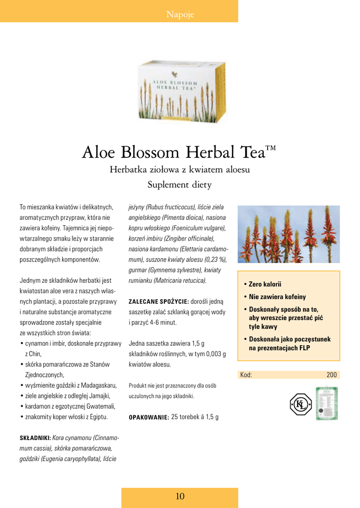 Napoje Aloe Blossom Herbal Tea™ Herbatka ziołowa z kwiatem aloesu Suplement diety To mieszanka kwiatów i delikatnych, aromatycznych przypraw, która nie zawiera kofeiny. Tajemnica jej niepowtarzalnego smaku le˝y w starannie dobranym składzie i proporcjach poszczególnych komponentów. Jednym ze składników herbatki jest kwiatostan aloe vera z naszych własnych plantacji, a pozostałe przyprawy i naturalne substancje aromatyczne sprowadzone zostały specjalnie ze wszystkich stron Êwiata: • cynamon i imbir, doskonałe przyprawy z Chin, • skórka pomaraƒczowa ze Stanów Zjednoczonych, • wyÊmienite goêdziki z Madagaskaru, • ziele angielskie z odległej Jamajki, • kardamon z egzotycznej Gwatemali, • znakomity koper włoski z Egiptu. je˝yny (Rubus fructicocus), liÊcie ziela angielskiego (Pimenta dioica), nasiona kopru włoskiego (Foeniculum vulgare), korzeƒ imbiru (Zingiber officinale), nasiona kardamonu (Elettaria cardamomum), suszone kwiaty aloesu (0,23 %), gurmar (Gymnema sylvestre), kwiaty rumianku (Matricaria retucica). ZALECANE SPO˚YCIE: doroÊli jednà saszetk´ zalaç szklankà goràcej wody i parzyç 4-6 minut. Jedna saszetka zawiera 1,5 g składników roÊlinnych, w tym 0,003 g kwiatów aloesu. • Zero kalorii • Nie zawiera kofeiny • Doskonały sposób na to, aby wreszcie przestaç piç tyle kawy • Doskonała jako pocz´stunek na prezentacjach FLP Kod: Produkt nie jest przeznaczony dla osób uczulonych na jego składniki. OPAKOWANIE: 25 torebek á 1,5 g SK¸ADNIKI: Kora cynamonu (Cinnamomum cassia), skórka pomaraƒczowa, goêdziki (Eugenia caryophyllata), liÊcie 10 200