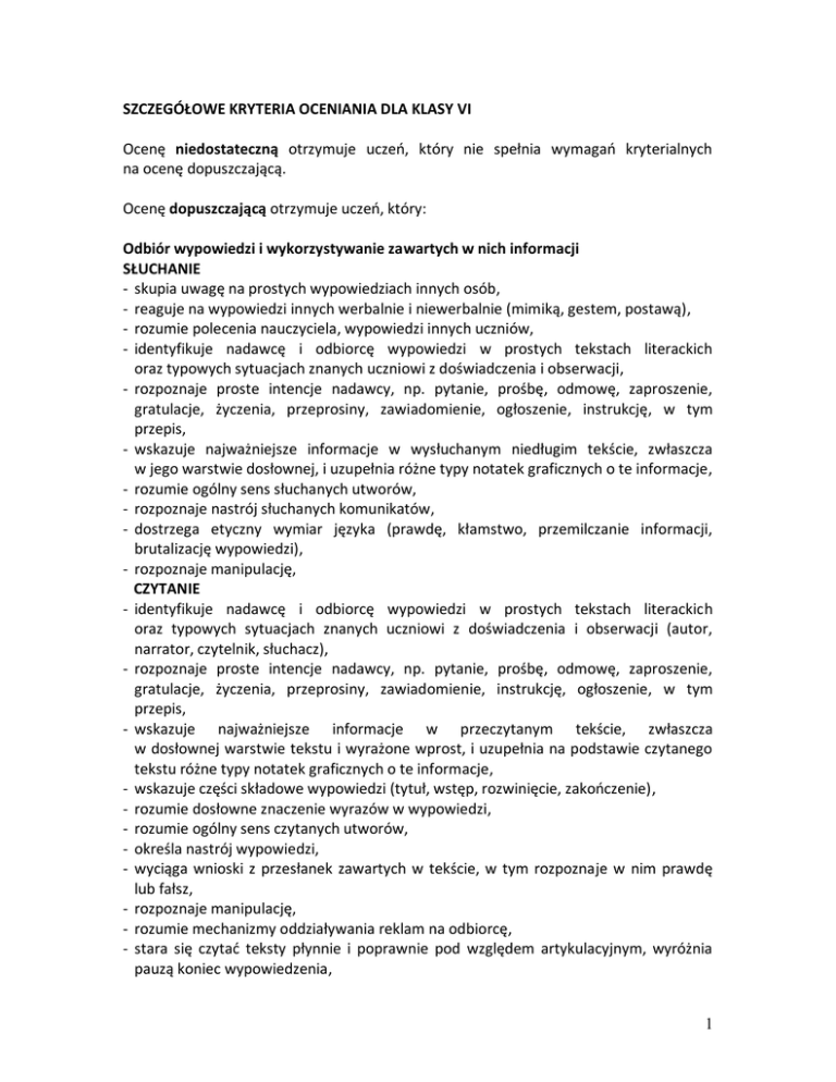 SZCZEGÓŁOWE KRYTERIA OCENIANIA DLA KLASY VI Ocenę niedostateczną otrzymuje uczeń, który nie spełnia wymagań kryterialnych na ocenę dopuszczającą. Ocenę dopuszczającą otrzymuje uczeń, który: Odbiór wypowiedzi i wykorzystywanie zawartych w nich informacji SŁUCHANIE - skupia uwagę na prostych wypowiedziach innych osób, - reaguje na wypowiedzi innych werbalnie i niewerbalnie (mimiką, gestem, postawą), - rozumie polecenia nauczyciela, wypowiedzi innych uczniów, - identyfikuje nadawcę i odbiorcę wypowiedzi w prostych tekstach literackich oraz typowych sytuacjach znanych uczniowi z doświadczenia i obserwacji, - rozpoznaje proste intencje nadawcy, np. pytanie, prośbę, odmowę, zaproszenie, gratulacje, życzenia, przeprosiny, zawiadomienie, ogłoszenie, instrukcję, w tym przepis, - wskazuje najważniejsze informacje w wysłuchanym niedługim tekście, zwłaszcza w jego warstwie dosłownej, i uzupełnia różne typy notatek graficznych o te informacje, - rozumie ogólny sens słuchanych utworów, - rozpoznaje nastrój słuchanych komunikatów, - dostrzega etyczny wymiar języka (prawdę, kłamstwo, przemilczanie informacji, brutalizację wypowiedzi), - rozpoznaje manipulację, CZYTANIE - identyfikuje nadawcę i odbiorcę wypowiedzi w prostych tekstach literackich oraz typowych sytuacjach znanych uczniowi z doświadczenia i obserwacji (autor, narrator, czytelnik, słuchacz), - rozpoznaje proste intencje nadawcy, np. pytanie, prośbę, odmowę, zaproszenie, gratulacje, życzenia, przeprosiny, zawiadomienie, instrukcję, ogłoszenie, w tym przepis, - wskazuje najważniejsze informacje w przeczytanym tekście, zwłaszcza w dosłownej warstwie tekstu i wyrażone wprost, i uzupełnia na podstawie czytanego tekstu różne typy notatek graficznych o te informacje, - wskazuje części składowe wypowiedzi (tytuł, wstęp, rozwinięcie, zakończenie), - rozumie dosłowne znaczenie wyrazów w wypowiedzi, - rozumie ogólny sens czytanych utworów, - określa nastrój wypowiedzi, - wyciąga wnioski z przesłanek zawartych w tekście, w tym rozpoznaje w nim prawdę lub fałsz, - rozpoznaje manipulację, - rozumie mechanizmy oddziaływania reklam na odbiorcę, - stara się czytać teksty płynnie i poprawnie pod względem artykulacyjnym, wyróżnia pauzą koniec wypowiedzenia, 1 - rozpoznaje podstawowe funkcje składniowe wyrazów użytych w wypowiedziach (orzeczenie, podmiot), - rozpoznaje w wypowiedziach podstawowe części mowy (rzeczownik, czasownik, przymiotnik, przysłówek, liczebnik, zaimek, przyimek, spójnik), - rozpoznaje zdanie pojedyncze i zdanie złożone, - wskazuje cudzysłów, DOCIERANIE DO INFORMACJI - sprawdza pisownię wyrazów w słowniku ortograficznym, - wyszukuje synonimy w słowniku wyrazów bliskoznacznych, - wybiera proste informacje z hasła encyklopedycznego, poradnika, leksykonu, czasopisma, podanej strony internetowej, II. Analiza i interpretacja tekstów kultury - mówi o swoich reakcjach czytelniczych, - porównuje swoje wrażenia związane z odbiorem innych tekstów, - wyraża swój stosunek do postaci - odróżnia fikcję od rzeczywistości, - rozpoznaje typowe elementy fikcji, charakterystyczne dla poznanych gatunków - odróżnia elementy fantastyczne od realistycznych w baśniach, legendach, mitach, bajkach, opowiadaniach, powieściach, - odróżnia autora od osoby mówiącej w tekście literackim, - charakteryzuje osobę mówiącą na podstawie jej wypowiedzi, - określa najważniejsze elementy świata przedstawionego w utworze epickim, takie jak: czas, miejsce, bohaterowie, zdarzenia, - omawia akcję, - wyodrębnia w utworze epickim wydarzenia układające się w wątki, - rozpoznaje baśń, legendę, bajkę, mit, powieść, opowiadanie, komiks, fraszkę, wiersz, przysłowie, - rozpoznaje wers, strofę, rym, refren, rytm, - odróżnia wiersz rymowany od nierymowanego (białego), - rozpoznaje przenośnię, porównane, epitet, wyraz dźwiękonaśladowczy, uosobienie, ożywienie, - wyodrębnia film, program informacyjny, program rozrywkowy, spektakl teatralny spośród innych przekazów i tekstów kultury oraz potrafi nazwać ich tworzywo (ruchome obrazy, warstwa dźwiękowa), - odczytuje informacje z plakatu teatralnego, III. Tworzenie wypowiedzi MÓWIENIE - nawiązuje i podtrzymuje kontakt werbalny z innymi uczniami i nauczycielem, - formułuje proste pytania i udziela prostych odpowiedzi pod względem konstrukcyjnym, - w rozmowie zadaje pytania uzupełniające, - wypowiada komunikaty zawierające proste informacje, 2 - wyraża wprost swoje intencje, - odróżnia sytuację oficjalną od nieoficjalnej i potrafi odpowiednio do sytuacji komunikacyjnej skierować prośbę, pytanie, odmowę, wyjaśnienie, zaproszenie, instrukcję, gratulacje, życzenia, przekonać, zachęcić, przestrzec, - stosuje podstawowe zwroty grzecznościowe podczas rozmowy z osobą dorosłą i rówieśnikiem, - mówi na temat, opowiada o obserwowanych zdarzeniach, akcji książki, filmu, - za pomocą prostych zdań opisuje przedmiot, miejsce, krajobraz, postać, zwierzę, - za pomocą prostych zdań opisuje obraz, ilustrację, plakat, fotografię, - wygłasza tekst utworu z pamięci (teksty poetyckie, fragmenty prozy), PISANIE - stosuje wielką literę na początku wypowiedzenia i odpowiednie znaki interpunkcyjne na jego końcu, - zna podstawowe zasady dotyczące pisowni wielką literą oraz pisowni ó – u, rz – ż, ch – h, - tworzy proste wypowiedzi oraz notatki na podany temat, - uzupełnia prosty schemat, tabelę, - zna podstawowe zasady układu graficznego listu prywatnego i oficjalnego, dialogu, zaproszenia, ogłoszenia, planu ramowego i szczegółowego wypowiedzi i z pomocą nauczyciela zapisuje list, dialog, układa plan ramowy i szczegółowy wypowiedzi, redaguje zaproszenie, ogłoszenie, instrukcję, pamiętnik i dziennik pisany z perspektywy bohatera i własnej, proste sprawozdanie, - zapisuje kilkuzdaniowe opowiadanie odtwórcze z dialogiem, - za pomocą pros