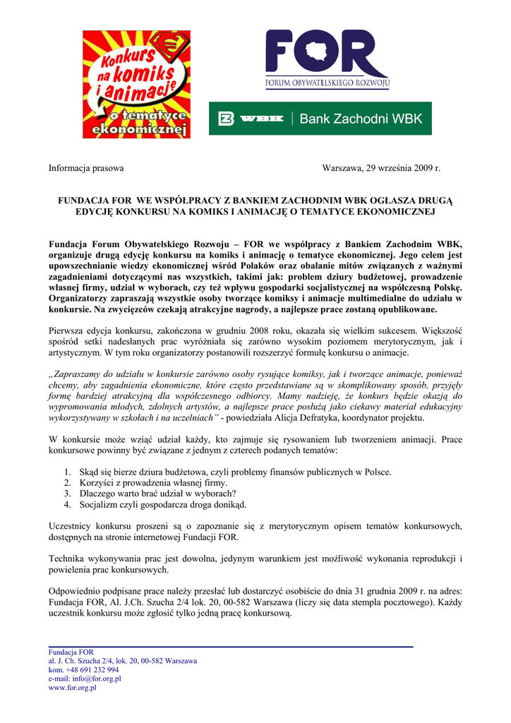 Informacja prasowa Warszawa, 29 września 2009 r. FUNDACJA FOR WE WSPÓŁPRACY Z BANKIEM ZACHODNIM WBK OGŁASZA DRUGĄ EDYCJĘ KONKURSU NA KOMIKS I ANIMACJĘ O TEMATYCE EKONOMICZNEJ Fundacja Forum Obywatelskiego Rozwoju – FOR we współpracy z Bankiem Zachodnim WBK, organizuje drugą edycję konkursu na komiks i animację o tematyce ekonomicznej. Jego celem jest upowszechnianie wiedzy ekonomicznej wśród Polaków oraz obalanie mitów związanych z waŜnymi zagadnieniami dotyczącymi nas wszystkich, takimi jak: problem dziury budŜetowej, prowadzenie własnej firmy, udział w wyborach, czy teŜ wpływu gospodarki socjalistycznej na współczesną Polskę. Organizatorzy zapraszają wszystkie osoby tworzące komiksy i animacje multimedialne do udziału w konkursie. Na zwycięzców czekają atrakcyjne nagrody, a najlepsze prace zostaną opublikowane. Pierwsza edycja konkursu, zakończona w grudniu 2008 roku, okazała się wielkim sukcesem. Większość spośród setki nadesłanych prac wyróŜniała się zarówno wysokim poziomem merytorycznym, jak i artystycznym. W tym roku organizatorzy postanowili rozszerzyć formułę konkursu o animacje. „Zapraszamy do udziału w konkursie zarówno osoby rysujące komiksy, jak i tworzące animacje, poniewaŜ chcemy, aby zagadnienia ekonomiczne, które często przedstawiane są w skomplikowany sposób, przyjęły formę bardziej atrakcyjną dla współczesnego odbiorcy. Mamy nadzieję, Ŝe konkurs będzie okazją do wypromowania młodych, zdolnych artystów, a najlepsze prace posłuŜą jako ciekawy materiał edukacyjny wykorzystywany w szkołach i na uczelniach” - powiedziała Alicja Defratyka, koordynator projektu. W konkursie moŜe wziąć udział kaŜdy, kto zajmuje się rysowaniem lub tworzeniem animacji. Prace konkursowe powinny być związane z jednym z czterech podanych tematów: 1. 2. 3. 4. Skąd się bierze dziura budŜetowa, czyli problemy finansów publicznych w Polsce. Korzyści z prowadzenia własnej firmy. Dlaczego warto brać udział w wyborach? Socjalizm czyli gospodarcza droga donikąd. Uczestnicy konkursu proszeni są o zapoznanie się z merytorycznym opisem tematów konkursowych, dostępnych na stronie internetowej Fundacji FOR. Technika wykonywania prac jest dowolna, jedynym warunkiem jest moŜliwość wykonania reprodukcji i powielenia prac konkursowych. Odpowiednio podpisane prace naleŜy przesłać lub dostarczyć osobiście do dnia 31 grudnia 2009 r. na adres: Fundacja FOR, Al. J.Ch. Szucha 2/4 lok. 20, 00-582 Warszawa (liczy się data stempla pocztowego). KaŜdy uczestnik konkursu moŜe zgłosić tylko jedną pracę konkursową. Fundacja FOR al. J. Ch. Szucha 2/4, lok. 20, 00-582 Warszawa kom. +48 691 232 994 e-mail: [email protected] www.for.org.pl W jury konkursu zasiadają: prof. Leszek Balcerowicz - Przewodniczący Rady Fundacji FOR oraz znani animatorzy, rysownicy i satyrycy: Tomasz Bagiński, Jacek Fedorowicz, Michał Ogórek, Tomasz Leśniak i Rafał SkarŜycki – twórcy JeŜa Jerzego, Marek Raczkowski, Antoni Rodowicz oraz Artur Adamski. Jury będzie oceniać prace pod względem zgodności z zaproponowanym opisem problemu, oryginalności artystycznej i atrakcyjności wizualnej. Za prace komiksowe przyznane zostaną następujące nagrody: I miejsce – 5000 zł, II miejsce – 3000 zł, III miejsce – 2000 zł, a takŜe 4 wyróŜnienia w kaŜdej kategorii tematycznej w grupie wiekowej do ostatniej klasy gimnazjum - po 1000 zł oraz 4 wyróŜnienia w kaŜdej kategorii tematycznej w grupie wiekowej powyŜej gimnazjum - po 1000 zł. Za prace multimedialne (bez podziału na kategorie wiekowe) przewidziano następujące nagrody: I miejsce – 5000 zł, II miejsce – 3000 zł, III miejsce – 2000 zł oraz 4 wyróŜnienia w kaŜdej kategorii tematycznej - po 1000 zł. Dodatkowo, nagrodzone i wyróŜnione prace zostaną opublikowane w antologii, będą pokazywane na specjalnej wystawie, a takŜe zostaną wykorzystane wraz z napisanymi specjalnie do nich scenariuszami lekcji jako materiał edukacyjny w gimnazjach i szkołach ponadgimnazjalnych. Więcej informacji oraz pełny regulamin konkursu dostępne są na stronie Fundacji FOR: www.for.org.pl Na stronie Fundacji FOR dostępne są równieŜ prace nagrodzone w pierwszej edycji konkursu oraz scenariusze lekcji z podstaw przedsiębiorczości, przygotowane na podstawie wybranych prac przez metodyków z Centralnego Ośrodka Doskonalenia Nauczycieli przy współpracy z ekonomistami FOR. Organizatorzy zachęcają nauczycieli szkół gimnazjalnych i ponadgimnazjalnych do wykorzystywania scenariuszy zarówno podczas lekcji podstawy przedsiębiorczości jak i wiedzy o społeczeństwie. Scenariusze znajdują się na stronie internetowej: http://www.for.org.pl/pl/konkurs-na-komiks-wyniki Partnerem Konkursu jest Bank Zachodni WBK. Patroni Konkursu: Gazeta Wyborcza, Wyborcza.biz, Metro, Centralny Ośrodek Doskonalenia Nauczycieli, Gildia.pl, Aleja Komiksu, Korba.pl, TOK FM, TVN24.pl. Wsparcie Public Relations: Ciszewski Financial Communications Dane Organizatora Konkursu: Fundacja FOR, al. Szucha 2/4, lok. 20, 00-582 Warszawa, e-mail: [email protected] www.for.org.pl Dodatkowych informacji udzielają: Alicja Defratyka Koordynator projektu kom. +48 609 717 102 e-mail: [email protected] Fundacja FOR al. J. Ch. Szucha 2/4, lok. 20, 00-582 Warszawa kom. +48 691 232 994 e-mail: [email protected] www. for.org.pl Emilia Legieta Specjalista ds. Public Relations kom. +48 691 232 993 e-mail: [email protected]
