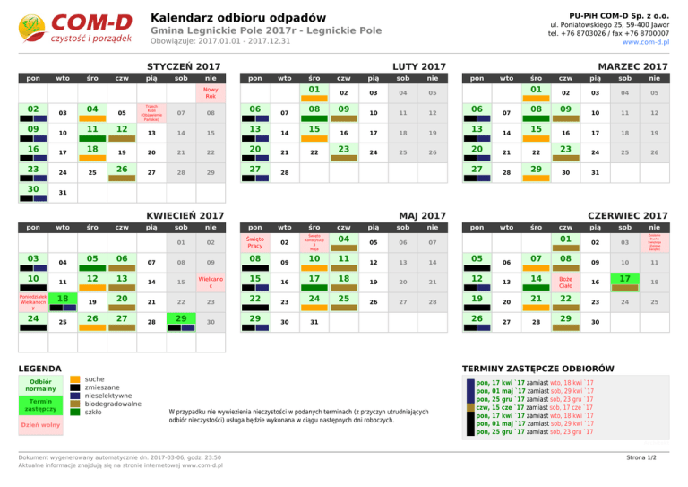 Kalendarz odbioru odpadów PU-PiH COM-D Sp. z o.o. ul. Poniatowskiego 25, 59-400 Jawor tel. +76 8703026 / fax +76 8700007 www.com-d.pl Gmina Legnickie Pole 2017r - Legnickie Pole Obowiązuje: 2017.01.01 - 2017.12.31 STYCZEŃ 2017 pon wto śro czw pią sob nie LUTY 2017 pon wto Nowy Rok śro czw pią sob nie 01 02 03 04 05 MARZEC 2017 pon wto śro czw pią sob nie 01 02 03 04 05 Trzech Króli (Objawienie Pańskie) 07 08 06 07 08 09 10 11 12 06 07 08 09 10 11 12 02 03 04 05 09 10 11 12 13 14 15 13 14 15 16 17 18 19 13 14 15 16 17 18 19 16 17 18 19 20 21 22 20 21 22 23 24 25 26 20 21 22 23 24 25 26 23 24 25 26 27 28 29 27 28 27 28 29 30 31 30 31 pon wto śro czw pią nie pon wto śro czw pon wto śro czw 01 02 Święto Pracy 02 Święto Konstytucji 3 Maja 04 05 06 07 KWIECIEŃ 2017 sob 03 04 05 06 07 08 09 10 11 12 13 14 15 Wielkano c 18 19 20 21 22 25 26 27 28 29 Poniedziałek Wielkanocn y 24 MAJ 2017 pią sob nie Termin zastępczy Dzień wolny 01 pią sob nie 02 03 Zesłanie Ducha Świętego (Zielone Świątki) 09 10 11 16 17 18 24 25 08 09 10 11 12 13 14 05 06 07 08 15 16 17 18 19 20 21 12 13 14 Boże Ciało 23 22 23 24 25 26 27 28 19 20 21 22 23 30 29 30 31 26 27 28 29 30 LEGENDA Odbiór normalny CZERWIEC 2017 TERMINY ZASTĘPCZE ODBIORÓW suche zmieszane nieselektywne biodegradowalne szkło W przypadku nie wywiezienia nieczystości w podanych terminach (z przyczyn utrudniających odbiór nieczystości) usługa będzie wykonana w ciągu następnych dni roboczych. XX pon, 17 kwi `17 zamiast wto, 18 kwi `17 XX pon, 01 maj `17 zamiast sob, 29 kwi `17 XX pon, 25 gru `17 zamiast sob, 23 gru `17 XX czw, 15 cze `17 zamiast sob, 17 cze `17 XX pon, 17 kwi `17 zamiast wto, 18 kwi `17 XX pon, 01 maj `17 zamiast sob, 29 kwi `17 XX pon, 25 gru `17 zamiast sob, 23 gru `17 Architekt Dokument wygenerowany automatycznie dn. 2017-03-06, godz. 23:50 Aktualne informacje znajdują się na stronie internetowej www.com-d.pl Strona 1/2 Kalendarz odbioru odpadów PU-PiH COM-D Sp. z o.o. ul. Poniatowskiego 25, 59-400 Jawor tel. +76 8703026 / fax +76 8700007 www.com-d.pl Gmina Legnickie Pole 2017r - Legnickie Pole Obowiązuje: 2017.01.01 - 2017.12.31 LIPIEC 2017 pon wto śro czw pią sob nie 01 02 SIERPIEŃ 2017 pon WRZESIEŃ 2017 wto śro czw pią sob nie 01 02 03 04 05 06 08 09 10 11 12 13 04 05 06 Święto Wojska Polskiego 16 17 18 19 20 11 12 25 26 27 18 03 04 05 06 07 08 09 07 10 11 12 13 14 15 16 14 17 18 19 20 21 22 23 21 22 23 24 24 25 26 27 28 29 30 28 29 30 31 wto śro czw pon wto śro czw pią sob nie 02 03 04 05 pon wto śro czw pią sob nie 01 02 03 07 08 09 10 13 14 15 16 17 19 20 21 22 23 24 25 26 27 28 29 30 pon wto śro czw 31 PAŹDZIERNIK 2017 pon pią sob nie LISTOPAD 2017 Wszystkich Świętych 01 GRUDZIEŃ 2017 pią sob nie 01 02 03 02 03 04 05 06 07 08 06 07 08 09 10 Święto Niepodległ ości 12 04 05 06 07 08 09 10 09 10 11 12 13 14 15 13 14 15 16 17 18 19 11 12 13 14 15 16 17 16 17 18 19 20 21 22 20 21 22 23 24 25 26 18 19 20 21 22 23 24 27 28 29 30 31 23 24 30 31 25 26 27 28 29 27 28 29 30 LEGENDA Odbiór normalny Termin zastępczy Dzień wolny Boże Narodzenie (pierwszy dzień) Boże Narodzenie (drugi dzień) TERMINY ZASTĘPCZE ODBIORÓW suche zmieszane nieselektywne biodegradowalne szkło W przypadku nie wywiezienia nieczystości w podanych terminach (z przyczyn utrudniających odbiór nieczystości) usługa będzie wykonana w ciągu następnych dni roboczych. XX pon, 17 kwi `17 zamiast wto, 18 kwi `17 XX pon, 01 maj `17 zamiast sob, 29 kwi `17 XX pon, 25 gru `17 zamiast sob, 23 gru `17 XX czw, 15 cze `17 zamiast sob, 17 cze `17 XX pon, 17 kwi `17 zamiast wto, 18 kwi `17 XX pon, 01 maj `17 zamiast sob, 29 kwi `17 XX pon, 25 gru `17 zamiast sob, 23 gru `17 Architekt Dokument wygenerowany automatycznie dn. 2017-03-07, godz. 21:00 Aktualne informacje znajdują się na stronie internetowej www.com-d.pl Powered by TCPDF (www.tcpdf.org) Strona 2/2 CrT:0,1160 | 19,36 mb GT:0,7632 | 19,4 mb
