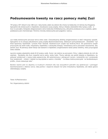 Starostwo Powiatowe w Kaliszu Podsumowanie kwesty na rzecz pomocy małej Zuzi 79 tysięcy 207 złotych oraz 186 euro taką kwotę udało się zebrać dla chorej na białaczkę 2,5-letniej Zuzi Bugajnej. Specjalnie dla dziewczynki w Opatówku zbudowano żywą szopkę, którą w Święta odwiedziło kilka tysięcy osób. U Zuzi na początku listopada zdiagnozowano ostra białaczkę limfoblastyczną, aktualnie przebywa ona w szpitalu, gdzie poddawana jest chemioterapii. Pomimo choroby dziewczynka jest pogodna i walczy. Los małej dziewczynki poruszył serca wielu ludzi. Charytatywną zbiórką zorganizowano w dość nietypowy sposób. Specjalnie na te okazję pobudowano żywą szopkę Bożonarodzeniową. Głównymi pomysłodawcami ,,Światełka’’ był Klub Sportowy Opatówek i prezes Piotr Stasiak. Budowniczym szopki był Andrzej Bruś. Do powstania szopki przyczyniło się wiele osób, mieszkańcy Opatówka z niezwykłą energią i otwartością serca pracowali nieustannie, aby pomóc Zuzi. W pierwszy dzień Świąt nad stawami w Opatówku zorganizowano także pokaz świetlny, który przyciągnął wielu widzów. Łącznie szopkę odwiedziło około 8-10 tysięcy osób. Zuzia i jej rodzice są wzruszeni, filmy i zdjęcia dotarły do nich do szpitala. Światełko dla Zuzi rozpaliło serca wielu, wielu ludzi. Tłumy zebrały się wokół stawów w Opatówku, by pokazać solidarność z naszą małą wojowniczką. 80 wolontariuszy z płonącymi racami, rozświetliło noc i przekazało Zuzi wiadomość – miłości i nadziei na zwycięstwo w walce z chorobą’’ – te słowa można przeczytać na facebookowym profilu ,,Zuzia nokautuje raka’’. Bardzo ważne jest to abyśmy w trudnych chwilach dla nas wszystkich potrafili się zjednoczyć i pomagać bezinteresownie z dobroci serca, taką pomoc i wsparcie okazali nie tylko mieszkańcy Opatówka, ale także goście odwiedzający szopkę. Tekst: N.Pleśnierowicz Fot. Organizatorzy zbiórki 1