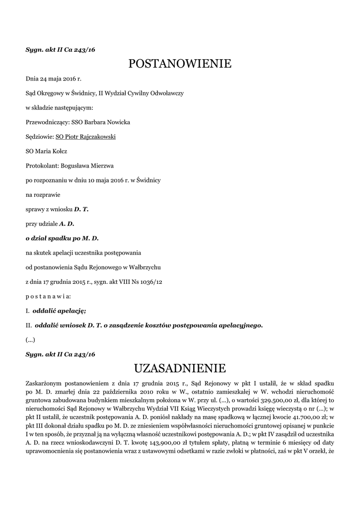 Sygn. akt II Ca 243/16 POSTANOWIENIE Dnia 24 maja 2016 r. Sąd Okręgowy w Świdnicy, II Wydział Cywilny Odwoławczy w składzie następującym: Przewodniczący: SSO Barbara Nowicka Sędziowie: SO Piotr Rajczakowski SO Maria Kołcz Protokolant: Bogusława Mierzwa po rozpoznaniu w dniu 10 maja 2016 r. w Świdnicy na rozprawie sprawy z wniosku D. T. przy udziale A. D. o dział spadku po M. D. na skutek apelacji uczestnika postępowania od postanowienia Sądu Rejonowego w Wałbrzychu z dnia 17 grudnia 2015 r., sygn. akt VIII Ns 1036/12 p o s t a n a w i a: I. oddalić apelację; II. oddalić wniosek D. T. o zasądzenie kosztów postępowania apelacyjnego. (...) Sygn. akt II Ca 243/16 UZASADNIENIE Zaskarżonym postanowieniem z dnia 17 grudnia 2015 r., Sąd Rejonowy w pkt I ustalił, że w skład spadku po M. D. zmarłej dnia 22 października 2010 roku w W., ostatnio zamieszkałej w W. wchodzi nieruchomość gruntowa zabudowana budynkiem mieszkalnym położona w W. przy ul. (...), o wartości 329.500,00 zł, dla której to nieruchomości Sąd Rejonowy w Wałbrzychu Wydział VII Ksiąg Wieczystych prowadzi księgę wieczystą o nr (...); w pkt II ustalił, że uczestnik postępowania A. D. poniósł nakłady na masę spadkową w łącznej kwocie 41.700,00 zł; w pkt III dokonał działu spadku po M. D. ze zniesieniem współwłasności nieruchomości gruntowej opisanej w punkcie I w ten sposób, że przyznał ją na wyłączną własność uczestnikowi postępowania A. D.; w pkt IV zasądził od uczestnika A. D. na rzecz wnioskodawczyni D. T. kwotę 143,900,00 zł tytułem spłaty, płatną w terminie 6 miesięcy od daty uprawomocnienia się postanowienia wraz z ustawowymi odsetkami w razie zwłoki w płatności, zaś w pkt V orzekł, że wnioskodawczyni i uczestnik postępowania poniosą po połowie koszty związane z postępowaniem, przy wzajemnym zniesieniu kosztów zastępstwa procesowego, pozostawiając szczegółowe wyliczenie kosztów referendarzowi. Sąd Rejonowy ustalił następujący stan faktyczny. Postanowieniem z dnia 19 grudnia 2011 r. Sąd Rejonowy w Wałbrzychu stwierdził, że spadek po M. D. zmarłej w dniu 22.10.2010n r. w W. nabyli na podstawie ustawy córka D. T. oraz syn A. D., każdy po 1/2 części. Nieruchomość stanowiąca współwłasność wnioskodawczyni i uczestnika jest położona w W. przy ul. (...) i stanowi działkę gruntu o wielkości 5.178 m2, zabudowanej budynkiem mieszkalnym o łącznej powierzchni użytkowej 283 m2. Parter o powierzchni 88,97 m2 zaś piętro o pow. 92,09 m2 oraz części wspólne o powierzchni 13,14 na kondygnacji parter i I piętro oraz piwnica w tym garaż o łącznej powierzchni 35,40 m2. Zgodnie z opinią biegłego z zakresu szacowania nieruchomości budynek mieszkalny może być podzielony na dwa lokale mieszkalne położne odpowiednio na parterze oraz I piętrze, z czego uczestnik miałby otrzymać lokal położony na I piętrze, który cały czas zajmuje, zaś wnioskodawczyni lokal położony na parterze. Wartość nieruchomości wynosi 329.000 zł, zaś wartość nakładów poczynionych przez uczestnika postępowania na nieruchomość wspólną zamyka się kwotą 41.700 zł. Między stronami dochodziło do bardzo poważnych konfliktów w czasie kiedy wnioskodawczyni wraz z synem mieszkała w nieruchomości jeszcze za życia matki stron. Do konfliktów dochodziło na tle rozliczania kosztów utrzymania nieruchomości, uczestnik postępowania nadużywał alkoholu i wszczynał awantury. Wnioskodawczyni w związku z zachowaniem uczestnika wyprowadziła się ze wspólnie zajmowanej nieruchomości i nabyła nieruchomość, na której zakup zaciągnęła kredyt hipoteczny. Po śmierci matki stron wnioskodawczyni czyniła starania mające na celu sprzedaż nieruchomości, jednak z uwagi na stanowisko uczestnika nie doszło do jej sprzedaży. Rozważając tak ustalony stan faktyczny Sąd Rejonowy uznał, że opinie sporządzone przez biegłych sądowych są szczegółowe i wyczerpujące dając im wiarę, zaś w zakresie relacji między stronami oparł się na zeznaniach świadka syna wnioskodawczyni oraz zeznaniach stron. Uczestnik bowiem w zasadzie nie kwestionował opisywanego przez świadka sposobu jego zachowania w nieruchomości wspólnej, stwierdzając jedynie, że ma trudny charakter. Rozważając sposób zniesienia współwłasności Sąd Rejonowy miał na względzie, że podział fizyczny nieruchomości, jako wskazany w pierwszej kolejności w art. 211 kc, jest preferowany przez ustawodawcę, jako najbardziej sprawiedliwy. Jednak ustalone orzecznictwo wskazuje na to, że może on mieć zastosowanie tylko kiedy strony pozostają w co najmniej poprawnych stosunkach, nie dochodzi między nimi do konfliktów i obie mieszkają na nieruchomości. Istniejący między współwłaścicielami budynku poważny konflikt może stanowić okoliczność uzasadniającą odmowę zniesienia współwłasności przez ustanowienie odrębnej własności lokali. Nie stanowi to wprawdzie bezwzględnej negatywnej przesłanki dla dokonania zniesienia współwłasności przez podział rzeczy, albowiem przepis nie wymienia stosunków osobistych między współwłaścicielami, jako czynnika limitującego taki podział, ale czynnik ten może i powinien być rozważany w aspekcie zgodności podziału rzeczy ze społecznogospodarczym jej przeznaczeniem i faktu, że z powodu poważnego skonfliktowania współwłaścicieli, rzecz nie będzie mogła być po podziale wykorzystywana w sposób odpowiadający jej przeznaczeniu. Uwzględnienie całokształtu okoliczności faktycznych występujących w konkretnym przypadku, może uzasadniać odstąpienie przez sąd od jej fizycznego podziału na rzecz przyznania rzeczy jednemu ze współwłaścicieli, z obowiązkiem spłaty na rzecz drugiego współwłaściciela. Sąd Rejonowy wskazał, że niewątpliwie między stronami istnieje bardzo poważny konflikt, którego konsekwencją było wyprowadzenie się przez wnioskodaw