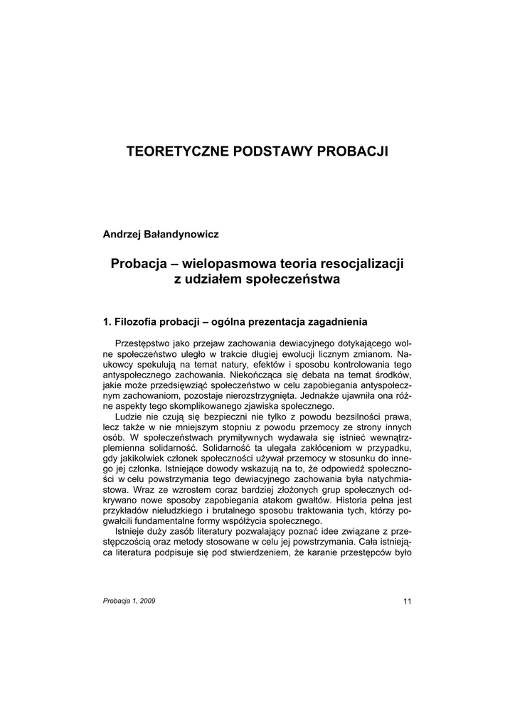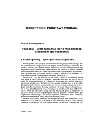 Probacja – wielopasmowa teoria resocjalizacji... TEORETYCZNE PODSTAWY PROBACJI Andrzej Bałandynowicz Probacja – wielopasmowa teoria resocjalizacji z udziałem społeczeństwa 1. Filozofia probacji – ogólna prezentacja zagadnienia Przestępstwo jako przejaw zachowania dewiacyjnego dotykającego wolne społeczeństwo uległo w trakcie długiej ewolucji licznym zmianom. Naukowcy spekulują na temat natury, efektów i sposobu kontrolowania tego antyspołecznego zachowania. Niekończąca się debata na temat środków, jakie może przedsięwziąć społeczeństwo w celu zapobiegania antyspołecznym zachowaniom, pozostaje nierozstrzygnięta. Jednakże ujawniła ona różne aspekty tego skomplikowanego zjawiska społecznego. Ludzie nie czują się bezpieczni nie tylko z powodu bezsilności prawa, lecz także w nie mniejszym stopniu z powodu przemocy ze strony innych osób. W społeczeństwach prymitywnych wydawała się istnieć wewnątrzplemienna solidarność. Solidarność ta ulegała zakłóceniom w przypadku, gdy jakikolwiek członek społeczności używał przemocy w stosunku do innego jej członka. Istniejące dowody wskazują na to, że odpowiedź społeczności w celu powstrzymania tego dewiacyjnego zachowania była natychmiastowa. Wraz ze wzrostem coraz bardziej złożonych grup społecznych odkrywano nowe sposoby zapobiegania atakom gwałtów. Historia pełna jest przykładów nieludzkiego i brutalnego sposobu traktowania tych, którzy pogwałcili fundamentalne formy współżycia społecznego. Istnieje duży zasób literatury pozwalający poznać idee związane z przestępczością oraz metody stosowane w celu jej powstrzymania. Cała istniejąca literatura podpisuje się pod stwierdzeniem, że karanie przestępców było Probacja 1, 2009 11 A. Bałandynowicz szczególną mieszaniną zemsty, fizycznego powstrzymywania oraz krępowania, a także reformowania. Najwcześniejsze formy kar nakładane przez zorganizowane społeczeństwo na przestępców miały za zadanie eliminację przestępcy oraz jego powstrzymanie, aby więcej nie zagrażał społeczeństwu. Uciekano się głównie do metod wygnania i transportacji. W dobie racjonalizmu w późnym XVIII i wczesnym XIX wieku struktura wyroków uległa zmianie. Niewielka liczba przestępstw wymagała kar cielesnych, podczas gdy większość przestępców posyłano do wiezienia. To przejście od barbarzyńskich metod karania do prewencyjnych (więzienie) zapoczątkowane zostało przez Beccaria i Benthama. W XIX wieku zapoczątkowano programy mające na celu resocjalizację przestępców w więzieniach w oparciu o autonomię i godność skazanego oraz z zachowaniem praw osób uwięzionych. Wraz z postępem nauki i technologii oraz rozwojem industrializacji powstało wiele czynników powodujących dezorganizację społeczeństwa, przyczyniając się tym samym do wzrostu przestępczości. Przeważnie były to drobne przestępstwa, zaś więzienia przepełnione były drobnymi przestępcami, których wyroki były zbyt krótkie, by rozpocząć działalność resocjalizacyjną. Ich krótki pobyt w więzieniach stanowił raczej problem dla zarządzających więzieniami, gdyż klasyfikacja była znacznie utrudniona oraz powstawały nowe grupy przestępców, np. recydywistów. W późnym okresie XIX wieku nowe kierunki w dziedzinie resocjalizacji zmieniły pojęcia przestępczości i kryminologii. Przestępstwa i wykroczenia popełniane przez osoby uznano za oznakę porażki i dezorganizacji społeczeństwa oraz samego sprawcy. Pozbawienie przestępców kontaktu z instytucjami społecznymi, które mogły być pomocne w doprowadzeniu ich na właściwą drogę, uznano za szczególny przejaw takiej porażki, a zatem sposób resocjalizacji postrzegano jako ofertę więzi przestępcy ze społeczeństwem, integracji społecznej, odbudowę więzi rodzinnych, zdobywanie wykształcenia i zatrudnienia, zabezpieczenie na dłuższy okres, znalezienie miejsca pracy dla przestępcy w wolnym społeczeństwie. Działanie takie powinno obejmować nie tylko zmianę przestępcy, na którym ogniskowały się dotychczas wszelkie wysiłki, ale również zmianę całego społeczeństwa i jego instytucji. Nadając kształt praktyczny przedstawionej filozofii traktowania przestępców, główny nacisk kładzie się obecnie na jak największe wykorzystanie resocjalizacji wspierającej w otwartym społeczeństwie. Dzieje się tak dlatego, że instytucje opiekuńcze praktycznie nie mają dostępu do programów resocjalizacyjnych, profesjonalnej obsługi i publicznego wsparcia. Dlatego program resocjalizacyjny w oparciu o społeczeństwo stanowi alternatywę dla programów instytucjonalnych. 12 Probacja 1, 2009 Probacja – wielopasmowa teoria resocjalizacji... Nie ma prostej definicji resocjalizacji w oparciu o społeczeństwo. Jest to raczej filozoficzne podejście do ludzkiego traktowania sprawców przestępstw, stosunkowo nowe podejście w zakresie organizacji działań. Resocjalizację w oparciu o społeczeństwo definiowano jako całość działań opiekuńczych, wychowawczych i terapeutycznych, które zachodzą w społeczeństwie. Definicja ta wydaje się jednak zbyt wąska. Operowanie jedynie programem resocjalizacji w społeczeństwie bez jego znaczącego udziału sprawia, że program ten jest raczej na społeczeństwo zorientowany niż o nie oparty. Resocjalizacja w oparciu o społeczeństwo obejmuje każde działanie mające na celu pomoc sprawcy przestępstwa w powrocie na drogę prawa. Definicja ta nie identyfikuje jednak kryteriów i założeń pozwalających rozróżnić programy resocjalizacyjne oparte o społeczeństwo od innego typu programów. Jest zatem równie wąska i równie statyczna jak poprzednia. Mówiąc szerzej, program resocjalizacji w oparciu o społeczeństwo jest tym, co wpływa na więzi między sprawcą a społecznością lokalną, tj. prawdziwym zaangażowaniem przestępcy w powiązania lokalne, które wytwarzają dobra i usługi wy