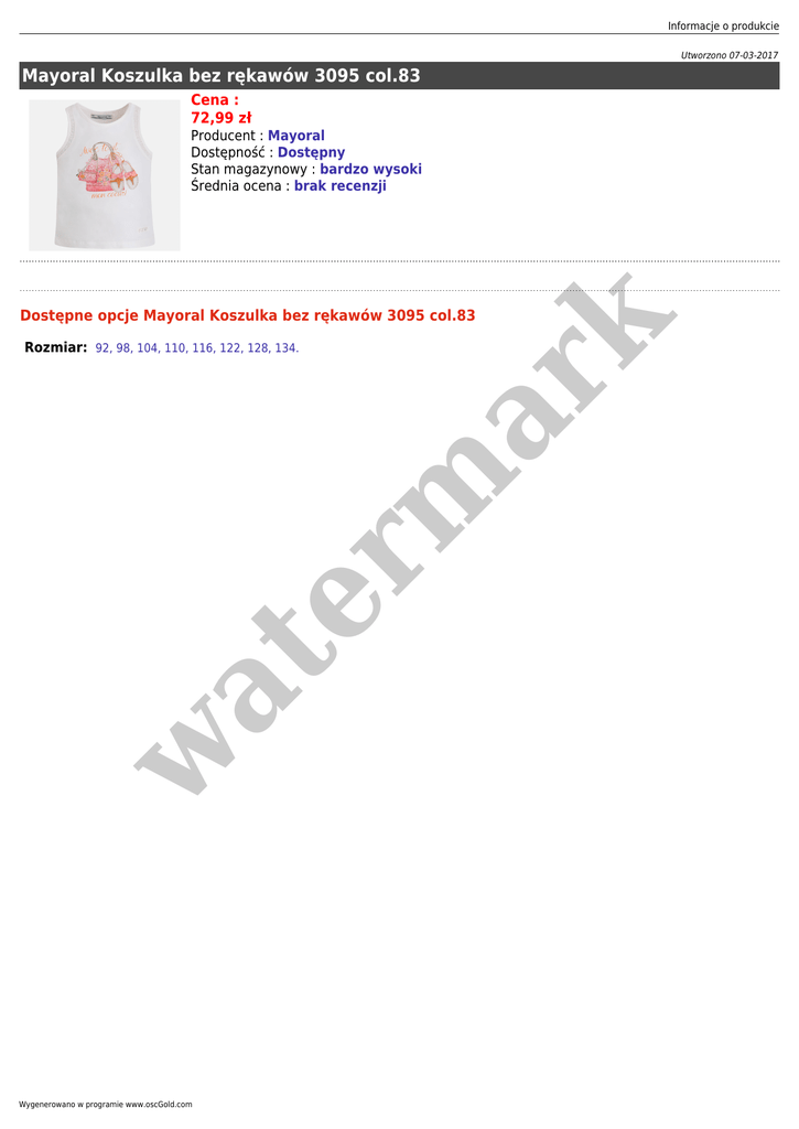 Informacje o produkcie Utworzono 07-03-2017 Mayoral Koszulka bez rękawów 3095 col.83 Cena : 72,99 zł Producent : Mayoral Dostępność : Dostępny Stan magazynowy : bardzo wysoki Średnia ocena : brak recenzji er m ar k Dostępne opcje Mayoral Koszulka bez rękawów 3095 col.83 w at Rozmiar: 92, 98, 104, 110, 116, 122, 128, 134. Wygenerowano w programie www.oscGold.com