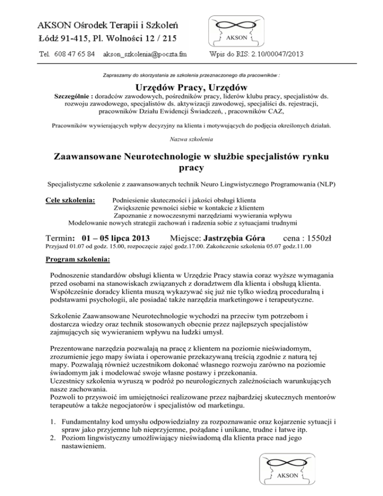Zapraszamy do skorzystania ze szkolenia przeznaczonego dla pracowników : Urzędów Pracy, Urzędów Szczególnie : doradców zawodowych, pośredników pracy, liderów klubu pracy, specjalistów ds. rozwoju zawodowego, specjalistów ds. aktywizacji zawodowej, specjaliści ds. rejestracji, pracowników Działu Ewidencji Świadczeń, , pracowników CAZ, Pracowników wywierających wpływ decyzyjny na klienta i motywujących do podjęcia określonych działań. Nazwa szkolenia Zaawansowane Neurotechnologie w służbie specjalistów rynku pracy Specjalistyczne szkolenie z zaawansowanych technik Neuro Lingwistycznego Programowania (NLP) Cele szkolenia: Podniesienie skuteczności i jakości obsługi klienta Zwiększenie pewności siebie w kontakcie z klientem Zapoznanie z nowoczesnymi narzędziami wywierania wpływu Modelowanie nowych strategii zachowań i radzenia sobie z sytuacjami trudnymi Termin: 01 – 05 lipca 2013 Miejsce: Jastrzębia Góra cena : 1550zł Przyjazd 01.07 od godz. 15.00, rozpoczęcie zajęć godz.17.00. Zakończenie szkolenia 05.07 godz.11.00 Program szkolenia: Podnoszenie standardów obsługi klienta w Urzędzie Pracy stawia coraz wyższe wymagania przed osobami na stanowiskach związanych z doradztwem dla klienta i obsługą klienta. Współcześnie doradcy klienta muszą wykazywać się już nie tylko wiedzą proceduralną i podstawami psychologii, ale posiadać także narzędzia marketingowe i terapeutyczne. Szkolenie Zaawansowane Neurotechnologie wychodzi na przeciw tym potrzebom i dostarcza wiedzy oraz technik stosowanych obecnie przez najlepszych specjalistów zajmujących się wywieraniem wpływu na ludzki umysł. Prezentowane narzędzia pozwalają na pracę z klientem na poziomie nieświadomym, zrozumienie jego mapy świata i operowanie przekazywaną treścią zgodnie z naturą tej mapy. Pozwalają również uczestnikom dokonać własnego rozwoju zarówno na poziomie świadomym jak i modelować swoje własne postawy i przekonania. Uczestnicy szkolenia wyruszą w podróż po neurologicznych zależnościach warunkujących nasze zachowania. Pozwoli to przyswoić im umiejętności realizowane przez najbardziej skutecznych mentorów terapeutów a także negocjatorów i specjalistów od marketingu. 1. Fundamentalny kod umysłu odpowiedzialny za rozpoznawanie oraz kojarzenie sytuacji i spraw jako przyjemne lub nieprzyjemne, pożądane i unikane, trudne i łatwe itp. 2. Poziom lingwistyczny umożliwiający nieświadomą dla klienta prace nad jego nastawieniem. 3. Zmiana nawykowych reakcji i zachowań pozwalająca uzyskać większy komfort w sytuacjach trudnych w obsłudze klienta. Zaawansowana technika terapeutyczna. 4. Jak zwiększyć swoją motywację do wykonywania obowiązków i robić je z uśmiechem. Moja praca może być dla mnie przyjemnością. 5. Jak myśleć żeby problem stał się błahostką. Nieuświadomiony mechanizm budowania uprzedzeń i przekonań. Możesz to zmienić w każdej chwili. 6. Analiza kontrastowa na poziomie lingwistycznym – kilka słów zmieniających nieświadome procesy. 7. Zrozumieć klienta w konflikcie. Zarządzanie punktem widzenia przyspiesza znalezienie konstruktywnych rozwiązań. 8. Sposób na łatwe pozyskanie nowych zasobów od osób które są w czymś wyjątkowo dobre – na poziomie neurologicznym już to wiesz. Znaczenie neuronów lustrzanych. 9. Modelowanie „obrazu siebie” –jak uzyskać większą pewności siebie i skuteczność. 10. Szybki dostęp do potrzebnych w danym momencie uczuć, emocji, takich jak poczucie autorytetu, opanowanie, relaks czy motywacja. Skoro podnosisz swoją satysfakcję i kompetencje oraz znasz powyższe techniki nie tylko zwiększasz swoją skuteczność, zwiększasz także zapał do swoich zadań, a wypalenie zawodowe po prostu traci rację bytu. To szkolenie skutkuje także zrozumieniem wielu mechanizmów sterujących zachowaniem ludzi. NLP daje ci dostęp do bardzo skutecznych technik bazujących na podstawowych zasadach pracy ludzkiego umysłu i mózgu. Do Polski NLP dotarło w połowie lat 90tych i błyskawicznie zostało zaadoptowane do terapii, biznesu, marketingu, reklamy, polityki, negocjacji.... i właściwie wszędzie tam gdzie ludzie wywierają wpływ na swoich klientów, słuchaczy, kontrahentów itp. Jak myślisz czemu tak się stało? Skuteczność tych technik polega głównie na tym, że omijają tzw. opór klienta i wydaje mu się, że to on sam dokonuje wyboru. Już czas abyś poznał je także ty, zwłaszcza że niebagatelnie mogą wpłynąć na twoją pracę, a ty na swoich klientów. Zapraszamy. Cena szkolenia od uczestnika, zawiera udział w zajęciach dydaktycznych, koszt wyżywienia i zakwaterowania - w pokojach 2 lub 3 osobowych, materiały do zajęć- w formie drukowanych papierowych skryptów.). Za zakwaterowanie w pokoju 1 osobowym przez czas szkolenia, dopłata 200 zł do ceny szkolenia. Możliwość dodania do ceny szkolenia kosztów podróży – ustalane telefonicznie. Zniżki przy zgłoszeniu powyżej 3 osób z Urzędu, ustalane telefonicznie. Informacje i zapisy: 608 47 65 84 [email protected]
