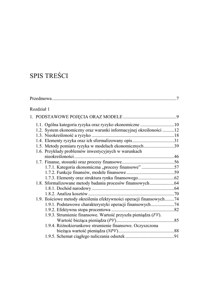 Spis treści 3 SPIS TREŚCI Przedmowa ...........................................................................................................7 Rozdział 1 1. PODSTAWOWE POJĘCIA ORAZ MODELE ..............................................9 1.1. 1.2. 1.3. 1.4. 1.5. 1.6. Ogólna kategoria ryzyka oraz ryzyko ekonomiczne .............................10 System ekonomiczny oraz warunki informacyjnej określoności ..........12 Nieokreśloność a ryzyko .......................................................................18 Elementy ryzyka oraz ich sformalizowany opis ....................................31 Metody pomiaru ryzyka w modelach ekonomicznych ..........................39 Przykłady problemów inwestycyjnych w warunkach nieokreśloności ......................................................................................46 1.7. Finanse, stosunki oraz procesy finansowe .............................................56 1.7.1. Kategoria ekonomiczna „procesy finansowe” ............................57 1.7.2. Funkcje finansów, modele finansowe .........................................59 1.7.3. Elementy oraz struktura rynku finansowego ...............................62 1.8. Sformalizowane metody badania procesów finansowych .....................64 1.8.1. Dochód narodowy .......................................................................64 1.8.2. Analiza kosztów ..........................................................................70 1.9. Ilościowe metody określenia efektywności operacji finansowych ........74 1.9.1. Podstawowe charakterystyki operacji finansowych ....................74 1.9.2. Efektywna stopa procentowa ......................................................82 1.9.3. Strumienie finansowe. Wartość przyszła pieniądza (FV). Wartość bieŜąca pieniądza (PV)..................................................85 1.9.4. RóŜnokierunkowe strumienie finansowe. Oczyszczona bieŜąca wartość pieniądza (NPV) ................................................88 1.9.5. Schemat ciągłego naliczania odsetek ..........................................91 4 Spis treści Rozdział 2 2. PROCESY RYZYKA W MODELACH UBEZPIECZENIOWYCH ........... 95 2.1. Wyliczenia aktuarialne oraz taryfy ubezpieczeniowe ...........................96 2.1.1. Istota oraz zadania wyliczeń .......................................................97 2.1.2. Premie ubezpieczeniowe .............................................................99 2.1.3. Taryfy ubezpieczeniowe, zasady określenia oraz polityka taryfowa.....................................................................................103 2.2. Strumienie finansowe w modelach ubezpieczeniowych. Renty finansowe.............................................................................................106 2.2.1. Renty typu annuity ....................................................................107 2.2.2. Renty p-terminowe ....................................................................109 2.2.3. Renty zmienne ...........................................................................111 2.2.4. (p, q)-zmienne renty ..................................................................114 2.2.5. Renty z ciągłym strumieniem wypłat ........................................119 2.3. Matematyczne modele opisu trwałości Ŝycia ......................................123 2.3.1. Funkcja przeŜycia......................................................................125 2.3.2. Intensywność umieralności .......................................................128 2.3.3. Przyszły czas Ŝycia ....................................................................131 2.3.4. Zaokrąglony czas Ŝycia oraz ułamkowa jego część ..................136 2.3.5. Tablice trwałości Ŝycia ..............................................................145 2.4. Podstawowe zasady określenia netto-premii .......................................150 2.4.1. Matematyczne metody analizy modeli ubezpieczeń krótkoterminowych ...................................................................151 2.4.2. PrzybliŜone metody określenia prawdopodobieństwa zbankrutowania .........................................................................155 2.4.3. Analiza modeli ubezpieczeń długoterminowych ......................161 2.4.4. Przykłady wyliczeń aktuarialnych ............................................169 2.5. Renty ubezpieczeniowe, wartość annuitetów ubezpieczeniowych......177 2.6. Komutacyjne funkcje...........................................................................185 2.7. Matematyczne modele analizy ryzyka ubezpieczeniowego ................191 2.7.1. Ustrukturowane oraz randomizowane modele pozwów indywidualnych .........................................................................192 2.7.2. Ciągłe modele pozwów indywidualnych ..................................196 2.7.3. Proces Poissona oraz jego własności ........................................201 2.7.4. Dynamiczny model ryzyka indywidualnego .............................210 2.8. Sterowanie ryzykiem w modelach ubezpieczeniowych ......................222 2.8.1. Podstawowe metody sterowania ryzykiem ...............................222 2.8.2. Reubezpieczenie proporcjonalnego typu dla statycznego modelu .......................................................................................226 2.8.3. Reubezpieczenie dla modelu dynamicznego .............................230 Spis treści 5 Rozdział 3 3. PROCESY RYZYKA W MODELACH MATEMATYKI FINANSOWEJ ............................................................................................235 3.1. Ryzyko portfela oraz portfel optymalny ..............................................236 3.1.1. Problem optymalnego wyboru portfela papierów wartościowych...........................................................................237 3.1.2. Model Markowitza ....................................................................248 3.1.3. Model Tobina