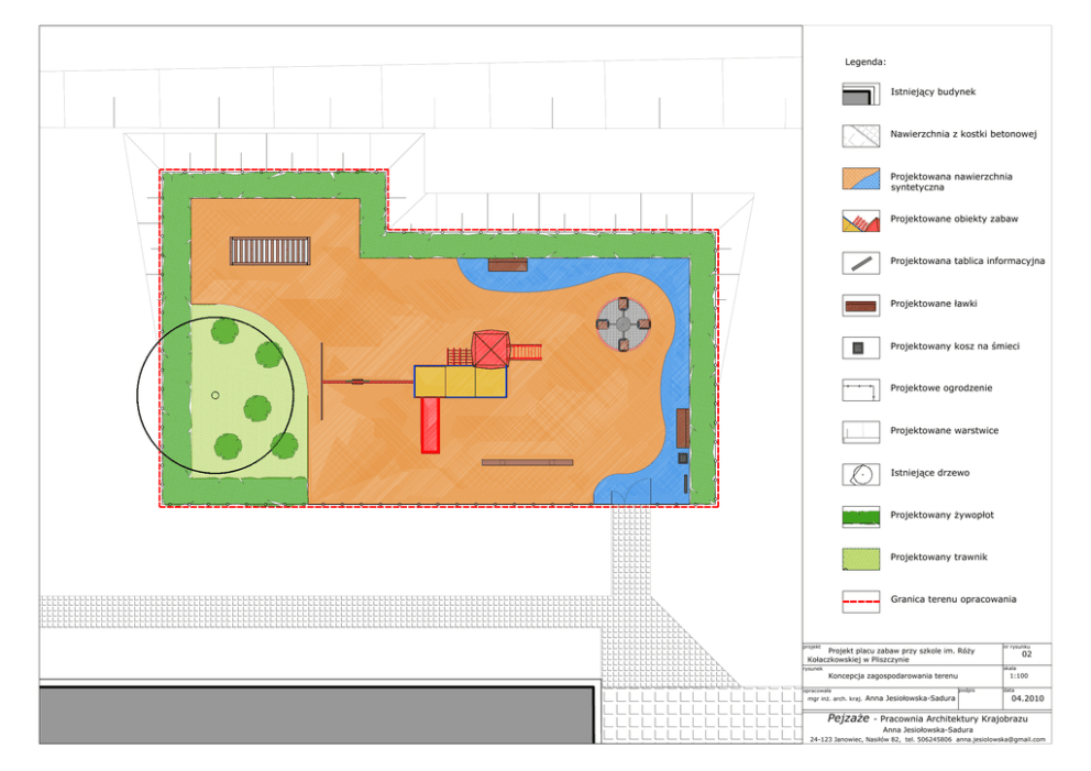 Legenda: Nawierzchnia z kostki betonowej 5 Projektowana nawierzchnia syntetyczna 10 . Projektowane obiekty zabaw Projektowana tablica informacyjna Projektowe ogrodzenie Projektowane warstwice Projektowany trawnik Granica terenu opracowania projekt nr rysunku 02 skala rysunek Koncepcja zagospodarowania terenu 1:100 podpis data 04.2010 - Pracownia Architektury Krajobrazu