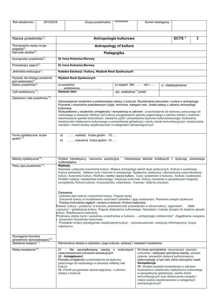 Rok akademicki: Grupa przedmiotów: 2015/2016 Nazwa przedmiotu1): podstawowe Numer katalogowy: ECTS 2) Antropologia kulturowa Tłumaczenie nazwy na jęz. angielski3): Kierunek studiów4): 3 Antropology of kulture Pedagogika 5) Dr Irena Kotowicz-Borowy Koordynator przedmiotu : 6) Prowadzący zajęcia : Dr Irena Kotowicz-Borowy 7) Jednostka realizująca : Katedra Edukacji i Kultury, Wydział Nauk Społecznych Wydział, dla którego przedmiot jest realizowany8): Status przedmiotu9): Wydział Nauk Społecznych 10) Cykl dydaktyczny : a) przedmiot ……podstawowy…………………. Semestr letni b) stopień SM……. rok I…… c) niestacjonarne 11) Jęz. wykładowy :polski Założenia i cele przedmiotu12): Wprowadzenie studentów w problematykę wiedzy o kulturze. Rozróżnianie kierunków i nurtów w antropologii. Poznanie i rozumienie podstawowych pojęć, terminów, kategorii oraz źródeł wiedzy z zakresu antropologii kulturowej. Wykształcenie u studentów umiejętności i kompetencji w zakresie : przechodzenia od dyskursu potocznego do naukowego w obszarze refleksji nad kulturą; przygotowania aparatu pojęciowego z zakresu wiedzy o kulturze; obserwowania zjawisk kulturalnych; stawiania pytań i prowadzenia dyskursu kulturoznawczego; budowania świadomości relatywizmu kulturowego w perspektywie globalizacji i zaniku barier komunikacyjnych; dostarczania narzędzi i metod analizy współczesności w kategoriach antropologicznych Formy dydaktyczne, liczba godzin13): Metody dydaktyczne14): a) ………wykłady liczba godzin . 10...... b) ………ćwiczenia liczba godzin .10...... Wykład interaktywny, ćwiczenia audytoryjne : interpretacja tekstów źródłowych z dyskusją, prezentacja multimedialna Wykłady Naukowe i potoczne rozumienie kultury. Miejsce antropologii wśród nauk społecznych. Kultura a cywilizacja. Kultury pierwotne. Główne nurty i kierunki w antropologii. Społeczne, polityczne i ekonomiczne uwarunkowania kultury. Autonomia kultury. Wartości, normy i wzory kultury. Czas i przestrzeń w kulturze.. Kultura i osobowość. Problem tradycji i dziedzictwa kulturowego. Instytucje kulturowe. Kultury narodowe w perspektywie integracji europejskiej. Kultura ludowa, mieszczańska, szlachecka , masowa i elitarna (wysoka). Pełny opis przedmiotu15): Ćwiczenia Człowiek jako twórca i konsument kultury, Pojęcie osoby Znaczenie kultury w kształtowaniu zachowań człowieka i jego osobowości. Pierwotne związki społeczne Procesy kulturalnej-ciągłość i zmiana w kulturze .Kultura tradycyjna ProRozwój” kultury i „przełomy” w kulturze, prawomocność przewidywań w sferze kultury, regionalizm. „Małe Mał ojczyzny” i globalizacja kultury .Pojęcie relatywizmu kulturowego. Narzedzia i metody służące do badania zjawisk kkkkultury. Współczesne subkultury. . PrPrzemiany stylów życia i sposobów uczestnictwa w kulturze – „antropologia codzienności” .Zagadnienia związane zzzz poczuciem tożsamości kulturowej. Przesłanki zmiany paradygmatu współczesnej kultury – ponowoczesność, rewolucja informatyczna, kryzys scjentyzmu. Wymagania formalne (przedmioty wprowadzające)16): Założenia wstępne17): 18) Efekty kształcenia : Elementarna wiedza o człowieku i jego kulturze, edukacji i metodach kształcenia 01 – Ma uporządkowaną wiedzę o kulturowych uwarunkowaniach procesów edukacyjnych 02- -Umiejętności: Posiada umiejętność przechodzenia od dyskursu potocznego do naukowego w obszarze refleksji nad kulturą 03- Potrafi przygotować aparat pojęciowy z zakresu wiedzy o kulturze 04.Umie samodzielnie obserwować zjawiska kulturalne i zdobywać potrzebną wiedzę, stawiać pytania i prowadzić dyskurs kulturoznawczy wykorzystując w tym celu różne dyscypliny nauki Kompetencje 05- Student posiada kompetencje w zakresie budowania ś wiadomości relatywizmu kulturowego w perspektywie globalizacji i zaniku barier komunikacyjnych oraz dostarczania narzędzi i metod analizy współczesności w kategoriach antropologicznych …- Sposób weryfikacji efektów kształcenia19): Efekty:01,02,03,04;05;;Praca pisemna z prezentacją przygotowana w ramach pracy własnej ,karta oceny studenta Forma dokumentacji osiągniętych efektów kształcenia 20): Elementy i wagi mające wpływ na ocenę końcową21): Miejsce realizacji zajęć22): Praca pisemna z prezentacją na płycie CD, karta oceny studenta Praca pisemna z prezentacją, aktywność na zajęciach,(karta oceny studenta),obecność na zajęciach Sala dydaktyczna Literatura podstawowa i uzupełniająca23): .1. E. Nowicka, Świat człowieka-świat kultury, PWN, Warszawa 2007 2.A. Mencwel, (red)Antropologia kultury. Zagadnienia i wybór tekstów, cz.I, wyd., Uniwersytetu Warszawskiego, Warszawa 2001 3.B.Olszewska-Dyoniziak,Człowiek-kultura-osobowość.Wstęp do klasycznej antropologii kulturowej,wyd.atla2,Wrocław 2002 4.R.Sulima,Antropologia współczesności, wyd. U .J., Kraków 2000. 5.Gerardus Van der Leeuw - Fenomenologia religii, wyd. Książka i Wiedza, Warszawa 2004 6.B.Malinowski,Kultura i jej przemiany. Dzieła T.9.,wyd.PWN,Warszawa 2011 7.R.Benedict,Wzory kultury, wyd. Muza, Warszawa 2011 Literatura uzup.: 1.Z.Bauman .Globalizacja. wyd. PIW, Warszawa 2000 2.J.Nikitorowicz,M.Sobecki,D.Misiejuk(red)Kultury tradycyjne a kultura globalna, konteksty edukacji między kulturowej, T.II, wyd. Trans Humana, Białystok 2001 3.W.Burszta, Różnorodność i tożsamość. Antropologia jako kulturowa refleksyjność, wyd. Poznańskie, Poznań 2004 4.A.Skudrzyk,K.Urban,Małe ojczyzny. Świadomość językowo-kulturowa społeczności lokalnych, wyd. WW, Katowice 2010 5.S.Castles,M.Miller,Migracje we współczesnym świecie”, wyd. PWN, Warszawa 2011 UWAGI24): Wskaźniki ilościowe charakteryzujące moduł/przedmiot 25) : Szacunkowa sumaryczna liczba godzin pracy studenta (kontaktowych i pracy własnej) niezbędna dla osiągnięcia zakładanych 75. h efektów kształcenia18) - na tej podstawie należy wypełn