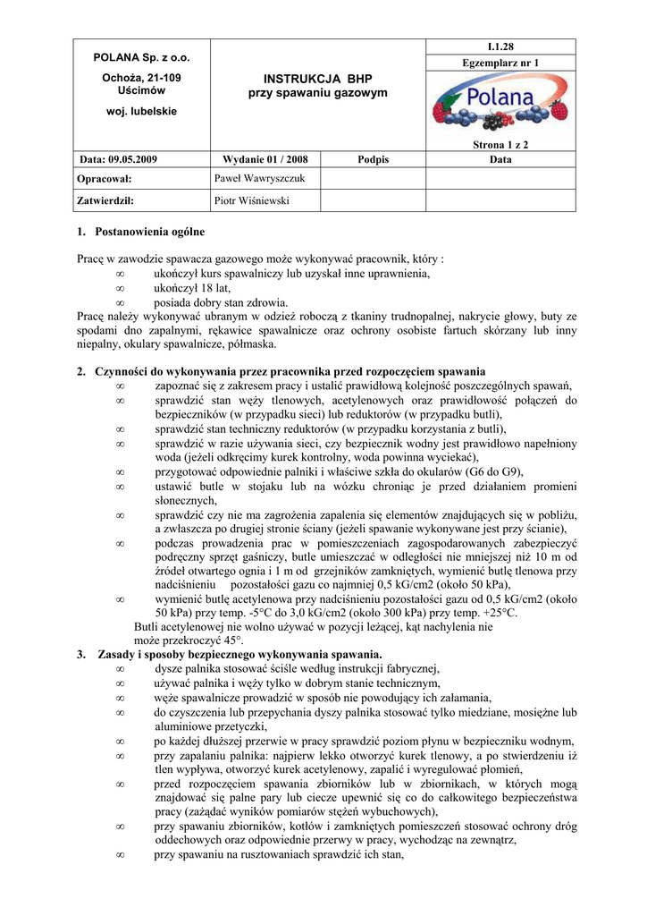 I.1.28 Egzemplarz nr 1 POLANA Sp. z o.o. OchoŜa, 21-109 Uścimów INSTRUKCJA BHP przy spawaniu gazowym woj. lubelskie Data: 09.05.2009 Wydanie 01 / 2008 Opracował: Paweł Wawryszczuk Zatwierdził: Piotr Wiśniewski Podpis Strona 1 z 2 Data 1. Postanowienia ogólne Pracę w zawodzie spawacza gazowego moŜe wykonywać pracownik, który : • ukończył kurs spawalniczy lub uzyskał inne uprawnienia, • ukończył 18 lat, • posiada dobry stan zdrowia. Pracę naleŜy wykonywać ubranym w odzieŜ roboczą z tkaniny trudnopalnej, nakrycie głowy, buty ze spodami dno zapalnymi, rękawice spawalnicze oraz ochrony osobiste fartuch skórzany lub inny niepalny, okulary spawalnicze, półmaska. 2. Czynności do wykonywania przez pracownika przed rozpoczęciem spawania • zapoznać się z zakresem pracy i ustalić prawidłową kolejność poszczególnych spawań, • sprawdzić stan węŜy tlenowych, acetylenowych oraz prawidłowość połączeń do bezpieczników (w przypadku sieci) lub reduktorów (w przypadku butli), • sprawdzić stan techniczny reduktorów (w przypadku korzystania z butli), • sprawdzić w razie uŜywania sieci, czy bezpiecznik wodny jest prawidłowo napełniony woda (jeŜeli odkręcimy kurek kontrolny, woda powinna wyciekać), • przygotować odpowiednie palniki i właściwe szkła do okularów (G6 do G9), • ustawić butle w stojaku lub na wózku chroniąc je przed działaniem promieni słonecznych, • sprawdzić czy nie ma zagroŜenia zapalenia się elementów znajdujących się w pobliŜu, a zwłaszcza po drugiej stronie ściany (jeŜeli spawanie wykonywane jest przy ścianie), • podczas prowadzenia prac w pomieszczeniach zagospodarowanych zabezpieczyć podręczny sprzęt gaśniczy, butle umieszczać w odległości nie mniejszej niŜ 10 m od źródeł otwartego ognia i 1 m od grzejników zamkniętych, wymienić butlę tlenowa przy nadciśnieniu pozostałości gazu co najmniej 0,5 kG/cm2 (około 50 kPa), • wymienić butlę acetylenowa przy nadciśnieniu pozostałości gazu od 0,5 kG/cm2 (około 50 kPa) przy temp. -5°C do 3,0 kG/cm2 (około 300 kPa) przy temp. +25°C. Butli acetylenowej nie wolno uŜywać w pozycji leŜącej, kąt nachylenia nie moŜe przekroczyć 45°. 3. Zasady i sposoby bezpiecznego wykonywania spawania. • dysze palnika stosować ściśle według instrukcji fabrycznej, • uŜywać palnika i węŜy tylko w dobrym stanie technicznym, • węŜe spawalnicze prowadzić w sposób nie powodujący ich załamania, • do czyszczenia lub przepychania dyszy palnika stosować tylko miedziane, mosięŜne lub aluminiowe przetyczki, • po kaŜdej dłuŜszej przerwie w pracy sprawdzić poziom płynu w bezpieczniku wodnym, • przy zapalaniu palnika: najpierw lekko otworzyć kurek tlenowy, a po stwierdzeniu iŜ tlen wypływa, otworzyć kurek acetylenowy, zapalić i wyregulować płomień, • przed rozpoczęciem spawania zbiorników lub w zbiornikach, w których mogą znajdować się palne pary lub ciecze upewnić się co do całkowitego bezpieczeństwa pracy (zaŜądać wyników pomiarów stęŜeń wybuchowych), • przy spawaniu zbiorników, kotłów i zamkniętych pomieszczeń stosować ochrony dróg oddechowych oraz odpowiednie przerwy w pracy, wychodząc na zewnątrz, • przy spawaniu na rusztowaniach sprawdzić ich stan, I.1.28 Egzemplarz nr 1 POLANA Sp. z o.o. OchoŜa, 21-109 Uścimów INSTRUKCJA BHP przy spawaniu gazowym woj. lubelskie Data: 09.05.2009 Wydanie 01 / 2008 Opracował: Paweł Wawryszczuk Zatwierdził: Piotr Wiśniewski • Podpis Strona 2 z 2 Data przy spawaniu na wysokości stosować się do przepisów o wykonywaniu prac na wysokości. 4. Czynności zakazane spawaczowi : • stosowanie butli tlenowej umieszczonej w pozycji leŜąc (dopuszcza. nachylenie do 45°), • zatłuszczanie butli tlenowych, reduktorów i zaworów, • uŜywanie nieszczelnych butli, reduktorów lub palników, • przedłuŜania węŜy bez właściwych łuczników metalowych, • stosowania węŜy krótszych niŜ 5 m, • umieszczania butli na rusztowaniach, • toczenia poziomo, przewracania lub uderzania w butle z gazami, • odkładania zapalonego palnika lub wypuszczania z rąk (palnik naleŜy zgasić lub odłoŜyć na odpowiednią podstawkę), • pozostawiania palnika pod ciśnieniem w razie długiej przerwy w pracy (naleŜy odłączyć przewody od sieci reduktora), • umieszczania węŜy spawalniczych na plecach i ramieniu, • uŜywania w zbiornikach oświetlenia miejscowego napięcie wyŜsze niŜ 24 V, • samodzielnego naprawiania palników i reduktorów, • stosowania węŜy do gazów, dla których nie są przeznaczone, • stosowania tlenu oraz gazów palnych do napędu narzędzi pneumatycznych . 5. Podstawowe czynności spawacza po zakończeniu pracy. Zgasić palnik: a) zamknąć kurek acetylenu, b) zamknąć kurek tlenu, c) poluzować śruby nastawcze reduktorów, d) zamknąć zawory w butlach, e) otworzyć kurki na palniku po ustaniu wypływu gazów, zamknąć kurki na palniku i zdjąć reduktory z butli, • sprawdzić czy w pobliŜu stanowiska pracy nie został zaprószony ogień, • uporządkować stanowisko pracy i sprzęt, • węŜe, palniki i reduktory umieścić w wyznaczonym miejscu, • zgłosić przełoŜonemu zakończenie spawania. • Bezpieczniki (wodne lub suche) uŜywać tylko dopuszczone przez Dozór Techniczny, zgodnie z ich charakterystyką. • Bezpieczniki wodne w okresie zimowym naleŜy napełnić płynem niezamarzającym. • Posługiwać się reduktorem zgodnie z instrukcją producenta. • W razie cofnięcia się płomienia naleŜy niezwłocznie zamknąć kolejno: zawory palnika do acetylenu a następnie tlenu, a palnik zanurzyć w wodzie. Gdy palnik jest zimny, a węŜe nieuszkodzone, naleŜy przedmuchać węŜe i palnik i ponownie zapalić. • Cięcie wewnątrz zbiorników, kotłów lub innych zamkniętych pomieszczeń (do 15m3) naleŜy przeprowadzać przy asekuracji przez drugiego pracownika przebywającego na z