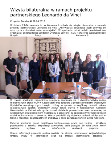 Wizyta bilateralna w ramach projektu partnerskiego Leonardo da Vinci Krzysztof Derebecki 28.04.2015 W dniach 23-24 kwietnia br. w Katowicach odbyła się wizyta bilateralna w ramach projektu partnerskiego Leonardo da Vinci „Aktywizacja zawodowa osób powyżej 50 roku życia – doświadczenia europejskie". W spotkaniu udział wzięli przedstawiciele organizacji pozarządowej Solidarity Overseas Service – SOS Malta oraz Wojewódzkiego Urzędu Pracy w Katowicach. W trakcie spotkania zagraniczna delegacja zapoznała się z charakterystyką zadań realizowanych przez WUP w Katowicach oraz spotkała z przedstawicielami wybranych Wydziałów merytorycznych Urzędu, którzy w sposób szczegółowy omówili zakres realizowanych działań. Uczestnicy złożyli także wizytę w Regionalnym Centrum Wolontariatu w Katowicach, gdzie poznali działania prowadzone przez jednostkę, ze szczególnym uwzględnieniem współpracy z seniorami. W spotkaniu tym wzięli również udział wolontariusze – seniorzy, którzy podzielili się doświadczeniami zdobytymi w trakcie realizacji poszczególnych inicjatyw i akcji zorganizowanych przez Centrum. Podczas spotkania grupa projektowa kontynuowała pracę nad treścią i strukturą podręcznika z zakresu aktywizacji zawodowej osób powyżej 50 roku życia, który zostanie wydany na zakończenie realizacji projektu. Więcej informacji projekcie można znaleźć na stronie internetowej Wojewódzkiego Urzędu Pracy w Katowicach oraz na stronie internetowej projektu: Strona Strona WUP w projektu Katowicach