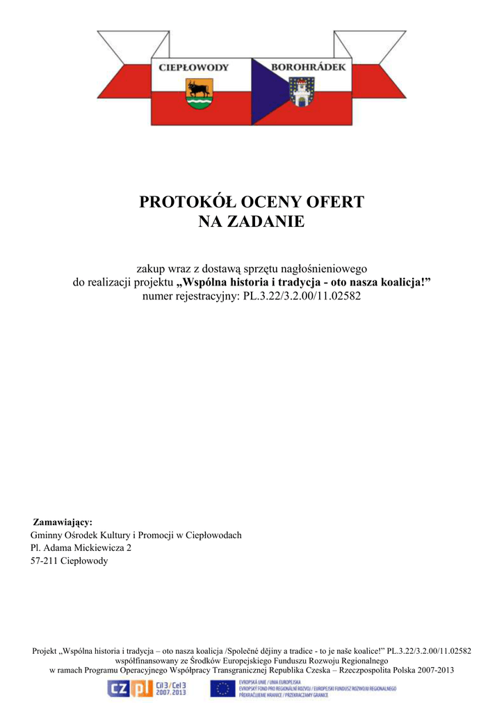 PROTOKÓŁ OCENY OFERT NA ZADANIE zakup wraz z dostawą sprzętu nagłośnieniowego do realizacji projektu „Wspólna historia i tradycja - oto nasza koalicja!” numer rejestracyjny: PL.3.22/3.2.00/11.02582 Zamawiający: Gminny Ośrodek Kultury i Promocji w Ciepłowodach Pl. Adama Mickiewicza 2 57-211 Ciepłowody Projekt „Wspólna historia i tradycja – oto nasza koalicja /Společné dějiny a tradice - to je naše koalice!” PL.3.22/3.2.00/11.02582 współfinansowany ze Środków Europejskiego Funduszu Rozwoju Regionalnego w ramach Programu Operacyjnego Współpracy Transgranicznej Republika Czeska – Rzeczpospolita Polska 2007-2013 1. Komisja oceniająca Zamawiający powołał do oceny ofert komisję w składzie: Elżbieta Myślińska – główna księgowa, Dorota Zając – pracownik kancelaryjny . 2. Kryteria oceny 2.1. Przy ocenie ofert i wyborze najkorzystniejszej oferty Zamawiający kierował się następującymi kryteriami i ich znaczeniem: - kryterium ceny - waga 80 % - kryterium gwarancji - waga 20 % 2.2. Ocena ofert w zakresie przedstawionych wyżej kryteriów została dokonana wg następujących wzorów: Kryterium ceny: cena oferowana minimalna Ocena = ----------------------------------- x 100 pkt. x 80 % cena badanej oferty Kryterium gwarancji: długość gwarancji w badanej ofercie Ocena = -------------------------------------------------------- x 100 pkt. x 20 % najdłuższa gwarancja wśród ocenianych ofert 2.3. Ocena ostateczna: Dokonując ostatecznej oceny Zamawiający zsumował ocenę cząstkową w odniesieniu do kryterium ceny i gwarancji wg następującego wzoru: Ocena ostateczna = suma punktów „cena” + suma punktów „gwarancja” Za najkorzystniejszą ofertę Zamawiający uznał ofertę, która w sumie zdobyła największą liczbę punktów. 3. Oferenci Na ogłoszenie o naborze odpowiedziały 10 firm: - ADA-MUSIC KRĘCICHWOST spółka jawna, ul. Kopernika 25 A, 43-502 Czechowice Dziedzice; - FABRYKA DŹWIEKU Paweł Piłat, ul. Mała Zgoda 3, 25-379 Kielce; - IMAGE RECORDING SOLUTIONS POŁUDNIE Sp. z o.o., Biuro Handlowe: ul. Racławicka 15-19, 53-149 Wrocław; - M. OSTROWSKI spółka jawna, Aleja Armii Krajowej 5, 50-541 Wrocław; - PPHU ALM TECHNIKA Artur Krzuś, ul. Kopernika 11J, 58-200 Dzierżoniów; - PHU RAGTIME, siedziba: 1 Maja 19, 45-068 Opole , Filia: Zwycięstwa 51A, 44-100 Gliwice; - Dadej Krzysztof, Chorupnik 77, 22-315 Gorzków; - ESS Audio Sp. z o.o., ul. Graniczna 17, 05-092 Łomianki; - KAM-I SKLEP MUZYCZNY, ul. Dmowskiego 1 C, 18-400 Łomża; - ViVi Sound Witold Wilk, ul. Poniatowskiego 10, 05-400 Otwock. 4. Ocena ofert 4.1. Ocena kompletności ofert W pięciu ofertach stwierdzono istotne wady - oferenci nie zawarli w specyfikacji technicznej nazwy i siedziby firmy zapewniającej serwis gwarancyjny i pogwarancyjny oferowanego sprzętu. Wymóg taki został określony w punkcie 5.1. zaproszenia do złożenia oferty cenowej. Ze względu na niespełnienie wymogu odrzucono oferty firm: - ADA-MUSIC KRĘCICHWOST spółka jawna; - PHU RAGTIME; - PPHU ALM TECHNIKA Artur Krzuś; - ViVi Sound; - ESS Audio Sp. z o.o.; 4.2. Kryterium ceny CENA POZYCJA M. OSTROWSKI oferta (zł) punkty DADEJ KRZYSZTOF IMAGE RECORDING SOLUTIONS oferta (zł) oferta (zł) punkty punkty FABRYKA DŹWIĘKU KAM-I oferta (zł) punkty oferta (zł) punkty SUBWOOFER +SATELITY 9 329,55 73,40 8 560,00 80,00 10 139,00 67,54 10 168,00 67,35 9 105,00 75,21 MONITORY ODSŁUCHOWE 2 150,04 68,84 1 850,00 80,00 2 220,00 66,67 1 938,00 76,37 1 920,00 77,08 MIKSER 1 612,53 80,00 1 670,00 77,25 1 989,00 64,86 1 834,00 70,34 3 680,00 35,06 3 373,89 76,83 3 240,00 80,00 3 280,00 79,02 3 352,00 77,33 3 462,00 74,87 648,21 17 114,22 80,00 379,07 710,00 16 030,00 73,04 390,29 1 548,00 19 176,00 33,50 311,59 1 412,00 18 704,00 36,73 328,12 733,00 18 900,00 70,75 332,97 MIKROFONY +STATYWY OKABLOWANIE RAZEM Projekt „Wspólna historia i tradycja – oto nasza koalicja /Společné dějiny a tradice - to je naše koalice!” PL.3.22/3.2.00/11.02582 współfinansowany ze Środków Europejskiego Funduszu Rozwoju Regionalnego w ramach Programu Operacyjnego Współpracy Transgranicznej Republika Czeska – Rzeczpospolita Polska 2007-2013 4.3. Kryterium gwarancji GWARANCJA POZYCJA M. OSTROWSKI DADEJ KRZYSZTOF IMAGE RECORDING SOLUTIONS FABRYKA DŹWIĘKU KAM-I oferta (lata) punkty oferta (lata) punkty oferta (lata) punkty oferta (lata) punkty oferta (lata) punkty 2 8 5 20 2 8 5 20 5 20 2 13,33 3 20 2 13,33 2 13,33 3 20 SUBWOOFER +SATELITY MONITORY ODSŁUCHOWE MIKSER 2 20 2 20 2 20 2 20 2 20 MIKROFONY +STATYWY 2 13,33 3 20 2 13,33 2 13,33 3 20 OKABLOWANIE 2 8 62,66 5 20 100,00 2 8 62,66 2 8 74,66 3 12 92,00 RAZEM 4.4. Ocena ostateczna OCENA OSTATECZNA M. OSTROWSKI cena (punkty) 379,07 RAZEM (punkty) gwarancja (punkty) 62,66 441,73 DADEJ KRZYSZTOF cena (punkty) 390,29 gwarancja (punkty) 100,00 490,29 IMAGE RECORDING SOLUTIONS cena gwarancja (punkty) (punkty) cena (punkty) 311,59 328,12 62,66 374,25 KAM-I gwarancja (punkty) 74,66 402,78 FABRYKA DŹWIĘKU cena (punkty) 332,97 gwarancja (punkty) 92,00 424,97 Po dokonaniu oceny cząstkowej i podsumowaniu punktów wg poszczególnych kryteriów Zamawiający uznał za najbardziej korzystną ofertę firmy Dadej Krzysztof, Chorupnik 77, 22-315 Gorzków. Podpisy członków komisji: Zatwierdzam: Projekt „Wspólna historia i tradycja – oto nasza koalicja /Společné dějiny a tradice - to je naše koalice!” PL.3.22/3.2.00/11.02582 współfinansowany ze Środków Europejskiego Funduszu Rozwoju Regionalnego w ramach Programu Operacyjnego Współpracy Transgranicznej Republika Czeska – Rzeczpospolita Polska 2007-2013
