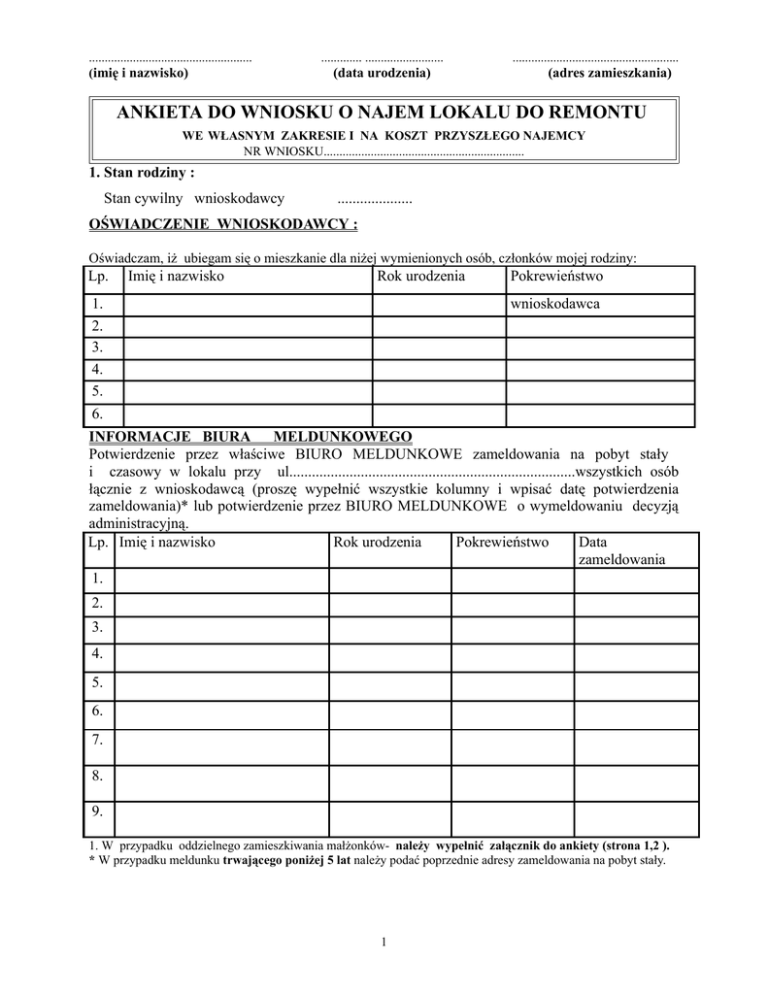 ANKIETA DO WNIOSKU O NAJEM LOKALU DO REMONTU
