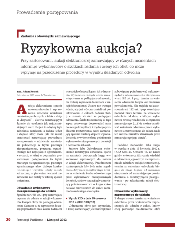 Prowadzenie postępowania Zadania i obowiązki zamawiającego Ryzykowna aukcja? Przy zastosowaniu aukcji elektronicznej zamawiający w różnych momentach informuje wykonawców o skutkach badania i oceny ich ofert, co może wpłynąć na przedłużenie procedury w wyniku składanych odwołań. mec. Adam Roszyk Adwokat w KSP Legal & Tax Advice. A ukcja elektroniczna sprzyja unowocześnieniu i usprawnieniu procedur udzielania zamówień publicznych, a także – dzięki „licytacji” – ułatwia zamawiającym dążenie do uzyskania jak najkorzystniejszych ofert. Nie jest to odrębny tryb udzielania zamówień, a jedynie jeden z etapów, który może (ale nie musi) zastosować zamawiający prowadzący postępowanie o udzielenie zamówienia publicznego w trybie przetargu nieograniczonego, przetargu ograniczonego lub negocjacji z ogłoszeniem, w sytuacji, w której w poprzednio prowadzonym postępowaniu (w trybie przetargu nieograniczonego, przetargu ograniczonego albo dialogu konkurencyjnego) wszystkie oferty zostały odrzucone, a pierwotne warunki zamówienia nie zostały w istotny sposób zmienione. Odwołanie wykonawcy niezaproszonego do udziału Zgodnie z art. 91b ust. 1 pzp zamawiający zaprasza do udziału w aukcji wykonawców, których oferty nie podlegają odrzuceniu. Oznacza to, że zaproszenie do aukcji poprzedzone musi zostać badaniem 20 wszystkich ofert pod kątem ich odrzucenia. Wykonawcy, których oferty zamawiający uzna za podlegające odrzuceniu, nie zostaną zaproszeni do udziału w aukcji elektronicznej. Ustawa nie wymaga jednak, aby już wówczas zostali oni poinformowani o efektach badania ofert, tj. o uznaniu ich ofert za podlegające odrzuceniu. Ścisłe stosowanie się do tego zapisu ustawowego doprowadzić może do szeregu komplikacji i zbędnego przedłużenia postępowania, jeżeli zamawiający, zgodnie z ustawą, dopiero w powiadomieniu o wyborze oferty poinformuje wykonawców niezaproszonych do aukcji o odrzuceniu ich ofert. Krajowa Izba Odwoławcza wielokrotnie rozstrzygała odwołania oparte na zarzutach dotyczących kręgu wykonawców zaproszonych do udziału w aukcji elektronicznej. Przedmiotem rozstrzygnięcia Izby były m.in. zagadnienia dotyczące początku biegu terminu na wniesienie środka odwoławczego przez wykonawców niezaproszonych do aukcji, także w sytuacji gdy zmawiający poinformował ich o kręgu wykonawców zaproszonych do aukcji pomimo braku takiego obowiązku. nWyrok KIO z dnia 15 czerwca 2012 r. (KIO 1086/12) „Odrzucenie oferty jest czynnością, o której zamawiający jest bezwzględnie Przetargi Publiczne | Listopad 2012 zobowiązany poinformować wykonawcę. Jest to zatem czynność, o której mowa w art. 182 ust. 1 pzp, i termin na wniesienie odwołania biegnie od momentu powiadomienia. Nie znajduje zaś zastosowania art. 182 ust. 3 pzp, określający początek biegu terminu na wniesienie odwołania od dnia, w którym wykonawca powziął wiadomość o czynności zamawiającego. (…) Nie można oczekiwać wniesienia odwołania przez wykonawcę niezaproszonego do aukcji, jeżeli ten nie zna zarzutów stawianych przez zamawiającego jego ofercie”. Podobne stanowisko Izba zajęła w wyroku z dnia 13 kwietnia 2012 r. (KIO 626/12). Oznacza to, że nawet gdyby wykonawca faktycznie wiedział o odrzuceniu jego oferty i niezaproszeniu do udziału w aukcji elektronicznej, termin na wniesienie odwołania biegnie dla niego dopiero od momentu otrzymania od zamawiającego powiadomienia o rozstrzygnięciu postępowania – po zakończeniu aukcji elektronicznej. Odwołanie wykonawcy zaproszonego do udziału Z drugiej strony termin na wniesienie odwołania przez wykonawców zaproszonych do udziału w aukcji, którzy chcą podważyć nieodrzucenie ofert Prowadzenie postępowania konkurentów, biegnie od chwili otrzymania zaproszenia. Jeżeli zamawiający wskazuje, kogo zaprosił do udziału w aukcji, to już wówczas znają oni krąg wykonawców, których oferty nie podlegają odrzuceniu (tak postanowienie KIO z dnia 23 listopada 2010 r. – KIO/UZP 2444/10, wyrok KIO z dnia 11 marca 2011 r. – KIO 414/11, postanowienie KIO z dnia 11 czerwca 2012 r. – KIO 1136/12). Jeżeli zatem, w ocenie takich wykonawców, oferty konkurenta lub konkurentów zaproszonych do aukcji podlegają odrzuceniu, powinni oni wnieść odwołanie już po otrzymaniu zaproszenia. To także prowadzi do swego rodzaju rozbicia postępowania odwoławczego na etapy. Jeżeli wykonawca taki, obok zakwestionowania wyników badania ofert konkurencji, zakwestionuje także przebieg aukcji, złoży kolejne odwołanie w terminie liczonym od momentu rozstrzygnięcia aukcji i uruchomi po raz kolejny postępowanie odwoławcze. Odwołanie może oczywiście złożyć także każdy z pozostałych wykonawców biorących udział w aukcji. Co więcej, w przypadku wykorzystania aukcji elektronicznej dochodzi również do dwukrotnego dokonania czynności, w której zamawiający przedstawia efekty oceny ofert. Najpierw, zgodnie z art. 80 ust. 2 w zw. z art. 91c ust. 5 pzp, przedstawi on wynik aukcji, a następnie powiadomi o wyborze oferty zgodnie z art. 92 pzp. Termin na wniesienie odwołania od przebiegu aukcji biegnie od dnia umieszczenia informacji, o której mowa w art. 80 ust. 2 pzp, zaś termin na wniesienie odwołania co do wyboru oferty – od dnia powiadomienia. W przypadku istotnego rozłożenia w czasie tych czynności (co jest możliwe) zdarzyć się może, że konieczne będzie dwukrotne przeprowadzenie postępowania odwoławczego. Biorąc pod uwagę przedstawione uwagi co do terminów na wniesienie odwołania, należy zwrócić uwagę na ryzyko istotnego wydłużenia postępowania, w którym zamawiający zdecydował się na zastosowanie aukcji elektronicznej. Ryzyko trzykrotnego prowadzenia postępowania odwoławczego W skrajnym przypadku może dojść do trzykrotnego przeprowadzenia postępowania odwoławczego: 1) wskutek odwołania wykonawcy zaproszonego do udziału w aukcji, kt