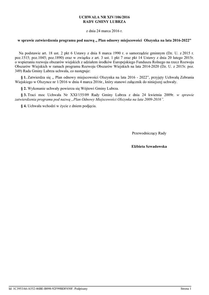 UCHWAŁA NR XIV/106/2016 RADY GMINY LUBRZA z dnia 24 marca 2016 r. w sprawie zatwierdzenia programu pod nazwą ,, Plan odnowy miejscowości Olszynka na lata 2016-2022” Na podstawie art. 18 ust. 2 pkt 6 Ustawy z dnia 8 marca 1990 r. o samorządzie gminnym (Dz. U. z 2015 r. poz.1515; poz.1045; poz.1890) oraz w związku z art. 3 ust. 1 pkt 7 oraz pkt 14 Ustawy z dnia 20 lutego 2015r. o wspieraniu rozwoju obszarów wiejskich z udziałem środków Europejskiego Funduszu Rolnego na rzecz Rozwoju Obszarów Wiejskich w ramach programu Rozwoju Obszarów Wiejskich na lata 2014-2020 (Dz. U. z 2015r. poz. 349) Rada Gminy Lubrza uchwala, co następuje: § 1. Zatwierdza się ,, Plan odnowy miejscowości Olszynka na lata 2016 - 2022”, przyjęty Uchwałą Zebrania Wiejskiego w Olszynce nr 1/2016 w dniu 4 marca 2016r., który stanowi załącznik do niniejszej uchwały. § 2. Wykonanie uchwały powierza się Wójtowi Gminy Lubrza. § 3. Traci moc Uchwała Nr XXI/155/09 Rady Gminy Lubrza z dnia 24 kwietnia 2009r. w sprawie zatwierdzenia programu pod nazwą „Plan Odnowy Miejscowości Olszynka na lata 2009-2016”. § 4. Uchwała wchodzi w życie z dniem podjęcia. Przewodniczący Rady Elżbieta Szwadowska Id: 1C3953A6-A552-46BE-B098-92F99BDF850F. Podpisany Strona 1 Załącznik do uchwały nr XIV/106/2016 Rady Gminy Lubrza z dnia 24 marca 2016 r. PLAN ODNOWY MIEJSCOWOŚCI OLSZYNKA NA LATA 2016-2022 GMINA LUBRZA Olszynka, marzec 2016r. Id: 1C3953A6-A552-46BE-B098-92F99BDF850F. Podpisany Strona 2 SPIS TREŚCI strona l. Wprowadzenie 4 2. Aktualna sytuacja społeczno- gospodarcza na obszarze miejscowości 4 2.1 Podstawowe dane na temat sołectwa 4 2.2 Historia i dziedzictwo kulturowe 4 2.3 Inwentaryzacja zasobów służących ujęciu stanu rzeczywistego 5 3. Analiza SWOT dla miejscowości 10 4. Planowane kierunki rozwoju 12 5. Opis i harmonogram planowanych przedsięwzięć 13 6. Realizacja zadań wytypowanych do współfinansowania 15 z Działań Osi 4 „Odnowa i rozwój wsi” 7. System wdrażania Planu Odnowy Miejscowości Olszynka 16 8. System monitorowania i oceny planu odnowy miejscowości. Public relations Planu 17 8.1 System monitorowania Planu Odnowy Miejscowości 17 8.2 Ocena Planu Odnowy Miejscowości 17 8.3 Public relations Planu Odnowy Miejscowości 18 Id: 1C3953A6-A552-46BE-B098-92F99BDF850F. Podpisany Strona 3 1.WPROWADZENIE Plan Odnowy Miejscowości Olszynka jest dokumentem określającym strategię działań wsi w sferze społeczno- gospodarczej na lata 2016 - 2022 Powodem dla powstania Planu Odnowy Miejscowości Olszynka jest chęć efektywnego pozyskiwania funduszy strukturalnych na rzecz rozwoju wsi ( w szczególności w ramach Programu Rozwoju Obszarów Wiejskich na lata 2016-2022) niemniej mieszkańcy Olszynki oraz władze lokalne widzą potrzebę perspektywicznego wyznaczania kluczowych kierunków rozwoju miejscowości. Plan powstał również w celu zaspokojenia potrzeb mieszkańców odnośnie wyznaczenia jasnych kierunków rozwoju swojej miejscowości. Przedkładany Plan Odnowy Miejscowości jest zgodny z dokumentami strategicznymi rozwoju kraju oraz Gminy Lubrza. Podstawą opracowania Planu jest Program Rozwoju Obszarów Wiejskich na lata 2014 - 2020 Wieloletni Plan inwestycyjny Gminy Lubrza, a także Studium Uwarunkowań i Kierunków Zagospodarowania Przestrzennego Gminy Lubrza. Opracowanie zawiera charakterystykę miejscowości, jej historię, analizę zasobów służącą przedstawieniu aktualnej sytuacji, analizę SWOT- czyli mocne i słabe strony wsi, planowane kierunki rozwoju, a także opis zakładanych przedsięwzięć wraz z szacunkowymi kosztami i harmonogramem planowanych działań. Projekty opisane w Planie nie mają charakteru komercyjnego. W Planie został także przedstawiony szczegółowy system wdrażania, system monitorowania i oceny realizacji Planu oraz system komunikacji społecznej. Plan Odnowy Miejscowości Olszynka jest planem otwartym, który w zależności od potrzeb i uwarunkowań finansowych będzie mógł być aktualizowany. Takie sformułowanie pozwala na dopisywanie nowych działań, a także na modyfikację terminu ich realizacji W latach 2016 - 2022 w zależności dostępu do funduszy z UE. Realizacja niniejszego Planu pozwoli podnieść standard życia mieszkańców miejscowości Olszynka oraz poprawi jej atrakcyjność. Plan zostanie przyjęty do realizacji przez Zebranie Wiejskie, a następnie zatwierdzony przez Radę Gminy Lubrza. 2. AKTUALNA SYTUACJA SPOŁECZNO - GOSPODARCZA NA OBSZARZE MIEJSOCOWOŚCI 2.1 PODSTAWOWE INFORMACJE NA TEMAT SOŁECTWA Wieś Olszynka położona jest w południowej części województwa opolskiego na pograniczu dwóch krain geograficznych : Niziny Śląskiej i Sudetów Wschodnich, które zapewniają jej urozmaicone ukształtowanie powierzchni terenu oraz Wysokie walory krajobrazu przyrodniczego. Utworzony w 1988 roku Park Krajobrazowy „Góry Opawskie” oraz ich otulina obejmują południowo - zachodnią część obszaru gminy Lubrza, granicząc bezpośrednio ze wsią Olszynka. Olszynka na dzień 31 grudnia 2015 roku liczyła 258 mieszkańców i znajduje się tu 48 budynków mieszkalnych, w tym kilka wielorodzinnych. Na tym obszarze działalność rolniczą prowadzi jedno Stadnina Koni oraz 12 gospodarstw rodzinnych każde powyżej 3 ha. Na terenie wsi znajdują się 2 sklepy, zakład Organmistrzowski, Wiejski Dom Kultury, boisko sportowe, gospodarstwo Stadniny Koni, Stacja Wodociągowa, przedsiębiorstwo handlowo – promocyjne AGRO EFEKT oraz Stajnia u Jana. Id: 1C3953A6-A552-46BE-B098-92F99BDF850F. Podpisany Strona 4 Wieś wyposażona jest w infrastrukturę drogową, wodociągową, oświetlenie uliczne, kanalizację burzową, chodnik, sieć telefoniczną. Wieś Olszynka znajduje się w strefie bezpośredniego oddziaływania miasta Prudnik, który pełni rolę ośrodka regionalnego, skupiającego ponad lokalne urządzenia usługowe i miejsca pracy. Przez teren Gminy Lubrza przebiegają dwa odcinki dróg kraj owyc