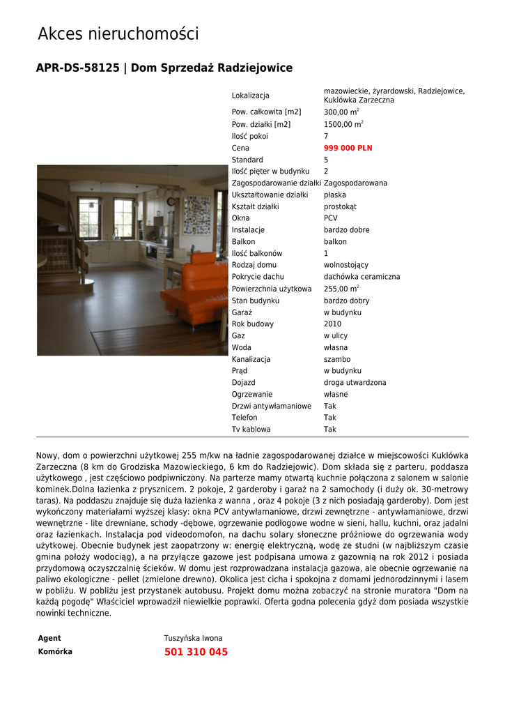 Akces nieruchomości APR-DS-58125 | Dom Sprzedaż Radziejowice Lokalizacja mazowieckie, żyrardowski, Radziejowice, Kuklówka Zarzeczna Pow. całkowita [m2] 300,00 m2 Pow. działki [m2] 1500,00 m2 Ilość pokoi 7 Cena 999 000 PLN Standard 5 Ilość pięter w budynku 2 Zagospodarowanie działki Zagospodarowana Ukształtowanie działki płaska Kształt działki prostokąt Okna PCV Instalacje bardzo dobre Balkon balkon Ilość balkonów 1 Rodzaj domu wolnostojący Pokrycie dachu dachówka ceramiczna Powierzchnia użytkowa 255,00 m2 Stan budynku bardzo dobry Garaż w budynku Rok budowy 2010 Gaz w ulicy Woda własna Kanalizacja szambo Prąd w budynku Dojazd droga utwardzona Ogrzewanie własne Drzwi antywłamaniowe Tak Telefon Tak Tv kablowa Tak Nowy, dom o powierzchni użytkowej 255 m/kw na ładnie zagospodarowanej działce w miejscowości Kuklówka Zarzeczna (8 km do Grodziska Mazowieckiego, 6 km do Radziejowic). Dom składa się z parteru, poddasza użytkowego , jest częściowo podpiwniczony. Na parterze mamy otwartą kuchnie połączona z salonem w salonie kominek.Dolna łazienka z prysznicem. 2 pokoje, 2 garderoby i garaż na 2 samochody (i duży ok. 30-metrowy taras). Na poddaszu znajduje się duża łazienka z wanna , oraz 4 pokoje (3 z nich posiadają garderoby). Dom jest wykończony materiałami wyższej klasy: okna PCV antywłamaniowe, drzwi zewnętrzne - antywłamaniowe, drzwi wewnętrzne - lite drewniane, schody -dębowe, ogrzewanie podłogowe wodne w sieni, hallu, kuchni, oraz jadalni oraz łazienkach. Instalacja pod videodomofon, na dachu solary słoneczne próżniowe do ogrzewania wody użytkowej. Obecnie budynek jest zaopatrzony w: energię elektryczną, wodę ze studni (w najbliższym czasie gmina położy wodociąg), a na przyłącze gazowe jest podpisana umowa z gazownią na rok 2012 i posiada przydomową oczyszczalnię ścieków. W domu jest rozprowadzana instalacja gazowa, ale obecnie ogrzewanie na paliwo ekologiczne - pellet (zmielone drewno). Okolica jest cicha i spokojna z domami jednorodzinnymi i lasem w pobliżu. W pobliżu jest przystanek autobusu. Projekt domu można zobaczyć na stronie muratora "Dom na każdą pogodę" Właściciel wprowadził niewielkie poprawki. Oferta godna polecenia gdyż dom posiada wszystkie nowinki techniczne. Agent Tuszyńska Iwona Komórka 501 310 045 Akces nieruchomości E-mail [email protected]