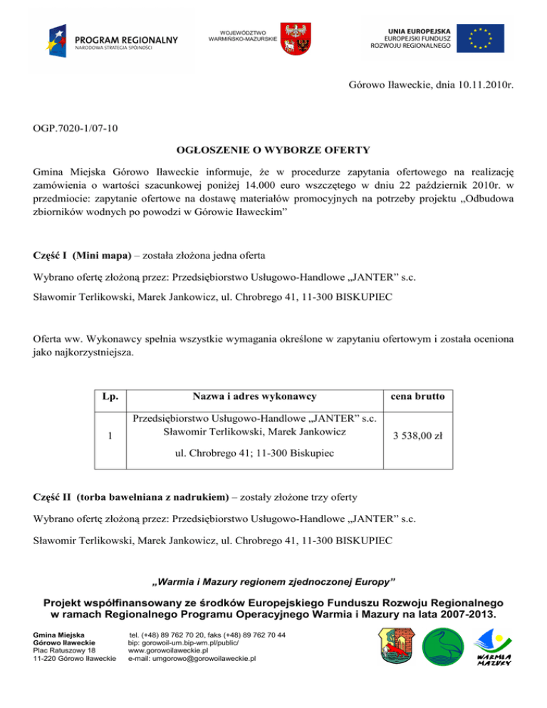 WOJEWÓDZTWO WARMIŃSKO-MAZURSKIE Górowo Iławeckie, dnia 10.11.2010r. OGP.7020-1/07-10 OGŁOSZENIE O WYBORZE OFERTY Gmina Miejska Górowo Iławeckie informuje, Ŝe w procedurze zapytania ofertowego na realizację zamówienia o wartości szacunkowej poniŜej 14.000 euro wszczętego w dniu 22 październik 2010r. w przedmiocie: zapytanie ofertowe na dostawę materiałów promocyjnych na potrzeby projektu „Odbudowa zbiorników wodnych po powodzi w Górowie Iławeckim” Część I (Mini mapa) – została złoŜona jedna oferta Wybrano ofertę złoŜoną przez: Przedsiębiorstwo Usługowo-Handlowe „JANTER” s.c. Sławomir Terlikowski, Marek Jankowicz, ul. Chrobrego 41, 11-300 BISKUPIEC Oferta ww. Wykonawcy spełnia wszystkie wymagania określone w zapytaniu ofertowym i została oceniona jako najkorzystniejsza. Lp. Nazwa i adres wykonawcy cena brutto 1 Przedsiębiorstwo Usługowo-Handlowe „JANTER” s.c. Sławomir Terlikowski, Marek Jankowicz 3 538,00 zł ul. Chrobrego 41; 11-300 Biskupiec Część II (torba bawełniana z nadrukiem) – zostały złoŜone trzy oferty Wybrano ofertę złoŜoną przez: Przedsiębiorstwo Usługowo-Handlowe „JANTER” s.c. Sławomir Terlikowski, Marek Jankowicz, ul. Chrobrego 41, 11-300 BISKUPIEC „Warmia i Mazury regionem zjednoczonej Europy” Projekt współfinansowany ze środków Europejskiego Funduszu Rozwoju Regionalnego w ramach Regionalnego Programu Operacyjnego Warmia i Mazury na lata 2007-2013. Gmina Miejska Górowo Iławeckie Plac Ratuszowy 18 11-220 Górowo Iławeckie tel. (+48) 89 762 70 20, faks (+48) 89 762 70 44 bip: gorowoil-um.bip-wm.pl/public/ www.gorowoilaweckie.pl e-mail: [email protected] Oferta ww. Wykonawcy spełnia wszystkie wymagania określone w zapytaniu ofertowym i została oceniona jako najkorzystniejsza. Lp. Nazwa i adres wykonawcy cena brutto IMPRESS REKLAMA s.c. 1 4 636,00 zł Wiesław Marek Tomella, Zbigniew Nurzyński ul. Wyszyńskiego 1, 10-457 Olsztyn PERFEKT - DRUK 2 4 026,00 zł Maciej Wiśniewski Długie 3a, 87-337 Wąpielsk 3 Przedsiębiorstwo Usługowo-Handlowe „JANTER” s.c. Sławomir Terlikowski, Marek Jankowicz 3 989,40 zł ul. Chrobrego 41; 11-300 Biskupiec Część III (pocztówki w obwolucie) – została złoŜona jedna oferta Wybrano ofertę złoŜoną przez: Przedsiębiorstwo Usługowo-Handlowe „JANTER” s.c. Sławomir Terlikowski, Marek Jankowicz, ul. Chrobrego 41, 11-300 BISKUPIEC Oferta ww. Wykonawcy spełnia wszystkie wymagania określone w zapytaniu ofertowym i została oceniona jako najkorzystniejsza. Lp. Nazwa i adres wykonawcy cena brutto 1 Przedsiębiorstwo Usługowo-Handlowe „JANTER” s.c. Sławomir Terlikowski, Marek Jankowicz 4 392,00 zł ul. Chrobrego 41; 11-300 Biskupiec 2
