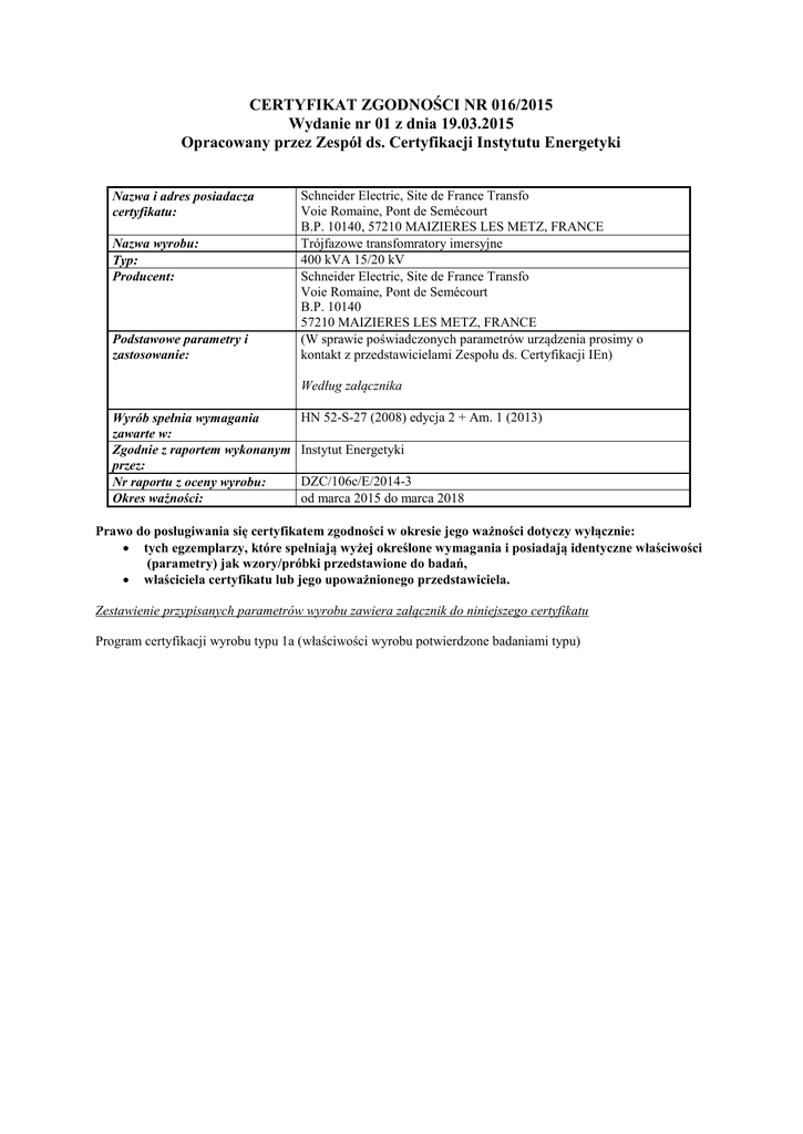 CERTYFIKAT ZGODNOŚCI NR 016/2015 Wydanie nr 01 z dnia 19.03.2015 Opracowany przez Zespół ds. Certyfikacji Instytutu Energetyki Nazwa i adres posiadacza certyfikatu: Nazwa wyrobu: Typ: Producent: Podstawowe parametry i zastosowanie: Schneider Electric, Site de France Transfo Voie Romaine, Pont de Semécourt B.P. 10140, 57210 MAIZIERES LES METZ, FRANCE Trójfazowe transfomratory imersyjne 400 kVA 15/20 kV Schneider Electric, Site de France Transfo Voie Romaine, Pont de Semécourt B.P. 10140 57210 MAIZIERES LES METZ, FRANCE (W sprawie poświadczonych parametrów urządzenia prosimy o kontakt z przedstawicielami Zespołu ds. Certyfikacji IEn) Według załącznika Wyrób spełnia wymagania zawarte w: Zgodnie z raportem wykonanym przez: Nr raportu z oceny wyrobu: Okres ważności: HN 52-S-27 (2008) edycja 2 + Am. 1 (2013) Instytut Energetyki DZC/106c/E/2014-3 od marca 2015 do marca 2018 Prawo do posługiwania się certyfikatem zgodności w okresie jego ważności dotyczy wyłącznie: tych egzemplarzy, które spełniają wyżej określone wymagania i posiadają identyczne właściwości (parametry) jak wzory/próbki przedstawione do badań, właściciela certyfikatu lub jego upoważnionego przedstawiciela. Zestawienie przypisanych parametrów wyrobu zawiera załącznik do niniejszego certyfikatu Program certyfikacji wyrobu typu 1a (właściwości wyrobu potwierdzone badaniami typu)
