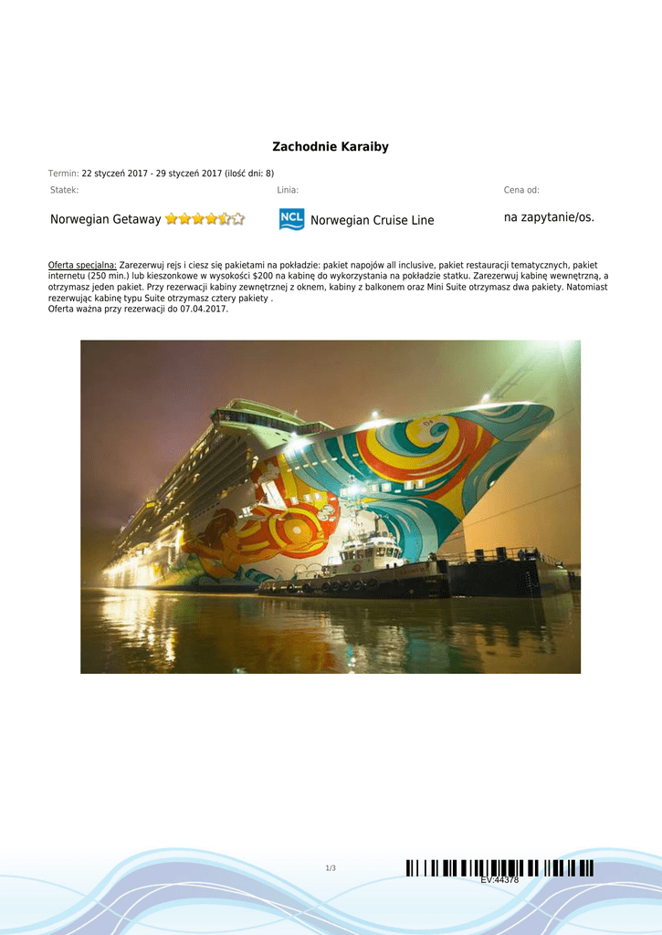 Zachodnie Karaiby Termin: 22 styczeń 2017 - 29 styczeń 2017 (ilość dni: 8) Statek: Norwegian Getaway Linia: Cena od: Norwegian Cruise Line na zapytanie/os. Oferta specjalna: Zarezerwuj rejs i ciesz się pakietami na pokładzie: pakiet napojów all inclusive, pakiet restauracji tematycznych, pakiet internetu (250 min.) lub kieszonkowe w wysokości $200 na kabinę do wykorzystania na pokładzie statku. Zarezerwuj kabinę wewnętrzną, a otrzymasz jeden pakiet. Przy rezerwacji kabiny zewnętrznej z oknem, kabiny z balkonem oraz Mini Suite otrzymasz dwa pakiety. Natomiast rezerwując kabinę typu Suite otrzymasz cztery pakiety . Oferta ważna przy rezerwacji do 07.04.2017. 1/3 EV:44378 TRASA REJSU dzień 1 Data Port Wpłynięcie Wypłynięcie niedziela 22.01.2017 Miami, Floryda --:-- 16:00 Dzień na morzu --:-- --:-- Roatan 10:00 18:00 08:00 17:00 08:00 17:00 08:00 17:00 dzień 2 poniedziałek 23.01.2017 dzień 3 wtorek 24.01.2017 dzień 4 Stany Zjednoczone Honduras środa 25.01.2017 Harvest Caye czwartek 26.01.2017 Costa Maya piątek 27.01.2017 Cozumel dzień 7 sobota 28.01.2017 Dzień na morzu --:-- --:-- dzień 8 niedziela 29.01.2017 Miami, Floryda 08:00 --:-- dzień 5 dzień 6 Legenda Belize Meksyk Meksyk Stany Zjednoczone CENNIK Cena katalogowa Kabina wewnętrzna od €689.00 Kabina zewnętrzna z oknem od €779.00 Kabina zewnętrzna z balkonem od €919.00 Suite (apartament) od €1 019.00 Kabina jednoosobowa na zapytanie 3 i 4 osoba dorosła w kabinie na zapytanie dziecko od 2 do 17 lat jako 3 i 4 osoba w kabinie na zapytanie dziecko od 0 do 2 lat jako 3 i 4 osoba w kabinie na zapytanie Cena promocyjna 2/3 EV:44378 Opłaty portowe w cenie Uwaga! Ceny za osobę w kabinie dwuosobowej. Cena zawiera: zakwaterowanie w kabinie wybranej kategorii; wyżywienie - 3 główne posiłki, przekąski między posiłkami, bufet lub przekąski o północy; napoje serwowane do śniadania i w bufetach samoobsługowych; serwis bagażowy podczas wejścia i zejścia ze statku; serwis kabinowy; korzystanie ze wszystkich urządzeń sportowo - rekreacyjnych znajdujących się na pokładzie statku (basen, jacuzzi, sala fitness, itp.); udział we wszystkich imprezach organizowanych na statku (przedstawienia w teatrze, koncerty, programy animacyjne itp.). Cena nie zawiera: kosztów dojazdu do portu; ewentualnych noclegów w hotelu przed/po rejsie i transferów; wycieczek fakultatywnych w trakcie rejsu; korzystania z barów, mini baru w kabinie oraz napojów zamawianych w restauracji; korzystania z punktów usługowych (fryzjer, pralnia, fotograf, salon piękności i odnowy biologicznej, internet) i wydatków osobistych; napiwków dla obsługi na statku (kwota uzależniona od długości rejsu); ubezpieczenia KL, NNW i bagaż, kosztów wiz (tam gdzie wymagane). 3/3 EV:44378