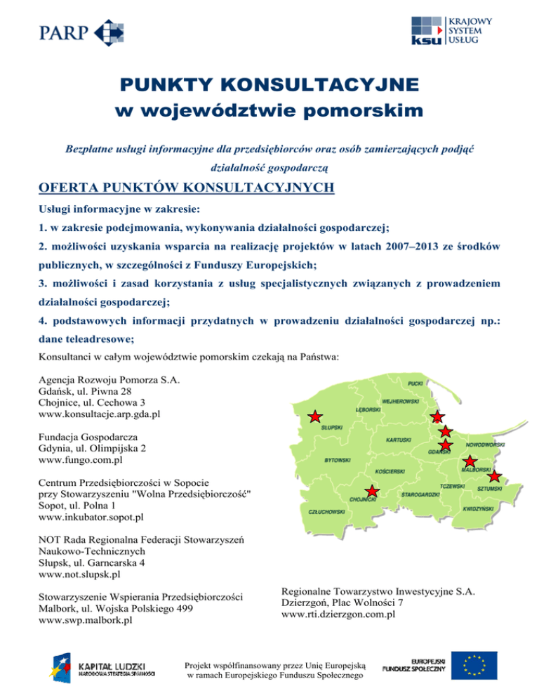 PUNKTY KONSULTACYJNE w województwie pomorskim Bezpłatne usługi informacyjne dla przedsiębiorców oraz osób zamierzających podjąć działalność gospodarczą OFERTA PUNKTÓW KONSULTACYJNYCH Usługi informacyjne w zakresie: 1. w zakresie podejmowania, wykonywania działalności gospodarczej; 2. moŜliwości uzyskania wsparcia na realizację projektów w latach 2007–2013 ze środków publicznych, w szczególności z Funduszy Europejskich; 3. moŜliwości i zasad korzystania z usług specjalistycznych związanych z prowadzeniem działalności gospodarczej; 4. podstawowych informacji przydatnych w prowadzeniu działalności gospodarczej np.: dane teleadresowe; Konsultanci w całym województwie pomorskim czekają na Państwa: Agencja Rozwoju Pomorza S.A. Gdańsk, ul. Piwna 28 Chojnice, ul. Cechowa 3 www.konsultacje.arp.gda.pl Fundacja Gospodarcza Gdynia, ul. Olimpijska 2 www.fungo.com.pl Centrum Przedsiębiorczości w Sopocie przy Stowarzyszeniu "Wolna Przedsiębiorczość" Sopot, ul. Polna 1 www.inkubator.sopot.pl NOT Rada Regionalna Federacji Stowarzyszeń Naukowo-Technicznych Słupsk, ul. Garncarska 4 www.not.slupsk.pl Stowarzyszenie Wspierania Przedsiębiorczości Malbork, ul. Wojska Polskiego 499 www.swp.malbork.pl Regionalne Towarzystwo Inwestycyjne S.A. Dzierzgoń, Plac Wolności 7 www.rti.dzierzgon.com.pl Projekt współfinansowany przez Unię Europejską w ramach Europejskiego Funduszu Społecznego Agencja Rozwoju Pomorza S.A. (Regionalny Punkt Konsultacyjny) wraz z Lokalnymi Punktami Konsultacyjnymi zapraszają w dniu 17 listopada 2009 roku na seminarium informacyjne. Tematyka seminariuim: 1) Jak załoŜyć działalność gospodarczą; 2) Jak otrzymać dotację na rozpoczęcie działalności gospodarczej; 3) Jak uzyskać środki finansowe na rozwój działalności gospodarczej; Seminarium organizowane w ramach Światowego Tygodnia Przedsiębiorczości odbędzie się w sześciu powiatach województwa pomorskiego Ideą Światowego Tygodnia Przedsiębiorczości jest promowanie przedsiębiorczości wśród ludzi młodych do 30 roku Ŝycia. Więcej informacji na www.arp.gda.pl oraz: Powiat Chojnicki Agencja Rozwoju Pomorza S.A. Chojnice, ul. Cechowa 3 Tel. 052 397 90 12 www.arp.gda.pl Powiat Sopot (miasto n.p.pow.) Centrum Przedsiębiorczości w Sopocie przy Stowarzyszeniu "Wolna Przedsiębiorczość" Sopot, ul. Polna 1 Tel. 058 524 50 50 www.inkubator.sopot.pl Powiat Gdańsk (miasto n.p.pow.) Agencja Rozwoju Pomorza S.A. Gdańsk, ul. Piwna 28 Tel. 058 32 33 228 www.arp.gda.pl Powiat Sztumski Regionalne Towarzystwo Inwestycyjne S.A. Dzierzgoń, Plac Wolności 7 Tel. 055 276 25 79 www.rti.dzierzgon.com.pl Powiat Gdynia (miasto n.p.pow.) Fundacja Gospodarcza Gdynia, ul. Olimpijska 2 Tel. 058 622 20 52 www.fungo.com.pl Powiat Słupski NOT Rada Regionalna Federacji Stowarzyszeń Naukowo-Technicznych Słupsk, ul. Garncarska 4 Tel. 059 842 25 38 www.not.slupsk.pl Projekt współfinansowany przez Unię Europejską w ramach Europejskiego Funduszu Społecznego