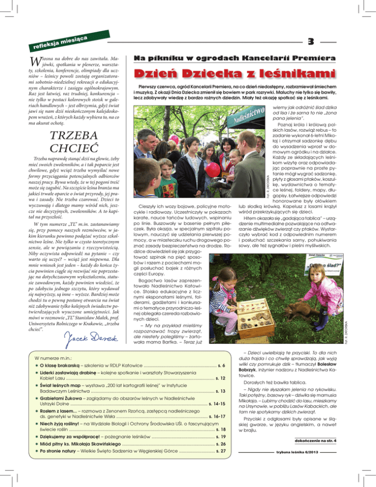 a iesiąc sja m reflek W iosna na dobre do nas zawitała. Majówki, spotkania w plenerze, warsztaty, szkolenia, konferencje, olimpiady dla uczniów – leśnicy powoli zostają organizatorami sobotnio-niedzielnej rekreacji o edukacyjnym charakterze i zasięgu ogólnokrajowym. Raz jest łatwiej, raz trudniej, konkurencja – nie tylko w postaci kolorowych stoisk w galeriach handlowych – jest olbrzymia, gdyż świat jawi się nam dziś nieskończonym kalejdoskopem wrażeń, z których każdy wybiera to, na co ma akurat ochotę. 3 Na pikniku w ogrodach Kancelarii Premiera Dzień Dziecka z leśnikami Pierwszy czerwca, ogród Kancelarii Premiera, na co dzień niedostępny, rozbrzmiewał śmiechem i muzyką. Z okazji Dnia Dziecka zmienił się bowiem w park rozrywki. Maluchy nie tylko się bawiły, lecz zdobywały wiedzę z bardzo rożnych dziedzin. Miały też okazję spotkać się z leśnikami. TRZEBA CHCIEĆ Trzeba naprawdę stanąć dziś na głowie, żeby mieć swoich zwolenników, a i tak poparcie jest chwilowe, gdyż wciąż trzeba wymyślać nowe formy przyciągania potencjalnych odbiorców naszej pracy. Bywa wtedy, że w tej pogoni treść może się zagubić. Na szczęście leśna branża ma jakieś trwałe oparcie o świat przyrody, jej prawa i zasady. Nie trzeba czarować. Dzieci to wyczuwają i dlatego mamy wśród nich, jeszcze nie decyzyjnych, zwolenników. A to kapitał na przyszłość. W tym numerze „TL” m.in. zastanawiamy się, przy pomocy naszych rozmówców, w jakim kierunku powinno podążać wyższe szkolnictwo leśne. Nie tylko w czysto teoretycznym sensie, ale w powiązaniu z rzeczywistością. Niby oczywista odpowiedź na pytanie – czy warto się uczyć? – wciąż jest niepewna. Dla mnie wniosek jest jeden – każdy do końca życia powinien ciągle się rozwijać nie poprzestając na dotychczasowym wykształceniu, statusie zawodowym, każdy powinien wiedzieć, że po zdobyciu jednego szczytu, który wydawał się najwyższy, są inne – wyższe. Bardziej może chodzi tu o pewną postawę otwarcia na świat niż zdobywanie tylko kolejnych świadectw potwierdzających wyuczone umiejętności. Jak mówi w rozmowie „TL” Stanisław Małek, prof. Uniwersytetu Rolniczego w Krakowie, „trzeba chcieć”. Cieszyły ich wozy bojowe, policyjne motocykle i radiowozy. Uczestniczyły w pokazach karate, nauce tańców ludowych, wspinaniu po linie. Buszowały w basenie pełnym piłeczek. Była okazja, w specjalnym szpitalu polowym, nauczyć się udzielania pierwszej pomocy, a w miasteczku ruchu drogowego poznać zasady bezpieczeństwa na drodze. Rodzice dowiedzieli się jak przygotować szpinak na pięć sposobów i razem z pociechami mogli posłuchać bajek z różnych części Europy. wiemy jak odróżnić ślad dzika od lisa i że sarna to nie „żona pana jelenia”. Poznaj króla i królową polskich lasów, rozwiąż rebus – to zadanie wykonał 6-letni Mikołaj i otrzymał sadzonkę dębu do wysadzenia wprost w domowym ogródku i na działce. Każdy ze składających leśnikom wizytę oraz odpowiadając poprawnie na proste pytanie mógł wygrać sadzonkę, płyty z głosami ptaków, koszulkę, wydawnictwa o tematyce leśnej, foldery, mapy, długopisy. Łatwiejsze odpowiedzi honorowane były ołówkiem lub słodką krówką. Kapelusz z losami krążył wśród przekrzykujących się dzieci. Hitem okazała się „gadająca tablica” – urządzenie multimedialne pozwalające na odtwarzanie dźwięków zwierząt czy ptaków. Wystarczyło wybrać kod z odpowiednim numerem i posłuchać szczekania sarny, pohukiwania sowy, ale też sygnałów i pieśni myśliwskich. Bogactwo lasów zaprezentowało Nadleśnictwo Katowice. Stoisko edukacyjne z licznymi eksponatami leśnymi, folderami, gadżetami i konkursami o tematyce przyrodniczo-leśnej oblegała czereda rozbawionych dzieci. – My na przykład mieliśmy rozpoznawać tropy zwierząt, ale niestety polegliśmy – żartowała mama Bartka. – Teraz już W numerze m.in.: O klasę brakarską – szkolenia w RDLP Katowice ........................................................... s. 6 Liderki zostawiają drabinę – kolejne spotkanie i warsztaty Stowarzyszenia Kobiet Lasu ........................................................................................................................ s. 12 Świat leśnych map – wystawa „200 lat kartografii leśnej” w Instytucie Badawczym Leśnictwa .................................................................................................... s. 13 Grzbietami Żukowa – zaglądamy do obszarów leśnych w Nadleśnictwie Ustrzyki Dolne ............................................................................................................... s. 14-15 Rosłem z lasem... – rozmowa z Zenonem Rzońcą, zastępcą nadleśniczego ds. genetyki w Nadleśnictwie Wisła .......................................................................... s. 16-17 Niech żyją rośliny! – na Wydziale Biologii i Ochrony Środowiska UŚl. o fascynującym świecie roślin ...................................................................................................................... s. 18 Dziękujemy za współpracę! – pożegnanie leśników ................................................... s. 19 Miód pitny ks. Mikołaja Skawińskiego ........................................................................... s. 26 Po stronie natury – Wielkie Święto Sadzenia w Węgierskiej Górce ............................. s. 27 – Dzieci uwielbiają te przyciski. To dla nich duża frajda i co chwilę sprawdzają, jak wyją wilki czy pomrukuje dzik – tłumaczył Bolesław Bobrzyk, inżynier nadzoru z Nadleśnictwa Katowice. Dorosłych też bawiła tablica. – Nigdy nie słyszałam jelenia na rykowisku. Taki potężny, basowy ryk – dziwiła się mamusia Mikołaja. – Lubimy chodzić do lasu, mieszkamy na Ursynowie, w pobliżu Lasów Kabackich, ale tam nie spotykamy dzikic