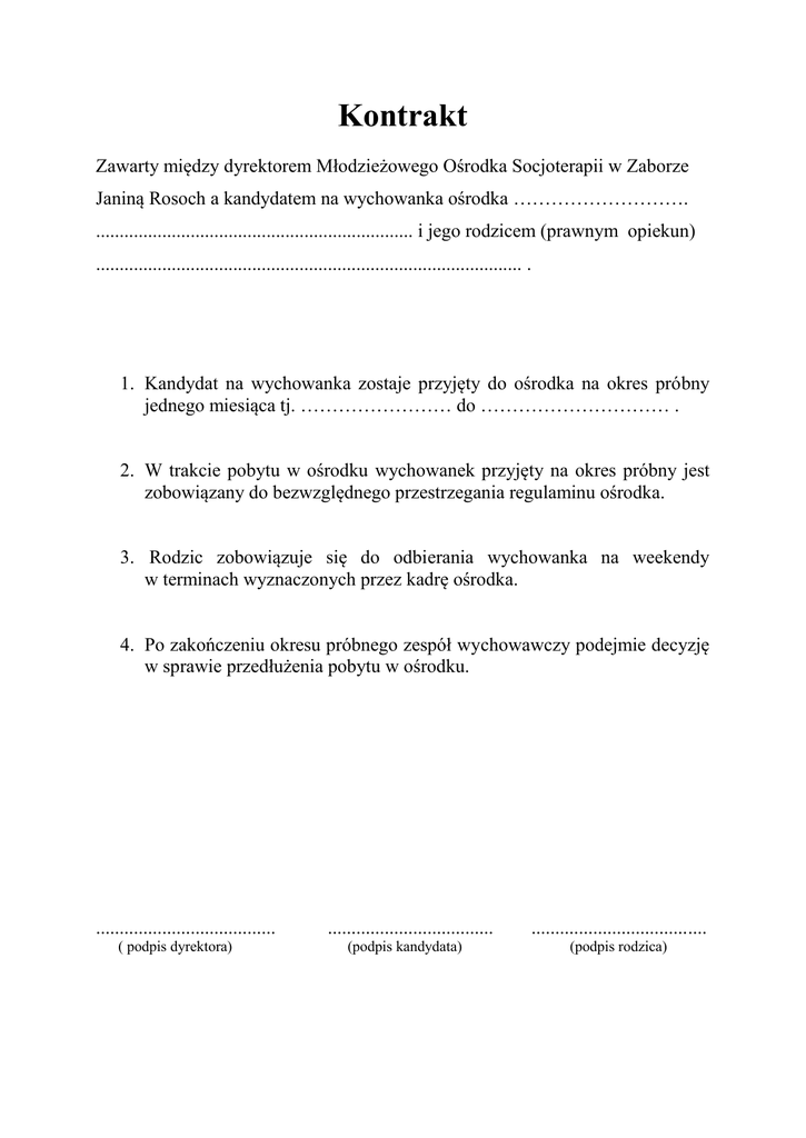 Kontrakt Zawarty między dyrektorem Młodzieżowego Ośrodka Socjoterapii w Zaborze Janiną Rosoch a kandydatem na wychowanka ośrodka ………………………. ................................................................... i jego rodzicem (prawnym opiekun) .......................................................................................... . 1. Kandydat na wychowanka zostaje przyjęty do ośrodka na okres próbny jednego miesiąca tj. …………………… do ………………………… . 2. W trakcie pobytu w ośrodku wychowanek przyjęty na okres próbny jest zobowiązany do bezwzględnego przestrzegania regulaminu ośrodka. 3. Rodzic zobowiązuje się do odbierania wychowanka na weekendy w terminach wyznaczonych przez kadrę ośrodka. 4. Po zakończeniu okresu próbnego zespół wychowawczy podejmie decyzję w sprawie przedłużenia pobytu w ośrodku. ...................................... ( podpis dyrektora) ................................... (podpis kandydata) ..................................... (podpis rodzica)