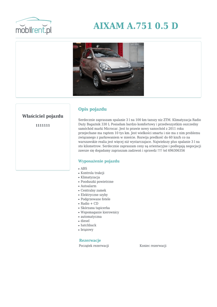 AIXAM A.751 0.5 D Opis pojazdu Właściciel pojazdu 1111111 Serdecznie zapraszam spalanie 3 l na 100 km tanszy niz ZTM. Klimatyzacja Radio Duży Bagażnik 330 L Posiadam bardzo komfortowy i przedwszystkim oszczedny samóchód marki Microcar. Jest to prawie nowy samochód z 2011 roku przejechane ma raptem 10 tys km. Jest wielkości smarta i nie ma z nim problemu związanego z parkowaniem w mieście. Rozwija predkość do 60 km/h co na warszawskie realia jest więcej niż wystarczajace. Najwiekszy plus spalanie 3 l na sto kilometrow. Serdecznie zapraszam ceny są orientacyjne i podlegają negocjacji zawsze się dogadamy zapraszam zadzwoń i sprawdz !!!! tel 696306356 Wyposażenie pojazdu ● ● ● ● ● ● ● ● ● ● ● ● ● ● ● ABS Kontrola trakcji Klimatyzacja Pooduszki powietrzne Autoalarm Centralny zamek Elektryczne szyby Podgrzewane fotele Radio + CD Skórzana tapicerka Wspomaganie kierownicy automatyczna diesel hatchback brązowy Rezerwacje Początek rezerwacji Koniec rezerwacji