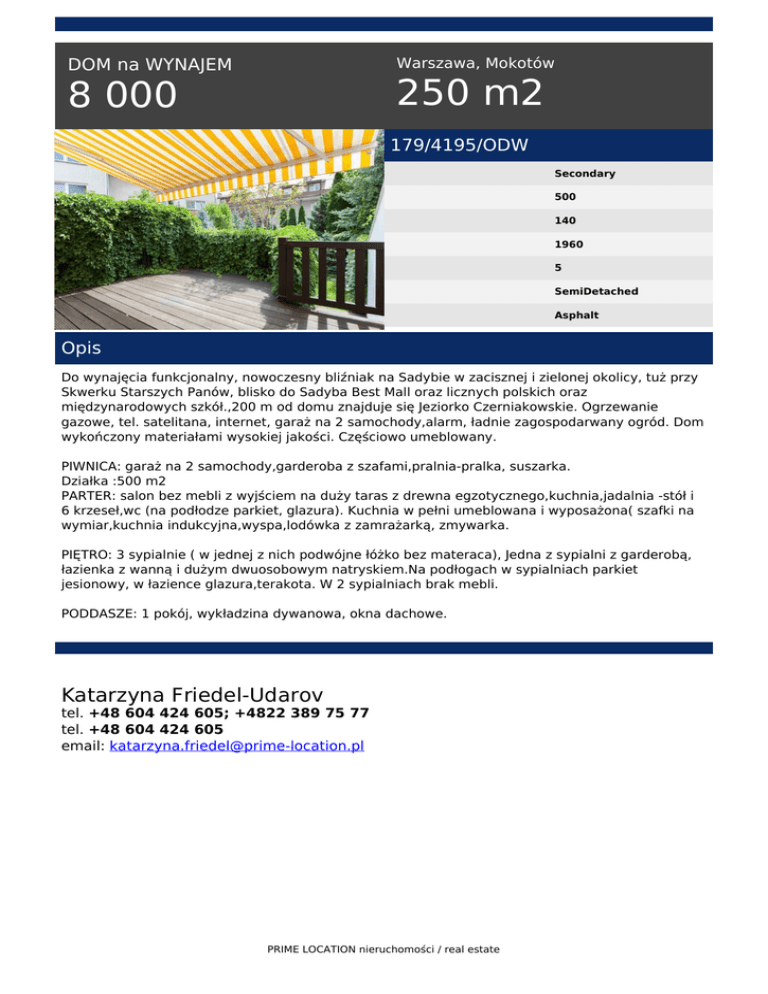 Warszawa, Mokotów DOM na WYNAJEM 250 m2 8 000 179/4195/ODW Secondary 500 140 1960 5 SemiDetached Asphalt Opis Do wynajęcia funkcjonalny, nowoczesny bliźniak na Sadybie w zacisznej i zielonej okolicy, tuż przy Skwerku Starszych Panów, blisko do Sadyba Best Mall oraz licznych polskich oraz międzynarodowych szkół.,200 m od domu znajduje się Jeziorko Czerniakowskie. Ogrzewanie gazowe, tel. satelitana, internet, garaż na 2 samochody,alarm, ładnie zagospodarwany ogród. Dom wykończony materiałami wysokiej jakości. Częściowo umeblowany. PIWNICA: garaż na 2 samochody,garderoba z szafami,pralnia-pralka, suszarka. Działka :500 m2 PARTER: salon bez mebli z wyjściem na duży taras z drewna egzotycznego,kuchnia,jadalnia -stół i 6 krzeseł,wc (na podłodze parkiet, glazura). Kuchnia w pełni umeblowana i wyposażona( szafki na wymiar,kuchnia indukcyjna,wyspa,lodówka z zamrażarką, zmywarka. PIĘTRO: 3 sypialnie ( w jednej z nich podwójne łóżko bez materaca), Jedna z sypialni z garderobą, łazienka z wanną i dużym dwuosobowym natryskiem.Na podłogach w sypialniach parkiet jesionowy, w łazience glazura,terakota. W 2 sypialniach brak mebli. PODDASZE: 1 pokój, wykładzina dywanowa, okna dachowe. Katarzyna Friedel-Udarov tel. +48 604 424 605; +4822 389 75 77 tel. +48 604 424 605 email: [email protected] PRIME LOCATION nieruchomości / real estate Powered by TCPDF (www.tcpdf.org)