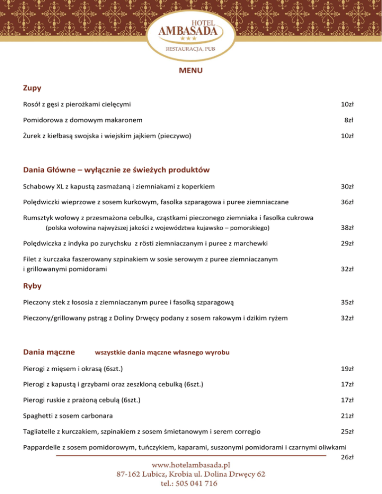 MENU Zupy Rosół z gęsi z pierożkami cielęcymi Pomidorowa z domowym makaronem Żurek z kiełbasą swojska i wiejskim jajkiem (pieczywo) 10zł 8zł 10zł Dania Główne – wyłącznie ze świeżych produktów Schabowy XL z kapustą zasmażaną i ziemniakami z koperkiem 30zł Polędwiczki wieprzowe z sosem kurkowym, fasolka szparagowa i puree ziemniaczane 36zł Rumsztyk wołowy z przesmażona cebulka, cząstkami pieczonego ziemniaka i fasolka cukrowa (polska wołowina najwyższej jakości z województwa kujawsko – pomorskiego) 38zł Polędwiczka z indyka po zurychsku z rösti ziemniaczanym i puree z marchewki 29zł Filet z kurczaka faszerowany szpinakiem w sosie serowym z puree ziemniaczanym i grillowanymi pomidorami 32zł Ryby Pieczony stek z łososia z ziemniaczanym puree i fasolką szparagową 35zł Pieczony/grillowany pstrąg z Doliny Drwęcy podany z sosem rakowym i dzikim ryżem 32zł Dania mączne wszystkie dania mączne własnego wyrobu Pierogi z mięsem i okrasą (6szt.) 19zł Pierogi z kapustą i grzybami oraz zeszkloną cebulką (6szt.) 17zł Pierogi ruskie z prażoną cebulą (6szt.) 17zł Spaghetti z sosem carbonara 21zł Tagliatelle z kurczakiem, szpinakiem z sosem śmietanowym i serem corregio 25zł Pappardelle z sosem pomidorowym, tuńczykiem, kaparami, suszonymi pomidorami i czarnymi oliwkami 26zł MENU Sałatki Sałatka szefa kuchni z kurczakiem lub łososiem 17zł Sałatka grecka 15zł Surówki Z czerwonej kapusty 4zł Z białej kapusty z koperkiem 4zł Selerowa 4zł Tarte buraczki 4zł Dla Dzieci Nuggetsy z frytkami 14zł ½ porcji frytek 5zł ½ porcji zupy pomidorowej z makaronem 4zł ½ porcji rosołu z makaronem 5zł Desery Tiramisu 14zł Lody z owocami, bitą śmietana i polewą owocową 12zł Puchar z owocami sezonowymi i bitą śmietaną 12zł Banan flambirowany z bitą śmietaną, sosem owocowym i gałką lodów waniliowych 13zł MENU Napoje gorące Piwa Kawa czarna 6zł Tyskie 0,5l keg 5zł Espresso 6zł Tyskie 0,3l keg 4zł Cafe latte 8zł Tyskie 0,33l btl 6zł Macchiato 10zł Lech 0,33l btl 6zł Cappuccino 7zł Herbaty różne 7zł Napoje zimne Lech bezalkoholowy 0,33l btl 5zł Alkohole mocne Coca-cola 0,2l 5zł Wyborowa 0,4cl 8zł Fanta 0,2l 5zł Absolut 0,4cl 9zł Sprite 0,2l 5zł Finlandia 0,4cl 9zł Soki owocowe 0,25l 5zł Ballantines 0,4cl 12zł Woda mineralna 0,25l 4zł Jamesson 0,4cl 12zł Jack Daniels 0,4cl 15zł Sok owocowy 1l Sok ze świeżych owoców 0,2l 15zł 8zł MENU ZESTAWY ŚNIADANIOWE ZESTAW I* Jajecznica na boczku z 3 jajek ZESTAW II* Jajka na bekonie – 3szt. ZESTAW III* Parówki cielęce – 5 szt., musztarda, ketchup *W zestawach I – III: Szynka, ser, ogórek, pomidor z cebulą, rzodkiewka, miód, dżem, masło, pieczywo ZESTAW IV Omlet z 3 jajek Z dodatkami do wyboru: boczek, szynka, groszek, pieczarki Miód Dżem Masło Pieczywo Napoje serwowane do śniadania: Kawa, herbata, soki owocowe (pomarańczowy, jabłkowy, z czarnej porzeczki)
