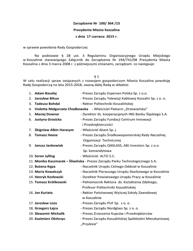 Zarządzenie Nr 100/ 364 /15 Prezydenta Miasta Koszalina z dnia 17 czerwca 2015 r. w sprawie powołania Rady Gospodarczej Na podstawie § 28 ust. 3 Regulaminu Organizacyjnego Urzędu Miejskiego w Koszalinie stanowiącego Załącznik do Zarządzenia Nr 194/741/08 Prezydenta Miasta Koszalina z dnia 3 marca 2008 r. z późniejszymi zmianami, zarządzam co następuje: §1 W celu realizacji spraw związanych z rozwojem gospodarczym Miasta Koszalina powołuję Radę Gospodarczą na lata 2015-2018, zwaną dalej Radą w składzie: 1. 2. 3. 4. 5. 6. Adam Basałaj - Prezes Zarządu Espersen Polska Sp. z o.o. Jarosław Bihun - Prezes Zarządu Telewizji Kablowej Koszalin Sp. z o. o. Tadeusz Bohdal - Rektor Politechniki Koszalińskiej Violetta Małgorzata Chodkowska - Właściciel Piekarni „Drzewiańska” Maciej Downar - Dyrektor ds. kooperacyjnych ING Banku Śląskiego S.A. Justyna Grosicka - Prezes Zarządu Fundacji Centrum Innowacji i Przedsiębiorczości 7. Zbigniew Albin Harasym - Właściciel Akant Sp. j. 8. Tomasz Heese - Prezes Zarządu Środkowopomorskiej Rady Naczelnej Organizacji Technicznej 9. Janusz Jankowiak - Prezes Zarządu Q4GLASS, ABJ Investors Sp. z o.o. Sp. komandytowa 10. Soren Jylling - Właściciel ALTO S.C. 11. Monika Kaczmarek – Śliwińska - Prezes Zarządu Parku Technologicznego S.A. 12. Bożena Kępa - Naczelnik Urzędu Celnego Oddział w Koszalinie 13. Maria Kowalczyk - Naczelnik Pierwszego Urzędu Skarbowego w Koszalinie 14. Henryk Kozłowski - Dyrektor Powiatowego Urzędu Pracy w Koszalinie 15. Tomasz Królikowski - Pełnomocnik Rektora ds. Kształcenia Zdalnego, Profesor Politechniki Koszalińskiej 16. Jan Kuriata - Rektor Państwowej Wyższej Szkoły Zawodowej w Koszalinie 17. Jarosław Loos - Prezes Zarządu PUF Sp. z o. o. 18. Grzegorz Łajca - Prezes Zarządu Nordglass Sp. z o. o. 19. Sławomir Michalik - Prezes Zrzeszenia Kupców i Przedsiębiorców 20. Kazimierz Okińczyc - Prezes Zarządu Koszalińskiej Spółdzielni Mieszkaniowej „Przylesie” 21. Wojciech Okupski 22. Marek Pogonowski 23. Romuald Sobieralski 24. Wanda Stypułkowska 25. Małgorzata Szatkowska 26. Sylwester Szymanik 27. Milena Trojanowska 28. Viktor Wanli 29. Lech Wojciechowski 30. Wiesław Zinka 31. Eugeniusz Żuber - Dyrektor Wojewódzkiego Urzędu Pracy Filia w Koszalinie - Dyrektor Oddziału Zakładu Ubezpieczeń Społecznych w Koszalinie - Prezydent Koszalińskiej Izby Przemysłowo-Handlowej - Prezes Zarządu MPS International Sp. z o. o. - Prokurent Total Wind PL sp. z o. o. - Prokurent Royal Greenland Seafood Sp. z o.o. - Właściciel Fabryki Flag Linea - Prezes Zarządu VIWA Entertainment Poland Sp. z o. o. - Prezes Zarządu EkoWodrol Sp. z o. o. - Prezes MEDEN-INMED Sp. z o. o. - nauczyciel akademicki, doświadczony samorządowiec §2 Kadencja Rady, o której mowa w §1 upływa wraz z kadencją Prezydenta Miasta Koszalina. §3 Zadania i kompetencje Rady, o której mowa w §1 określa Regulamin Rady stanowiący załącznik do niniejszego Zarządzenia. §4 Obsługę organizacyjną Rady zapewnia Pełnomocnik Prezydenta ds. Inwestorów Kluczowych i Zatrudnienia Urzędu Miejskiego w Koszalinie. §5 Zarządzenie wchodzi w życie z dniem podpisania. Prezydent Miasta Koszalina Piotr Jedliński Załącznik Nr 1 do Zarządzenia Nr 100/364/15 Prezydenta Miasta Koszalina z dnia 17 czerwca 2015 r. REGULAMIN I KOMPETENCJE RADY GOSPODARCZEJ 1. Rada Gospodarcza, zwana dalej Radą jest ciałem doradczo – opiniodawczym Prezydenta Miasta Koszalina, w zakresie spraw związanych z rozwojem gospodarczym Koszalina. 2. W skład Rady wchodzą koszalińscy przedsiębiorcy, przedstawiciele środowisk gospodarczych i naukowych oraz środowisk pracujących w otoczeniu i na rzecz gospodarki. 3. Przewodniczącego Rady oraz Zastępcę Przewodniczącego wybiera ze swego grona Rada. 4. Posiedzenia Rady zwołuje Przewodniczący w uzgodnieniu z Prezydentem. Posiedzenia Rady mogą być także zwoływane na wniosek Prezydenta, z inicjatywy Przewodniczącego lub na wniosek co najmniej trzech członków Rady. 5. Posiedzeniami Rady kieruje Przewodniczący lub Zastępca, w przypadku nieobecności Przewodniczącego. 6. Na posiedzenia Rady mogą być również zapraszane osoby spoza jej składu. 7. Do kompetencji Rady należy w szczególności: a) opiniowanie projektów strategii i programów związanych z rozwojem Koszalina, b) opiniowanie projektów dokumentów związanych z kierunkami polityki gospodarczej Miasta Koszalina, w tym w zakresie: - podatków i opłat lokalnych, - miejscowych planów zagospodarowania przestrzennego Miasta Koszalina, - wieloletnich planów inwestycyjnych, - gospodarki nieruchomościami, - kierunków kształcenia i rynku pracy, c) doradzanie Prezydentowi w zakresie spraw związanych z rozwojem gospodarczym i tworzeniem nowych miejsc pracy, zwłaszcza dotyczących przedsięwzięć inwestycyjnych w Mieście oraz pozyskiwaniem funduszy na ich realizację, d) prezentowanie oczekiwań środowisk gospodarczych sprzyjających rozwojowi Miasta Koszalina. 8. Członkowie Rady mogą wchodzić w skład delegacji Prezydenta uczestniczących w krajowych i zagranicznych misjach gospodarczych.