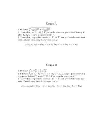 3. Udowodni¢, »e przeksztaªcenie ϕ : R3 → R3 jest prezksztaªceniem liniowym. Znale¹¢ baz¦ Kerϕ i Imϕ oraz rz¡d ϕ.
