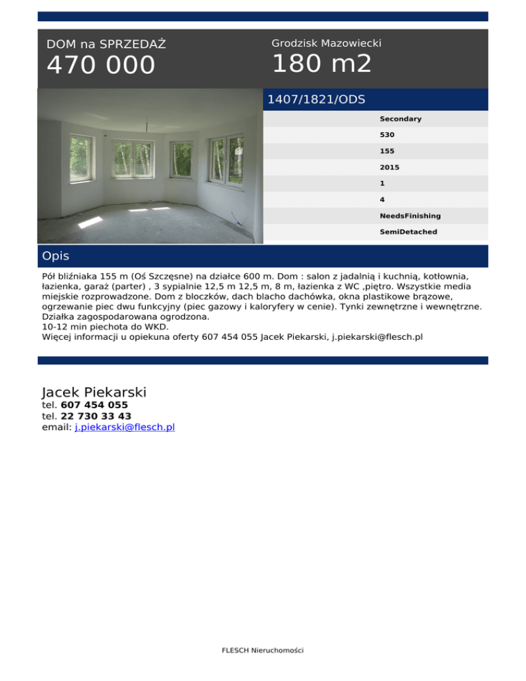 DOM na SPRZEDAŻ 470 000 Grodzisk Mazowiecki 180 m2 1407/1821/ODS Secondary 530 155 2015 1 4 NeedsFinishing SemiDetached Opis Pół bliźniaka 155 m (Oś Szczęsne) na działce 600 m. Dom : salon z jadalnią i kuchnią, kotłownia, łazienka, garaż (parter) , 3 sypialnie 12,5 m 12,5 m, 8 m, łazienka z WC ,piętro. Wszystkie media miejskie rozprowadzone. Dom z bloczków, dach blacho dachówka, okna plastikowe brązowe, ogrzewanie piec dwu funkcyjny (piec gazowy i kaloryfery w cenie). Tynki zewnętrzne i wewnętrzne. Działka zagospodarowana ogrodzona. 10-12 min piechota do WKD. Więcej informacji u opiekuna oferty 607 454 055 Jacek Piekarski, [email protected] Jacek Piekarski tel. 607 454 055 tel. 22 730 33 43 email: [email protected] FLESCH Nieruchomości Powered by TCPDF (www.tcpdf.org)