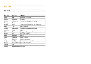NetworkX 9:00 - 13:00 first name last name affiliation Samin Aref University of Auckland Valerio Arnaboldi IIT-CNR Lukasz Augustyniak Wroclaw University of Technology Andrzej Buda Bogdan Gliwa AGH University of Science and Technology Mahdi Jalili RMIT University Tomasz Kajdanowicz Wroclaw University of Technology Wojciech Kawa Agora Felicia Natali Singapore Management University SeWook Oh University of Oxford Mania Rezapour EMCO Yohei Sakamoto Kyoto University Petr Štěpánek Masaryk University Marijn ten Thij Vrije Universiteit Amsterdam Eusebio Vargas Estrada University of Konstanz Jingyan Yu Barbara Żogała-Siudem IBS PAN