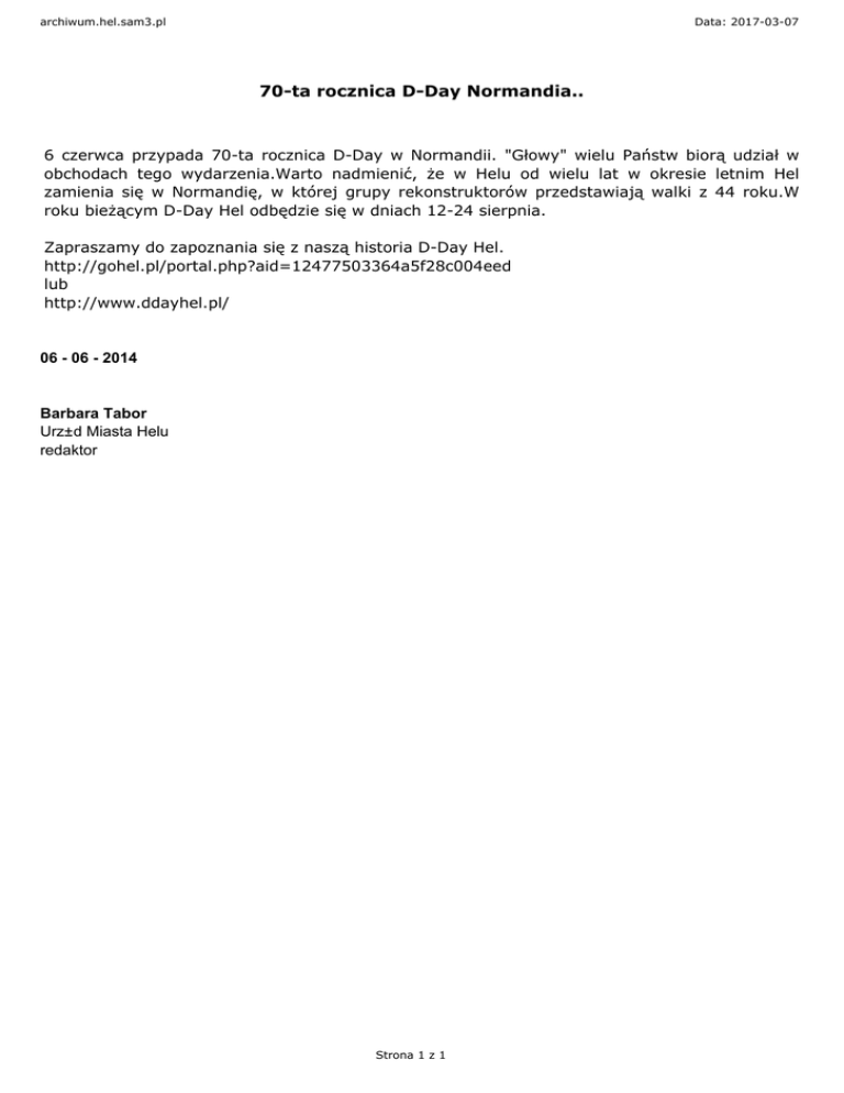archiwum.hel.sam3.pl Data: 2017-03-07 70-ta rocznica D-Day Normandia.. 6 czerwca przypada 70-ta rocznica D-Day w Normandii. "Głowy" wielu Państw biorą udział w obchodach tego wydarzenia.Warto nadmienić, że w Helu od wielu lat w okresie letnim Hel zamienia się w Normandię, w której grupy rekonstruktorów przedstawiają walki z 44 roku.W roku bieżącym D-Day Hel odbędzie się w dniach 12-24 sierpnia. Zapraszamy do zapoznania się z naszą historia D-Day Hel. http://gohel.pl/portal.php?aid=12477503364a5f28c004eed lub http://www.ddayhel.pl/ 06 - 06 - 2014 Barbara Tabor Urz±d Miasta Helu redaktor Strona 1 z 1