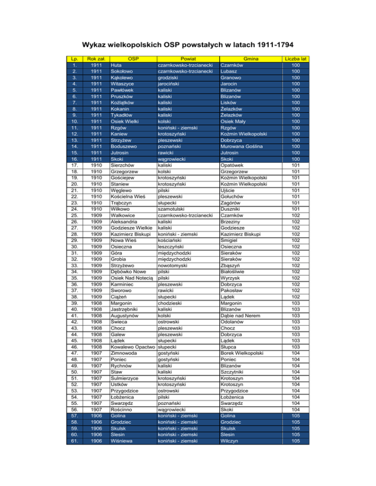 Wykaz wielkopolskich OSP powstałych w latach 1911-1794 Lp. 1. 2. 3. 4. 5. 6. 7. 8. 9. 10. 11. 12. 13. 14. 15. 16. 17. 18. 19. 20. 21. 22. 23. 24. 25. 26. 27. 28. 29. 30. 31. 32. 33. 34. 35. 36. 37. 38. 39. 40. 41. 42. 43. 44. 45. 46. 47. 48. 49. 50. 51. 52. 53. 54. 55. 56. 57. 58. 59. 60. 61. Rok zał. 1911 1911 1911 1911 1911 1911 1911 1911 1911 1911 1911 1911 1911 1911 1911 1911 1910 1910 1910 1910 1910 1910 1910 1910 1909 1909 1909 1909 1909 1909 1909 1909 1909 1909 1909 1909 1909 1909 1908 1908 1908 1908 1908 1908 1908 1908 1907 1907 1907 1907 1907 1907 1907 1907 1907 1907 1906 1906 1906 1906 1906 OSP Huta Sokołowo Kąkolewo Witaszyce Pawłówek Pruszków Koźlątków Kokanin Tykadłów Osiek Wielki Rzgów Kaniew Strzyżew Boduszewo Jutrosin Skoki Sierzchów Grzegorzew Gościejew Staniew Węglewo Kościelna Wieś Trąbczyn Wilkowo Walkowice Aleksandria Godziesze Wielkie Kazimierz Biskupi Nowa Wieś Osieczna Góra Grobia Strzyżewo Dębówko Nowe Osiek Nad Notecią Karminiec Sworowo Ciążeń Margonin Jastrzębniki Augustynów Świeca Chocz Galew Lądek Kowalewo Opactwo Zimnowoda Poniec Rychnów Staw Sulmierzyce Ustków Przygodzice Łobżenica Swarzędz Rościnno Golina Grodziec Skulsk Ślesin Wiśniewa Powiat czarnkowsko-trzcianecki czarnkowsko-trzcianecki grodziski jarociński kaliski kaliski kaliski kaliski kaliski kolski koniński - ziemski krotoszyński pleszewski poznański rawicki wągrowiecki kaliski kolski krotoszyński krotoszyński pilski pleszewski słupecki szamotulski czarnkowsko-trzcianecki kaliski kaliski koniński - ziemski kościański leszczyński międzychodzki międzychodzki nowotomyski pilski pilski pleszewski rawicki słupecki chodzieski kaliski kolski ostrowski pleszewski pleszewski słupecki słupecki gostyński gostyński kaliski kaliski krotoszyński krotoszyński ostrowski pilski poznański wągrowiecki koniński - ziemski koniński - ziemski koniński - ziemski koniński - ziemski koniński - ziemski Gmina Czarnków Lubasz Granowo Jarocin Blizanów Blizanów Lisków Żelazków Żelazków Osiek Mały Rzgów Koźmin Wielkopolski Dobrzyca Murowana Goślina Jutrosin Skoki Opatówek Grzegorzew Koźmin Wielkopolski Koźmin Wielkopolski Ujście Gołuchów Zagórów Duszniki Czarnków Brzeziny Godziesze Kazimierz Biskupi Śmigiel Osieczna Sieraków Sieraków Zbąszyń Białośliwie Wyrzysk Dobrzyca Pakosław Lądek Margonin Blizanów Dąbie nad Nerem Odolanów Chocz Dobrzyca Lądek Słupca Borek Wielkopolski Poniec Blizanów Szczytniki Krotoszyn Krotoszyn Przygodzice Łobżenica Swarzędz Skoki Golina Grodziec Skulsk Ślesin Wilczyn Liczba lat 100 100 100 100 100 100 100 100 100 100 100 100 100 100 100 100 101 101 101 101 101 101 101 101 102 102 102 102 102 102 102 102 102 102 102 102 102 102 103 103 103 103 103 103 103 103 104 104 104 104 104 104 104 104 104 104 105 105 105 105 105 Lp. 62. 63. 64. 65. 66. 67. 68. 69. Rok zał. 1906 1906 1906 1906 1906 1905 1905 1905 70. 71. 72. 73. 74. 75. 76. 77. 78. 79. 80. 81. 82. 83. 84. 85. 86. 87. 88. 89. 90. 91. 92. 93. 94. 95. 96. 97. 98. 99. 100. 101. 102. 103. 104. 105. 106. 107. 108. 109. 110. 111. 112. 113. 114. 115. 116. 117. 118. 119. 120. 121. 122. 123. 1905 1905 1905 1905 1905 1905 1905 1905 1905 1904 1904 1904 1904 1904 1904 1904 1904 1903 1903 1903 1903 1903 1902 1902 1902 1902 1902 1902 1902 1902 1902 1902 1901 1901 1901 1900 1900 1900 1900 1900 1900 1900 1900 1900 1899 1899 1899 1899 1898 1898 1898 1898 1897 1897 OSP Kobylin Maniewo Jasionna Tuliszków Morakowo Mnichowo Modliszewo Strzyżewo Smykowe Skrzetuszewo Babiak Grabienice Brody Zamość Miasteczko Kraj. Kostrzyn Obrzycko Dobra Żerków Przedecz Wilczyn Tomnice Zbąszyń Wysocko Małe Wyrzysk Dobrzyca Blizanów Kleczew Święciechowa Gowarzewo Szemborowo Piaski Lisków Dąbie Kłodawa Rychwał Święcia Rozdrażew Wielowieś Mosina Chojno Osp Ryżyn Kaczlin Szymanowice Konojad Koźminek Stawiszyn Baszków Mórkowo Rososzyca Kotłów Mrowino Pyzdry Gostyń Parkowo Zagórów Dolsk Kamionna Raszków Miłosław Węgierki Czerniejewo Iwanowice Powiat krotoszyński obornicki szamotulski turecki wągrowiecki gnieźnieński gnieźnieński gnieźnieński Kobylin Oborniki Wronki Tuliszków Gołańcz Gniezno Gniezno Gniezno Gmina gnieźnieński kolski koniński - ziemski nowotomyski ostrowski pilski poznański szamotulski turecki jarociński kolski koniński - ziemski krotoszyński nowotomyski ostrowski pilski pleszewski kaliski koniński - ziemski leszczyński poznański słupecki gostyński kaliski kolski kolski koniński - ziemski koniński - ziemski krotoszyński ostrowski poznański szamotulski międzychodzki międzychodzki pleszewski grodziski kaliski kaliski krotoszyński leszczyński ostrowski ostrzeszowski poznański wrzesiński gostyński obornicki słupecki śremski międzychodzki ostrowski wrzesiński wrzesiński gnieźnieński kaliski Kiszkowo Babiak Rzgów Lwówek Sieroszewice Miasteczko Krajeńskie Kostrzyn Obrzycko Dobra Żerków Przedecz Wilczyn Krotoszyn Zbąszyń Przygodzice Wyrzysk Dobrzyca Blizanów Kleczew Święciechowa Kleszczewo Strzałkowo Piaski Lisków Dąbie nad Nerem Kłodawa Rychwał Rychwał Rozdrażew Sieroszewice Mosina Wronki Chrzypsko Wielkie Sieraków Gizałki Kamieniec Koźminek Stawiszyn Zduny Lipno Sieroszewice Mikstat Rokietnica Pyzdry Gostyń Rogoźno Zagórów Dolsk Międzychód Raszków Miłosław Września Czerniejewo Szczytniki Liczba lat 105 105 105 105 105 106 106 106 106 106 106 106 106 106 106 106 106 107 107 107 107 107 107 107 107 108 108 108 108 108 109 109 109 109 109 109 109 109 109 109 110 110 110 111 111 111 111 111 111 111 111 111 112 112 112 112 113 113 113 113 114 114 Lp. 124. Rok zał. 1897 125. 126. 127. 128. 129. 130. 131. 132. 133. 134. 135. 136. 137. 138. 139. 140. 141. 142. 143. 144. 145. 146. 147. 148. 149. 150. 151. 152. 153. 154. 1897 1896 1896 1896 1896 1896 1896 1896 1895 1895 1895 1895 1894 1893 1893 1893 1892 1892 1892 1891 1891 1890 1890 1890 1889 1889 1889 1889 1889 1888 155. 156. 157. 15