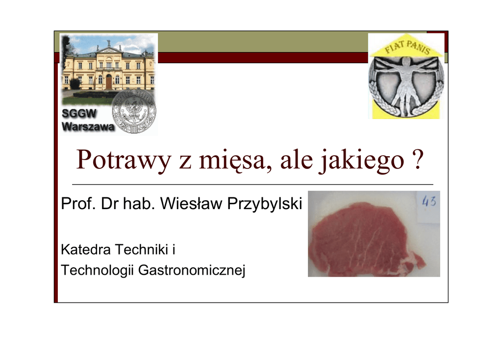 Potrawy z mięsa, ale jakiego ? Prof. Dr hab. Wiesław Przybylski Katedra Techniki i Technologii Gastronomicznej Struktura i spożycie ogółem mięsa w Europie (Food Balance Sheets, FAO, 2003) Struktura spożycia poszczególnych gatunków mięsa w Polsce w 2004 roku (GUS) inne 1% 8% wołowe 33% drobiowe wieprzowina 58% 120 100 80 Przetwory mięsne i podroby 60 40 20 Mięso surowe 0 1 Wydatki na żywność stanowią około 1/3 wydatków ogółem budżetu przeciętnego gospodarstwa domowego, w tym na mięso i jego przetwory 1/3 stanowi około 7-10% ŹRÓDŁO AMINOKWASÓW EGZOGENNYCH AMINOKWAS DZIAŁ DZIAŁANIE Fenyloalanina prekursor adrenaliny i noradrenaliny, hormonó hormonów tarczycy oraz barwnikó barwników melaninowych wł włosó osów i skó skóry, jest naturalną naturalną substancją substancją przeciwdepresyjną przeciwdepresyjną, zmniejsza odczuwanie bó bólu Tryptofan wykorzystywany do syntezy kwasu nikotynowego czyli niacyny zwanej zwanej witaminą witaminą PP oraz serotoniny – hormonu tkankowego wpł wpływają ywającego na ciś ciśnienie krwi i pobudzenie perystaltyki jelit Walina niezbę niezbędna do prawidł prawidłowego funkcjonowania ukł układu nerwowego odpowiadają odpowiadającego za odbieranie bodź bodźców czuciowych oraz jest niezbę niezbędna w procesach wytwarzania hemoglobiny i uwalniania energii Izoleucyna jeden z trzech aminokwasó aminokwasów redukują redukujących stres, niezbę niezbędna jest też też w procesie wytwarzania hemoglobiny i uwalniania energii Leucyna poprzez umoż umożliwienie syntezy odpowiednich biał białek ma fundamentalne znaczenie w procesach wzrostowych takich jak rozwó ni i skó rozwój koś kości, mięś mięśni skóry Lizyna ma szczegó szczególne znaczenie dla zdrowia skó skóry i koś kości, sprzyja tworzeniu się się zdrowego kolagenu oraz umoż umożliwia skuteczne wykorzystywanie wapnia Treonina niezbę niezbędna dla tworzenia prawidł prawidłowego ukł układu odpornoś odpornościowego, sprzyja dobrej kondycji zdrowotnej skó skóry, koś kości oraz prawidł prawidłowemu wykształ wykształcaniu się się szkliwa zę zębów, ponadto wspiera funkcjonowanie tarczycy Metionina należ należy do aminokwasó aminokwasów siarkowych; jest waż ważna dla przemian metabolicznych, szczegó szczególnie tłtłuszczó uszczów, peł ł ni w organizmie funkcje przeciw utleniacza pe Histydyna nieodzowna w procesie powstawania krwinek czerwonych i biał białych sprzyja procesom regeneracji i naprawy uszkodzonych tkanek. Ponadto jest substancją substancją wyjś wyjściową ciową do produkcji waż ważnego neuroprzekaź neuroprzekaźnika – histaminy, któ która jest niezbę niezbędna w reakcjach odpornoś odpornościowych organizmu. Źródło związków mineralnych i witamin niezbędnych we wzroście i rozwoju płodu oraz prawidłowym funkcjonowaniu naszego organizmu. Należą do nich min: Potas, fosfor , sód, magnez, żelazo, selen, cynk, witamina A czy kwas foliowy. chuda wieprzowina zawiera: •1,8mg żelaza, •2,6mg cynku, wątroba świń zawiera: • 360mg magnezu, • 20mg żelaza •60µg selenu na 100g. Mięso i wątroba (100g/dzień) jest w stanie pokryć 50% dobowego zapotrzebowania na żelazo, cynk, selen, witaminy B12, B1, B2, B6 i 100% witaminy A (Biesalski, 2005 – Uniwersytet w Hohenhaim). Zawartość składników mineralnych w wieprzowinie (Monin 2008) Ca P Fe Na K Mg Zn 9 175 2,3 70 285 18 2,4 Ogólna definicja jakości mięsa (Jurczak 2005 i uzupełnienia własne) Przyczyny pogarszania jakości mięsa : l· Zmiany w genotypie zwierząt l· Intensyfikacja metod chowu, utrzymania i żywienia l· Pojawienie się stresogennych warunków obrotu przedubojowego i uboju (ubój na dużą skalę, daleki transport, kilkakrotna manipulacja zwierzętami, stłoczenie zwierząt, duża przepustowość zakładów mięsnych, rygory technologiczne) Wpływu energetycznego metabolizmu mięśni na jakość organoleptyczną mięsa (Hoquette i wsp. 1998) Wpływ poziomu tłuszczu śródmięśniowego na jakość technologiczną i jakość sensoryczną mięsa wieprzowego w mięśniu Longissimus (Przybylski i wsp. 2007) Zawartość tłuszczu śródmięśniowego (%) Traits <1,0 1,1 – 2,0 2,1 – 3,0 >3,0 Wyciek naturalny (%) 4,90a 4,42a 2,89b 2,32a Wydajność w gotowaniu (%) 71,92 78,21 83,19 84,35 Marmurkowatość (0-10 j.u.) 3,08a 3,89b 4,98c 6,36d Akceptowalność (0-10 j.u.) 6,15a 6,40a 5,54ab 4,92b Kruchość (0-10 j.u.) 6,43a 6,65a 7,88b 7,18a Soczystość (0-10 j.u.) 5,18a 5,77ab 6,38b 6,58b Smakowitość (0-10 j.u.) 6,46a 7,00b 7,40bc 7,68c Jakość ogólna (0-10 j.u.) 6,23a 6,43b 7,03bc 7,06c Geny główne Wpływ genu wrażliwości na stres na wartość rzeźną świń Wpływ genu hypertrofii na wartość rzeźną bydła Genotyp halotanowy Cecha OH GK nn Nn NN 63,8 57,9 Mięso w tuszy (%) 60,6 59,8 57,1 Wydajność rzeźna (%) Wyd. rzeźna(%) 76,6 76,7 75,9 125,1 77,3 % mięsa PSE 51 16 6 Powierzchnia m. LD (cm2) Upadki(%) 5 2 2 -0,83 +3,3 - Mięso 80,8 66,6 Tłuszcz 5,7 17,1 Kości 13,5 16,3 Cecha Efekt ek. (w £) Skład tuszy (%) Ogólna częstość występowania mięsa wadliwego w Polsce oraz szacunkowa wielkość strat Roczne szacunkowe straty z powodu występowania mięsa PSE i RSE wynoszą około 140 mln zł tj. 2,4% wartości ubijanych zwierząt (Pospiech i wsp. 1989) 17% 13% 60% 5% 5% PSE RSE "kwaśne" DFD Normalne Szacunkowe straty związane ze zwiększonym wyciekiem soku mięsnego w Niemczech (Fischer 2005) Zmiany pH w tkance mięśniowej post mortem dla różnych klas jakościowych mięsa pH 7.0 DFD 6.5 6.0 NORMALNE PSE 5.5 RSE MIĘSO KWAŚNE 1 2 3 4 24 5 6 godziny post mortem RSE Nowe wady mięsa Właściwości mięsa normalnego i wadliwego (Koćwin-Podsiadła i wsp. 2006) Cechy Trwałość Wiązanie wody Ubytki masy mięsa surowego (WN48) Ubytki masy w peklowaniu i wędzeniu (72oC) RTN(%) Barwa (L-jasność) Normalne normalna normalne normalne (2-6%) normalne ≥91 prawidłowa (