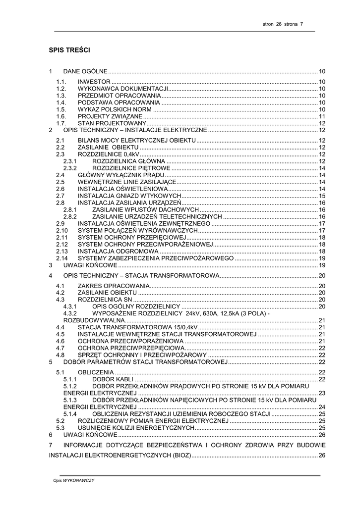 stron 26 strona 7 SPIS TREŚCI 1 DANE OGÓLNE .............................................................................................................................. 10 1.1. INWESTOR ............................................................................................................................ 10 1.2. WYKONAWCA DOKUMENTACJI.......................................................................................... 10 1.3. PRZEDMIOT OPRACOWANIA.............................................................................................. 10 1.4. PODSTAWA OPRACOWANIA .............................................................................................. 10 1.5. WYKAZ POLSKICH NORM ................................................................................................... 10 1.6. PROJEKTY ZWIĄZANE ......................................................................................................... 11 1.7. STAN PROJEKTOWANY....................................................................................................... 12 2 OPIS TECHNICZNY – INSTALACJE ELEKTRYCZNE .................................................................. 12 2.1 BILANS MOCY ELEKTRYCZNEJ OBIEKTU......................................................................... 12 2.2 ZASILANIE OBIEKTU ........................................................................................................... 12 2.3 ROZDZIELNICE 0,4kV ........................................................................................................... 12 2.3.1 ROZDZIELNICA GŁÓWNA ........................................................................................... 12 2.3.2 ROZDZIELNICE PIĘTROWE ........................................................................................ 14 2.4 GŁÓWNY WYŁĄCZNIK PRĄDU............................................................................................ 14 2.5 WEWNĘTRZNE LINIE ZASILAJĄCE..................................................................................... 14 2.6 INSTALACJA OŚWIETLENIOWA.......................................................................................... 14 2.7 INSTALACJA GNIAZD WTYKOWYCH.................................................................................. 15 2.8 INSTALACJA ZASILANIA URZĄDZEŃ.................................................................................. 16 2.8.1 ZASILANIE WPUSTÓW DACHOWYCH ....................................................................... 16 2.8.2 ZASILANIE URZADZEŃ TELETECHNICZNYCH ......................................................... 16 2.9 INSTALACJA OŚWIETLENIA ZEWNĘTRZNEGO ................................................................ 17 2.10 SYSTEM POŁĄCZEŃ WYRÓWNAWCZYCH........................................................................ 17 2.11 SYSTEM OCHRONY PRZEPIĘCIOWEJ............................................................................... 18 2.12 SYSTEM OCHRONY PRZECIWPORAŻENIOWEJ............................................................... 18 2.13 INSTALACJA ODGROMOWA ............................................................................................... 18 2.14 SYSTEMY ZABEZPIECZENIA PRZECIWPOŻAROWEGO .................................................. 19 3 UWAGI KOŃCOWE ........................................................................................................................ 19 4 OPIS TECHNICZNY – STACJA TRANSFORMATOROWA........................................................... 20 4.1 ZAKRES OPRACOWANIA..................................................................................................... 20 4.2 ZASILANIE OBIEKTU ............................................................................................................ 20 4.3 ROZDZIELNICA SN ............................................................................................................... 20 4.3.1 OPIS OGÓLNY ROZDZIELNICY .................................................................................. 20 4.3.2 WYPOSAŻENIE ROZDZIELNICY 24kV, 630A, 12,5kA (3 POLA) ROZBUDOWYWALNA.................................................................................................................... 21 4.4 STACJA TRANSFORMATOROWA 15/0,4kV........................................................................ 21 4.5 INSTALACJE WEWNĘTRZNE STACJI TRANSFORMATOROWEJ .................................... 21 4.6 OCHRONA PRZECIWPORAŻENIOWA ................................................................................ 21 4.7 OCHRONA PRZECIWPRZEPIĘCIOWA................................................................................ 22 4.8 SPRZĘT OCHRONNY I PRZECIWPOŻAROWY .................................................................. 22 5 DOBÓR PARAMETRÓW STACJI TRANSFORMATOROWEJ...................................................... 22 5.1 OBLICZENIA .......................................................................................................................... 22 5.1.1 DOBÓR KABLI .............................................................................................................. 22 5.1.2 DOBÓR PRZEKŁADNIKÓW PRĄDOWYCH PO STRONIE 15 kV DLA POMIARU ENERGII ELEKTRYCZNEJ ............................................................................................................ 23 5.1.3 DOBÓR PRZEKŁADNIKÓW NAPIĘCIOWYCH PO STRONIE 15 kV DLA POMIARU ENERGII ELEKTRYCZNEJ ............................................................................................................ 24 5.1.4 OBLICZENIA REZYSTANCJI UZIEMIENIA ROBOCZEGO STACJI ............................ 25 5.2 ROZLICZENIOWY POMIAR ENERGII ELEKTRYCZNEJ ..................................................... 25 5.3 USUNIĘCIE KOLIZJI ENERGETYCZNYCH.......................................................................... 25 6 UWAGI KOŃCOWE ...........................................................................