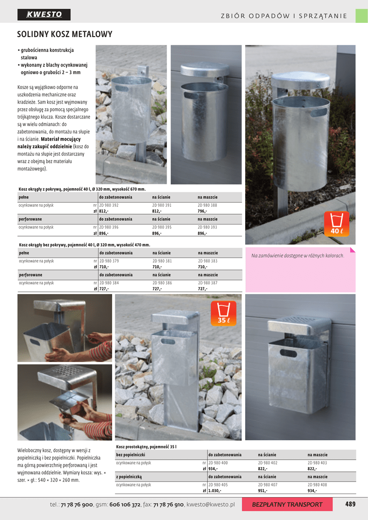 Z B I Ó R O D PA D Ó W I S P R Z ĄTA N I E SOLIDNY KOSZ METALOWY •grubościenna konstrukcja stalowa •wykonany z blachy ocynkowanej ogniowo o grubości 2 – 3 mm Kosze są wyjątkowo odporne na uszkodzenia mechaniczne oraz kradzieże. Sam kosz jest wyjmowany przez obsługę za pomocą specjalnego trójkątnego klucza. Kosze dostarczane są w wielu odmianach: do zabetonowania, do montażu na słupie i na ścianie. Materiał mocujący należy zakupić oddzielnie (kosz do montażu na słupie jest dostarczany wraz z obejmą bez materiału montażowego). Kosz okrągły z pokrywą, pojemność 40 l, Ø 320 mm, wysokość 670 mm. pełne do zabetonowania ocynkowane na połysk perforowane nr 2D 980 392 zł 812,do zabetonowania ocynkowane na połysk nr 2D 980 396 zł 896,- na ścianie na maszcie 2D 980 391 812,- 2D 980 388 796,- na ścianie na maszcie 2D 980 395 896,- 2D 980 393 896,- na ścianie na maszcie 2D 980 381 710,- 2D 980 383 710,- na ścianie na maszcie 2D 980 386 727,- 2D 980 387 727,- 40 l Kosz okrągły bez pokrywy, pojemność 40 l, Ø 320 mm, wysokość 470 mm. pełne do zabetonowania ocynkowane na połysk perforowane nr 2D 980 379 zł 710,do zabetonowania ocynkowane na połysk nr 2D 980 384 zł 727,- Na zamówienie dostępne w różnych kolorach. 35 l Wieloboczny kosz, dostępny w wersji z popielniczką i bez popielniczki. Popielniczka ma górną powierzchnię perforowaną i jest wyjmowana oddzielnie. Wymiary kosza: wys. × szer. × gł.: 540 × 320 × 260 mm. Kosz prostokątny, pojemność 35 l bez popielniczki ocynkowane na połysk z popielniczką ocynkowane na połysk do zabetonowania nr 2D 980 400 zł 934,do zabetonowania nr 2D 980 405 zł 1.030,- tel.: 71 78 76 900, gsm: 606 106 372, fax: 71 78 76 910, [email protected] na ścianie na maszcie 2D 980 402 822,- 2D 980 403 822,- na ścianie na maszcie 2D 980 407 951,- 2D 980 408 934,- BEZPŁATNY TRANSPORT 489