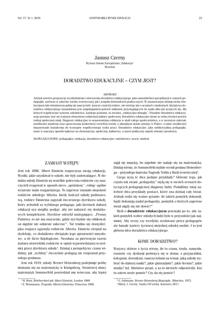 Vol. 17, Nr 1, 2016 GOSPODARKA RYNEK EDUKACJA 23 Janusz Czerny Wyższa Szkoła Zarządzania „Edukacja” Wrocław DORADZTWO EDUKACYJNE – CZYM JEST? ABSTRAKT Artykuł zawiera propozycję wyodrębnienia i utworzenia doradztwa edukacyjnego, jako samodzielnej specjalizacji w ramach pe− dagogiki, zarówno w zakresie wiedzy teoretycznej, jak i zespołu doświadczeń praktycznych. W zmasowanym dzisiaj ruchu edu− kacyjnym lub oświatowym gubią się nauczyciele, jeszcze częściej rodzice, nie mówiąc już o uczniach i studentach. Inicjatywa do− radztwa edukacyjnego uzasadniona jest zaspokajaniem potrzeb milionów przystępujących do nauki albo już uczących się, dla których współczesne systemy szkolnictwa, każdego poziomu, to swoista „edukacyjna dżungla”. Poradnie doradztwa edukacyj− nego powinny stać się ważnym elementem codziennej kultury społecznej. Doradztwo edukacyjne niesie ze sobą również pewien rodzaj społecznej misji. Diagnozy edukacyjne to sensowniejsza edukacja w skali całego społeczeństwa, a w szerszym zakresie możliwości ustalenia oraz opracowania konkretnej i rzetelnej wiedzy o aktualnym stanie oświaty w Polsce, a także możliwości dopasowanie kształcenia do wymogów współczesnego rynku pracy. Doradztwo edukacyjne, jako subdyscyplina pedagogiki, może w znaczący sposób wpływać na ekonomiczny, społeczny, kulturowy, a nawet polityczny aspekt oświaty narodowej. SŁOWA KLUCZOWE: pedagogika; edukacja; doradztwo edukacyjne; szkolnictwo; uczeń; student ZAMIAST WSTĘPU zajął się muzyką, bo zupełnie nie nadaje się na matematyka. Dzisiaj wiemy, że Sommerfeld mylnie ocenił geniusz Heisenber− ga – przyszłego laureata Nagrody Nobla z fizyki teoretycznej3. Czego uczą te dwa podane przykłady? Głównie tego, jak często tak zwani „pedagodzy” mylą się w swoich ocenach do− tyczących pedagogicznej diagnozy ludzi. Podaliśmy tutaj za− ledwie dwa przykłady postaci, które zna dzisiaj cały świat. Jednak rodzi się ważne pytanie: ile takich pomyłek dokonali, bądź dokonują nadal pedagodzy, pomyłek o których zapewne świat nigdy się nie dowie?4 Myśl o doradztwie edukacyjnym powstała po to, aby ta− kich pomyłek wobec młodych ludzi było w przyszłości jak naj− mniej. Aby oceny czy werdykty wydawane przez pedagogów nie łamały kariery życiowej niejednej młodej osobie. I to jest główna idea doradztwa edukacyjnego. Jest rok 1896, Albert Einstein rozpoczyna swoją edukację. Wyniki, jakie uzyskiwał w szkole, nie były zadowalające. W do− datku młody Einstein na wszelkie polecenia rodziców czy nau− czycieli reagował w sposób nieco „spóźniony”, robiąc ogólne wrażenie mało rozgarniętego. To zapewne musiało niepokoić rodziców młodego Alberta. Kiedy kończył szkołę podstawo− wą, rodzice Einsteina zapytali ówczesnego dyrektora szkoły, który uchodził za wybitnego pedagoga, jaki kierunek dalszej edukacji syn mógłby podjąć, aby nie nabawić się dodatko− wych kompleksów. Dyrektor odrzekł następująco: „Proszę Państwa, to nie ma znaczenie, gdzie syn będzie się edukował, on nigdzie nie odniesie sukcesu”1. Nie trudno się domyśleć, jaka rozpacz ogarnęła rodziców Alberta. Einstein cierpiał na dysleksję, co dodatkowo obciążało jego sprawności umysło− we, a de facto fizjologiczne. Niezdana za pierwszym razem matura utwierdziła rodziców w opinii wypowiedzianej wcześ− niej przez dyrektora szkoły2. Dzisiaj z perspektywy czasu wi− dzimy, jak „wybitny” ówcześnie pedagog nie rozpoznał przy− szłego geniusza. Jest rok 1919, młody Werner Heisenberg podejmuje próbę dostania się na matematykę w Königsberg. Światowej sławy matematyk Sommerfeld powiedział mu wówczas, aby lepiej Wszyscy dobrze z życia wiemy, ile to czasu, trudu, namysłu, rozmów czy dyskusji poświęca się w domu, z przyjaciółmi, kolegami, dorosłymi, nauczycielami na temat: jaką szkołę wy− brać do dalszej nauki?, jakie gimnazjum?, jakie liceum?, jakie studia? itd. Mnóstwo pytań, a za to niewiele odpowiedzi. Kto tu zatem może pomóc? Czy da się pomóc? ____________ 1 M. Born, Briefwechsel mit Albert Einstein, London 1969. 2 E. Weissmann, Tragedia Alberta Einsteina, Princeton 1969. ____________ 3 G. Submann, Werner Heisenberg Biography, München, 1975. 4 Bliżej: J. Czerny, Nauka XXI wieku, Katowice 2011. KOMU DORADZTWO? 24 DORADZTWO EDUKACYJNE – CZYM JEST? Odpowiedź jest następująca – precyzyjnie nie da się po− móc, bowiem psychika pracuje na zasadach kwantowych. Jed− nak z całą pewnością można uniknąć „falstartu”, czyli dra− stycznej pomyłki. Doradztwo edukacyjne stawia sobie za cel „diagnozowanie” młodych osób z myślą o ich dalszej eduka− cji. Dodajmy, że chodzi tutaj o taki styl edukacji, kiedy młody człowiek nie spotka się z rozczarowaniem czy klęską. Czego zatem należy spodziewać się w ramach takiego doradztwa? Doradztwo edukacyjne wskazuje czy zwraca uwagę na na− stępujące kwestie; – czego młoda osoba z pewnością nie powinna się uczyć czy studiować; – ustalenie preferencji młodej osoby w zakresie jej możli− wości umysłowych czy obszaru zainteresowań; – wskazanie tych obszarów psyche, w których przejawiają się maksymalne zainteresowania (np. muzyka, humanis− tyka, artyzm, kreacja, nauki przyrodnicze, menedżerstwo, walory opiekuńcze); – w ramach doradztwa ustalenie jakie cechy czy walory psychiczne posiada młoda osoba, jakie jest jej „wyposa− żenie” psychiczne (porywcza, spokojna, cierpliwa, opano− wana, nadpobudliwa, frustrat, typ melancholika, potra− fiąca albo nie skupić się, skoncentrować itd.). Pedagog dokonujący diagnozy powinien pozyskać wiedzę na temat dotychczasowej historii nauki szkolnej, sposobu za− chowania się wśród rówieśników, trybu życia, warunków by− towych, pola zainteresowań. Czy dziecko lub nastolatek po− siada jakieś hobby,