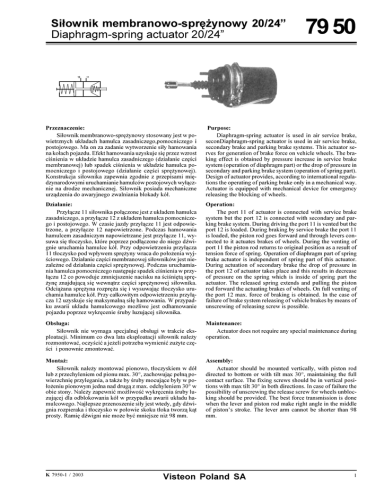 Si³ownik membranowo-sprê¿ynowy 20/24 Diaphragm-spring actuator 20/24 79 50 Przeznaczenie: Si³ownik membranowo-sprê¿ynowy stosowany jest w powietrznych uk³adach hamulca zasadniczego,pomocniczego i postojowego. Ma on za zadanie wytworzenie si³y hamowania na ko³ach pojazdu. Efekt hamowania uzyskuje siê przez wzrost cinienia w uk³adzie hamulca zasadniczego (dzia³anie czêci membranowej) lub spadek cinienia w uk³adzie hamulca pomocniczego i postojowego (dzia³anie czêci sprê¿ynowej). Konstrukcja si³ownika zapewnia zgodnie z przepisami miêdzynarodowymi uruchamianie hamulców postojowych wy³¹cznie na drodze mechanicznej. Si³ownik posiada mechaniczne urz¹dzenia do awaryjnego zwalniania blokady kó³. Purpose: Diaphragm-spring actuator is used in air service brake, seconDiaphragm-spring actuator is used in air service brake, secondary brake and parking brake systems. This actuator serves for generation of brake force on vehicle wheels. The braking effect is obtained by pressure increase in service brake system (operation of diaphragm part) or the drop of pressure in secondary and parking brake system (operation of spring part). Design of actuator provides, according to international regulations the operating of parking brake only in a mechanical way. Actuator is equipped with mechanical device for emergency releasing the blocking of wheels. Dzia³anie: Przy³¹cze 11 si³ownika po³¹czone jest z uk³adem hamulca zasadniczego, a przy³¹cze 12 z uk³adem hamulca pomocniczego i postojowego. W czasie jazdy przy³¹cze 11 jest odpowietrzone, a przy³¹cze 12 napowietrzone. Podczas hamowania hamulcem zasadniczym napowietrzane jest przy³¹cze 11, wysuwa siê t³oczysko, które poprzez pod³¹czone do niego dwignie uruchamia hamulce kó³. Przy odpowietrzeniu przy³¹cza 11 t³oczysko pod wp³ywem sprê¿yny wraca do po³o¿enia wyjciowego. Dzia³anie czêci membranowej si³owników jest niezale¿ne od dzia³ania czêci sprê¿ynowej. Podczas uruchamiania hamulca pomocniczego nastêpuje spadek cinienia w przy³¹czu 12 co powoduje zmniejszenie nacisku na ciniêt¹ sprê¿ynê znajduj¹c¹ siê wewn¹trz czêci sprê¿ynowej si³ownika. Odci¹¿ana sprê¿yna rozprê¿a siê i wysuwaj¹c t³oczysko uruchamia hamulce kó³. Przy ca³kowitym odpowietrzeniu przy³¹cza 12 uzyskuje siê maksymaln¹ si³ê hamowania. W przypadku awarii uk³adu hamulcowego mo¿liwe jest odhamowanie pojazdu poprzez wykrêcenie ruby luzuj¹cej si³ownika. Operation: The port 11 of actuator is connected with service brake system but the port 12 is connected with secondary and parking brake system. During driving the port 11 is vented but the port 12 is loaded. During braking by service brake the port 11 is loaded, the piston rod goes forward and through levers connected to it actuates brakes of wheels. During the venting of port 11 the piston rod returns to original position as a result of tension force of spring. Operation of diaphragm part of spring brake actuator is independent of spring part of this actuator. During actuation of secondary brake the drop of pressure in the port 12 of actuator takes place and this results in decrease of pressure on the spring which is inside of spring part the actuator. The released spring extends and pulling the piston rod forward the actuating brakes of wheels. On full venting of the port 12 max. force of braking is obtained. In the case of failure of brake system releasing of vehicle brakes by means of unscrewing of releasing screw is possible. Obs³uga: Si³ownik nie wymaga specjalnej obs³ugi w trakcie eksploatacji. Minimum co dwa lata eksploatacji si³ownik nale¿y rozmontowaæ, oczyciæ a je¿eli potrzeba wymieniæ zu¿yte czêci i ponownie zmontowaæ. Maintenance: Actuator does not require any special maintenance during operation. Monta¿: Si³ownik nale¿y montowaæ pionowo, t³oczyskiem w dó³ lub z przechyleniem od pionu max. 30°, zachowuj¹c pe³n¹ powierzchniê przylegania, a tak¿e by ruby mocuj¹ce by³y w po³o¿eniu pionowym jedna nad drug¹ z max. odchyleniem 30° w obie stony. Nale¿y zapewniæ mo¿liwoæ wykrêcenia ruby luzuj¹cej dla odblokowania kó³ w przypadku awarii uk³adu hamulcowego. Najlepsze przenoszenie si³y jest wtedy, gdy dwignia rozpieraka i t³oczysko w po³owie skoku t³oka tworz¹ k¹t prosty. Ramiê dwigni nie mo¿e byæ mniejsze ni¿ 98 mm. Assembly: Actuator should be mounted vertically, with piston rod directed to bottom or with tilt max 30°, maintaining the full contact surface. The fixing screws should be in vertical positions with max tilt 30° in both directions. In case of failure the possibility of unscrewing the release screw for wheels unblocking should be provided. The best force transmission is done when the lever and piston rod make right angle in the middle of pistons stroke. The lever arm cannot be shorter than 98 mm. K 7950-1 / 2003 Visteon Poland SA 1 Dane techniczne / Specification Czynnik pracy / Working medium Cinienie pracy / Operating pressure Temp.zakres pracy / Temp. range of operation Skok si³ownika membranowego / Stroke of diaphragm actuator Skok si³ownika sprê¿ynowego / Stroke of spring actuator Odchylenie t³oczyska / Tilt of piston rod Moment dokrêcenia nakrêtek / Torque of nuts Moment dokrêcenia ruby luzuj¹cej / Screwing torque in of releasing screw Moment odkrêcenia ruby luzuj¹cej / Unscrewing torque of releasing screw Masa / Mass Przy³¹cza / Ports 11, 12 MPa °C mm mm ° Nm Nm Nm kg mm powietrze/air max. 0,8 -40÷+80 57 67 3 180+30 40÷50 10÷25 ~10,5 M16x1,5 Odmiany / Variations: Odmiana Variation 79 50 014 79 50 015 79 50 022 79 50 023 0 0 0 0 a [ °] 270 90 270 90 b [ °] 45 135 45 135 g [ °] 180 180 180 180 L [mm] 65 65 75 75 A [mm] Æ14H8 +0,12 Æ14H8 Æ14H8 Æ14H8 B [mm] 14B12 14B12 14B12 14B12 Filtr + + + + skok/stroke filtr gumowy / rubber filter Charakterystyki pracy / Performance characteristics: Czêæ membranowa / Diaphragm part Wykres zale¿noci si³y od skoku przy cin