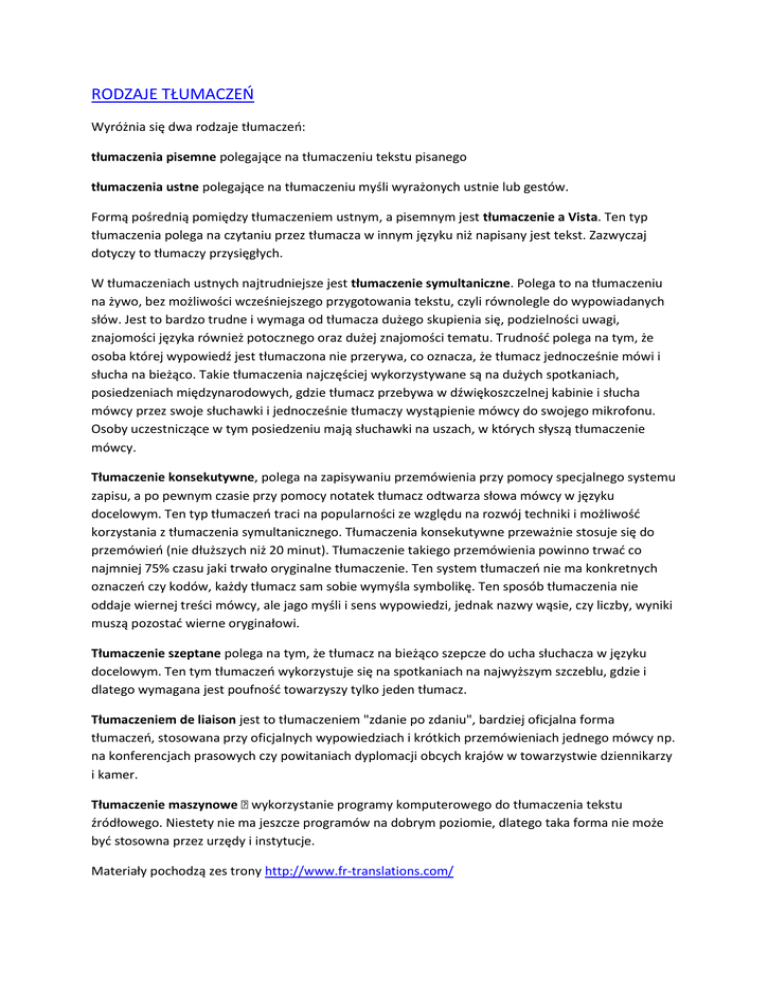RODZAJE TŁUMACZEŃ Wyróżnia się dwa rodzaje tłumaczeń: tłumaczenia pisemne polegające na tłumaczeniu tekstu pisanego tłumaczenia ustne polegające na tłumaczeniu myśli wyrażonych ustnie lub gestów. Formą pośrednią pomiędzy tłumaczeniem ustnym, a pisemnym jest tłumaczenie a Vista. Ten typ tłumaczenia polega na czytaniu przez tłumacza w innym języku niż napisany jest tekst. Zazwyczaj dotyczy to tłumaczy przysięgłych. W tłumaczeniach ustnych najtrudniejsze jest tłumaczenie symultaniczne. Polega to na tłumaczeniu na żywo, bez możliwości wcześniejszego przygotowania tekstu, czyli równolegle do wypowiadanych słów. Jest to bardzo trudne i wymaga od tłumacza dużego skupienia się, podzielności uwagi, znajomości języka również potocznego oraz dużej znajomości tematu. Trudność polega na tym, że osoba której wypowiedź jest tłumaczona nie przerywa, co oznacza, że tłumacz jednocześnie mówi i słucha na bieżąco. Takie tłumaczenia najczęściej wykorzystywane są na dużych spotkaniach, posiedzeniach międzynarodowych, gdzie tłumacz przebywa w dźwiękoszczelnej kabinie i słucha mówcy przez swoje słuchawki i jednocześnie tłumaczy wystąpienie mówcy do swojego mikrofonu. Osoby uczestniczące w tym posiedzeniu mają słuchawki na uszach, w których słyszą tłumaczenie mówcy. Tłumaczenie konsekutywne, polega na zapisywaniu przemówienia przy pomocy specjalnego systemu zapisu, a po pewnym czasie przy pomocy notatek tłumacz odtwarza słowa mówcy w języku docelowym. Ten typ tłumaczeń traci na popularności ze względu na rozwój techniki i możliwość korzystania z tłumaczenia symultanicznego. Tłumaczenia konsekutywne przeważnie stosuje się do przemówień (nie dłuższych niż 20 minut). Tłumaczenie takiego przemówienia powinno trwać co najmniej 75% czasu jaki trwało oryginalne tłumaczenie. Ten system tłumaczeń nie ma konkretnych oznaczeń czy kodów, każdy tłumacz sam sobie wymyśla symbolikę. Ten sposób tłumaczenia nie oddaje wiernej treści mówcy, ale jago myśli i sens wypowiedzi, jednak nazwy wąsie, czy liczby, wyniki muszą pozostać wierne oryginałowi. Tłumaczenie szeptane polega na tym, że tłumacz na bieżąco szepcze do ucha słuchacza w języku docelowym. Ten tym tłumaczeń wykorzystuje się na spotkaniach na najwyższym szczeblu, gdzie i dlatego wymagana jest poufność towarzyszy tylko jeden tłumacz. Tłumaczeniem de liaison jest to tłumaczeniem "zdanie po zdaniu", bardziej oficjalna forma tłumaczeń, stosowana przy oficjalnych wypowiedziach i krótkich przemówieniach jednego mówcy np. na konferencjach prasowych czy powitaniach dyplomacji obcych krajów w towarzystwie dziennikarzy i kamer. Tłumaczenie maszynowe wykorzystanie programy komputerowego do tłumaczenia tekstu źródłowego. Niestety nie ma jeszcze programów na dobrym poziomie, dlatego taka forma nie może być stosowna przez urzędy i instytucje. Materiały pochodzą zes trony http://www.fr-translations.com/