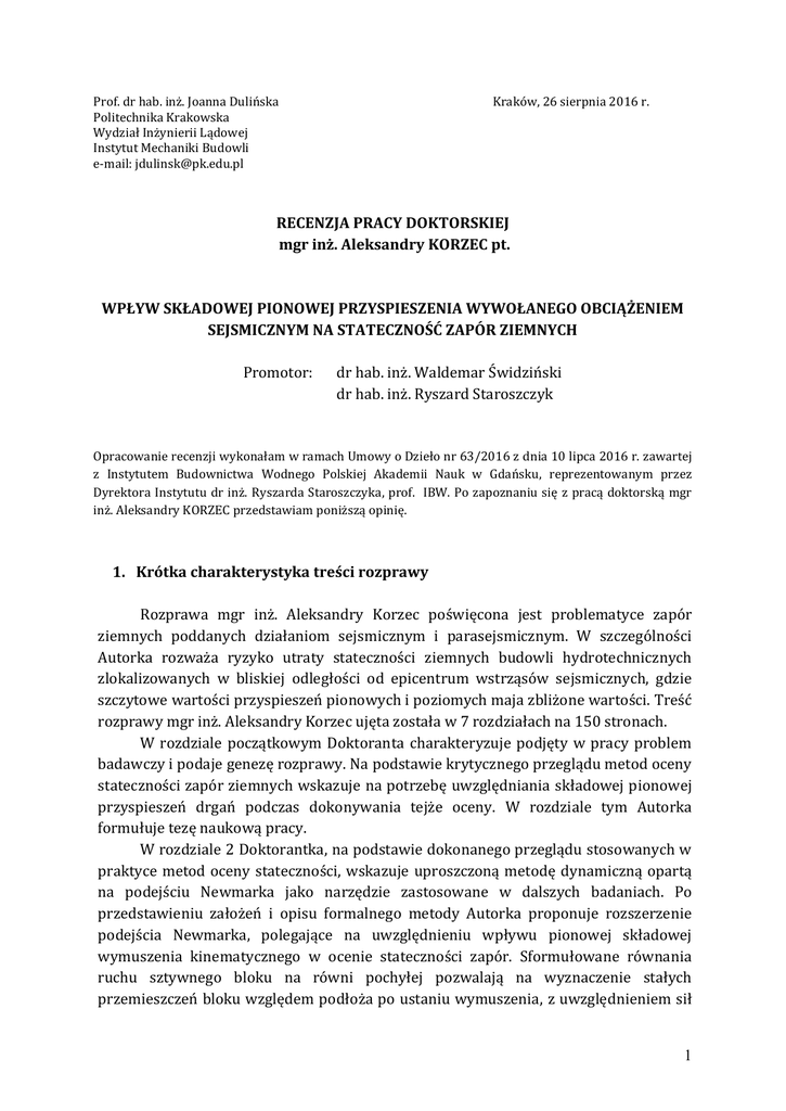 Prof. dr hab. inż. Joanna Dulińska Politechnika Krakowska Wydział Inżynierii Lądowej Instytut Mechaniki Budowli e-mail: [email protected] Kraków, 26 sierpnia 2016 r. RECENZJA PRACY DOKTORSKIEJ mgr inż. Aleksandry KORZEC pt. WPŁYW SKŁADOWEJ PIONOWEJ PRZYSPIESZENIA WYWOŁANEGO OBCIĄŻENIEM SEJSMICZNYM NA STATECZNOŚĆ ZAPÓR ZIEMNYCH Promotor: dr hab. inż. Waldemar Świdziński dr hab. inż. Ryszard Staroszczyk Opracowanie recenzji wykonałam w ramach Umowy o Dzieło nr 63/2016 z dnia 10 lipca 2016 r. zawartej z Instytutem Budownictwa Wodnego Polskiej Akademii Nauk w Gdańsku, reprezentowanym przez Dyrektora Instytutu dr inż. Ryszarda Staroszczyka, prof. IBW. Po zapoznaniu się z pracą doktorską mgr inż. Aleksandry KORZEC przedstawiam poniższą opinię. 1. Krótka charakterystyka treści rozprawy Rozprawa mgr inż. Aleksandry Korzec poświęcona jest problematyce zapór ziemnych poddanych działaniom sejsmicznym i parasejsmicznym. W szczególności Autorka rozważa ryzyko utraty stateczności ziemnych budowli hydrotechnicznych zlokalizowanych w bliskiej odległości od epicentrum wstrząsów sejsmicznych, gdzie szczytowe wartości przyspieszeń pionowych i poziomych maja zbliżone wartości. Treść rozprawy mgr inż. Aleksandry Korzec ujęta została w 7 rozdziałach na 150 stronach. W rozdziale początkowym Doktoranta charakteryzuje podjęty w pracy problem badawczy i podaje genezę rozprawy. Na podstawie krytycznego przeglądu metod oceny stateczności zapór ziemnych wskazuje na potrzebę uwzględniania składowej pionowej przyspieszeń drgań podczas dokonywania tejże oceny. W rozdziale tym Autorka formułuje tezę naukową pracy. W rozdziale 2 Doktorantka, na podstawie dokonanego przeglądu stosowanych w praktyce metod oceny stateczności, wskazuje uproszczoną metodę dynamiczną opartą na podejściu Newmarka jako narzędzie zastosowane w dalszych badaniach. Po przedstawieniu założeń i opisu formalnego metody Autorka proponuje rozszerzenie podejścia Newmarka, polegające na uwzględnieniu wpływu pionowej składowej wymuszenia kinematycznego w ocenie stateczności zapór. Sformułowane równania ruchu sztywnego bloku na równi pochyłej pozwalają na wyznaczenie stałych przemieszczeń bloku względem podłoża po ustaniu wymuszenia, z uwzględnieniem sił 1 dynamicznych prostopadłych do powierzchni poślizgu (wprowadzają również składową pionową wymuszenia). W rozdziale 3 przedstawiono eksperymenty laboratoryjne mające na celu rozeznanie zachowań dynamicznych sztywnego bloku pod wpływem wymuszeń kinematycznych. Doświadczenia prowadzono na dwóch różnych stanowiskach badawczych pozwalających na realizację wymuszeń cyklicznych. Przeprowadzono serię doświadczeń dla różnych materiałów pokrywających powierzchnię równi i bloku oraz dla różnych kątów nachylenia równi. Zasadniczym celem przeprowadzonych badań eksperymentalnych było uzyskanie danych doświadczalnych potrzebnych do weryfikacji modelu obliczeniowego ruchu bloku sztywnego na równi pochyłej pod wpływem złożonego (jedno- lub dwukierunkowego) dynamicznego wymuszenia kinematycznego. W rozdziale 4 pracy porównano wyniki eksperymentów z wynikami otrzymanymi na drodze numerycznej. Uzyskana zgodność wyników pozwoliła na pozytywną weryfikację modelu zaproponowanego w rozszerzonej metodzie Newmarka. W rozdziale 5 zweryfikowaną doświadczalne metodę Newmarka zastosowano do analizy stateczności zapory ziemnej do analizy konstrukcji ziemnej służącej składowaniu odpadów wydobywczych. W rozdziale tym wykazano, że „klasyczna” metoda Newmarka niedoszacowuje wartości trwałych przemieszczeń. Zastosowanie metody „rozszerzonej” Newmarka zaproponowanej przez Doktorantkę, skutkuje znaczącym wzrostem trwałych przemieszczeń. Składowa pionowa przyspieszenia pełni więc istotną rolę w ocenie stateczności zapór ziemnych. W rozdziale 6 pokazano przykład analizy stateczności rzeczywistej zapory ziemnej poddanym wstrząsom sejsmicznym z zastosowaniem pełnej analizy dynamicznej. Przedstawiono w szczegółach sposób budowy modelu obliczeniowego zapory. Na podstawie uzyskanych wyników oszacowano wpływ składowej pionowej przyspieszenie na wielkość trwałych przemieszczeń materiału ziemnego w różnych częściach zapory. W rozdziale 7 ostatnim sformułowano najważniejsze wnioski wynikające z przeprowadzonych badań i przedstawiono podsumowanie. Uzupełnieniem rozprawy jest spis literatury i 5 załączników, które dotyczą m.in.: charakterystyk wymuszeń sejsmicznych, kalibracji modeli doświadczalnych, wyników badań laboratoryjnych, algorytmów zastosowanych analizie danych pomiarowych. 2. Ogólna ocena rozprawy 2.1. Ocena aktualności tematyki Wspomaganie komputerowe oraz zastosowanie nowoczesnych metod obliczeniowych daje inżynierom niespotykaną dotąd swobodę w opisie takich cech budowli ziemnych jak geometria czy zachowanie materiałów, z których są one wznoszone. Oprogramowanie umożliwia wyznaczenie odpowiedzi obiektów na złożone 2 kombinacje obciążeń, w szczególności na obciążenia dynamiczne. W przypadku wielkogabarytowych zapór ziemnych posadowionych na terenach aktywności sejsmicznej często to właśnie obciążenie dynamiczne wynikające z ruchu podłoża decyduje o bezpieczeństwie konstrukcji. Utworzenie poprawnego modelu fizycznego i obliczeniowego wielkogabarytowej budowli ziemnej poddanej obciążeniom sejsmicznym jest zagadnieniem trudnym i wieloaspektowym. Szczególnie trudne do rozeznania są warunki brzegowe i prawidłowe przyjęcie obciążenia kinematycznego. I chociaż prowadzone rozważania teoretyczne owocują coraz lepszym zrozumieniem i opisem zjawisk dynamiki ziemnych obiektów hydrotechnicznych oraz tworzeniem zaawansowanych modeli opisujących materiał i geometrię konstrukcji, to jak dotąd w zakresie modelu wymuszenia kinematycznego stosuje się daleko idące uproszczenia. Uwaga inżynierów skonc