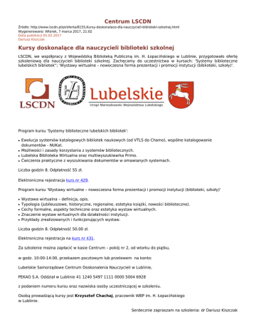 Centrum LSCDN Źródło: http://www.lscdn.pl/pl/oferta/8155,Kursy-doskonalace-dla-nauczycieli-biblioteki-szkolnej.html Wygenerowano: Wtorek, 7 marca 2017, 21:02 Data publikacji 05.02.2017 Dariusz Kiszczak Kursy doskonalące dla nauczycieli biblioteki szkolnej LSCDN, we współpracy z Wojewódzką Biblioteką Publiczną im. H. Łopacińskiego w Lublinie, przygotowało ofertę szkoleniową dla nauczycieli biblioteki szkolnej. Zachęcamy do uczestnictwa w kursach: 'Systemy biblioteczne lubelskich bibliotek''; 'Wystawy wirtualne – nowoczesna forma prezentacji i promocji instytucji (biblioteki, szkoły)'. Program kursu 'Systemy biblioteczne lubelskich bibliotek': ● ● ● ● Ewolucja systemów katalogowych bibliotek naukowych (od VTLS do Chamo), wspólne katalogowanie dokumentów - NUKat. Możliwości i zasady korzystania z systemów bibliotecznych. Lubelska Biblioteka Wirtualna oraz multiwyszukiwarka Primo. Ćwiczenia praktyczne z wyszukiwania dokumentów w omawianych systemach. Liczba godzin 8. Odpłatność 55 zł. Elektroniczna rejestracja kurs nr 429. Program kursu 'Wystawy wirtualne – nowoczesna forma prezentacji i promocji instytucji (biblioteki, szkoły)' ● ● ● ● ● Wystawa wirtualna – definicja, opis. Typologia (jubileuszowe, historyczne, regionalne, estetyka książki, nowości biblioteczne). Cechy formalne, aspekty techniczne oraz estetyka wystaw wirtualnych. Znaczenie wystaw wirtualnych dla działalności instytucji. Przykłady zrealizowanych i funkcjonujących wystaw. Liczba godzin 8. Odpłatność 50.00 zł. Elektroniczna rejestracja na kurs nr 431. Za szkolenie można zapłacić w kasie Centrum – pokój nr 2, od wtorku do piątku, w godz. 10:00-14:00, przekazem pocztowym lub przelewem na konto: Lubelskie Samorządowe Centrum Doskonalenia Nauczycieli w Lublinie, PEKAO S.A. Oddział w Lublinie 41 1240 5497 1111 0000 5004 6928 z podaniem numeru kursu oraz nazwiska osoby uczestniczącej w szkoleniu. Osobą prowadzącą kursy jest Krzysztof Chachaj, pracownik WBP im. H. Łopacińskiego w Lublinie. Serdecznie zapraszam na szkolenia: dr Dariusz Kiszczak