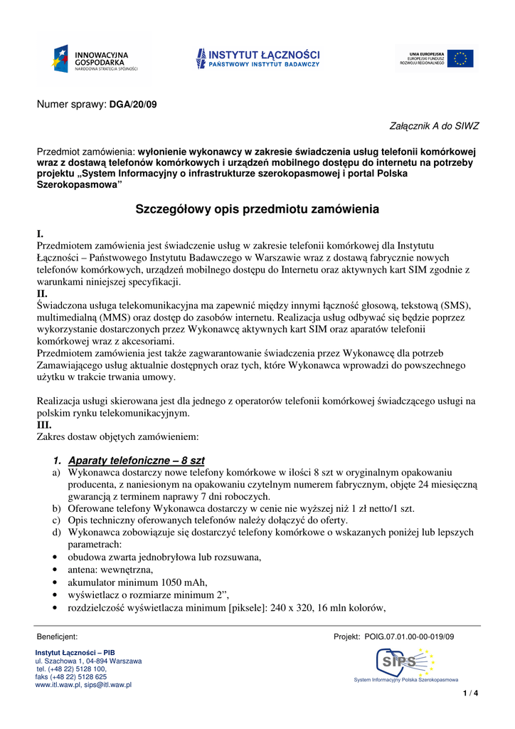 Numer sprawy: DGA/20/09 Załącznik A do SIWZ Przedmiot zamówienia: wyłonienie wykonawcy w zakresie świadczenia usług telefonii komórkowej wraz z dostawą telefonów komórkowych i urządzeń mobilnego dostępu do internetu na potrzeby projektu „System Informacyjny o infrastrukturze szerokopasmowej i portal Polska Szerokopasmowa” Szczegółowy opis przedmiotu zamówienia I. Przedmiotem zamówienia jest świadczenie usług w zakresie telefonii komórkowej dla Instytutu Łączności – Państwowego Instytutu Badawczego w Warszawie wraz z dostawą fabrycznie nowych telefonów komórkowych, urządzeń mobilnego dostępu do Internetu oraz aktywnych kart SIM zgodnie z warunkami niniejszej specyfikacji. II. Świadczona usługa telekomunikacyjna ma zapewnić między innymi łączność głosową, tekstową (SMS), multimedialną (MMS) oraz dostęp do zasobów internetu. Realizacja usług odbywać się będzie poprzez wykorzystanie dostarczonych przez Wykonawcę aktywnych kart SIM oraz aparatów telefonii komórkowej wraz z akcesoriami. Przedmiotem zamówienia jest także zagwarantowanie świadczenia przez Wykonawcę dla potrzeb Zamawiającego usług aktualnie dostępnych oraz tych, które Wykonawca wprowadzi do powszechnego użytku w trakcie trwania umowy. Realizacja usługi skierowana jest dla jednego z operatorów telefonii komórkowej świadczącego usługi na polskim rynku telekomunikacyjnym. III. Zakres dostaw objętych zamówieniem: 1. Aparaty telefoniczne – 8 szt a) Wykonawca dostarczy nowe telefony komórkowe w ilości 8 szt w oryginalnym opakowaniu producenta, z naniesionym na opakowaniu czytelnym numerem fabrycznym, objęte 24 miesięczną gwarancją z terminem naprawy 7 dni roboczych. b) Oferowane telefony Wykonawca dostarczy w cenie nie wyższej niż 1 zł netto/1 szt. c) Opis techniczny oferowanych telefonów należy dołączyć do oferty. d) Wykonawca zobowiązuje się dostarczyć telefony komórkowe o wskazanych poniżej lub lepszych parametrach: • obudowa zwarta jednobryłowa lub rozsuwana, • antena: wewnętrzna, • akumulator minimum 1050 mAh, • wyświetlacz o rozmiarze minimum 2”, • rozdzielczość wyświetlacza minimum [piksele]: 240 x 320, 16 mln kolorów, Beneficjent: Projekt: POIG.07.01.00-00-019/09 Instytut Łączności – PIB ul. Szachowa 1, 04-894 Warszawa tel. (+48 22) 5128 100, faks (+48 22) 5128 625 www.itl.waw.pl, [email protected] 1/4 • • • • • • • • • • • • • • • • wbudowany aparat fotograficzny o rozdzielczości minimum 2 Mpx, dyktafon, obsługa kart pamięci: microSD, karta pamięci minimum 1 GB, obsługa wiadomości Smil, obsługiwane formaty wideo: 3GPP (H.263), H.264/AVC, obsługiwane formaty zdjęć: JPEG, odtwarzacz MP3, odtwarzacz wideo, radio FM, rejestrowanie nagrań wideo, transmisja strumieniowa wideo, transmisja UMTS minimum 3,6 Mb/s, sposób połączenia z urządzeniami zewnętrznymi: USB, Bluetooth, wbudowany modem, minimalna zawartość zestawu: aparat telefoniczny, słuchawka bluetooth, bateria, ładowarka, zestaw słuchawkowy, instrukcja obsługi w języku polskim, 2. • • • • Karty SIM objęte aktywacją dla usługi telefonii komórkowej – 8 szt umowa: 24 miesiące, minimum 180 minut rozmów do wykorzystania w ramach abonamentu, stała opłata abonamentowa przez cały okres obowiązywania umowy Wykonawca utworzy dla zamawiającego bezpłatną wydzieloną grupę firmową (ograniczenie do 2000 minut), do której należeć będą wszystkie telefony (8 szt) w ramach niniejszego zamówienia. 3. Modemy USB mobilnego dostępu do sieci Internet – 11 szt a) Wykonawca dostarczy nowe modemy USB w ilości 11 szt w oryginalnym opakowaniu producenta, z naniesionym na opakowaniu czytelnym numerem fabrycznym, objęte 24 miesięczną gwarancją z terminem naprawy 7 dni roboczych. b) Oferowane modemy Wykonawca dostarczy w cenie nie wyższej niż 1 zł netto/1 szt. c) Opis techniczny oferowanych modemów należy dołączyć do oferty. d) Wykonawca zobowiązuje się dostarczyć modemy o wskazanych poniżej lub lepszych parametrach: • Obsługiwane sieci: EDGE/GPRS/GSM 850/900/1800/1900MH + HSDPA/UMTS 2100 MHz, Transmisja danych: • 3G: tak • CSD: tak • EDGE: tak • GPRS: tak • HSCSD: nie • HSDPA: tak Beneficjent: Projekt: POIG.07.01.00-00-019/09 Instytut Łączności – PIB ul. Szachowa 1, 04-894 Warszawa tel. (+48 22) 5128 100, faks (+48 22) 5128 625 www.itl.waw.pl, [email protected] 2/4 • Prędkość przesyłu 3G: 384 kb/s, • Prędkość przesyłu EDGE: 236,8 kb/s, • Prędkość przesyłu GPRS: 53,6 kb/s, • Prędkość przesyłu HSCSD: n.d., • Prędkość przesyłu HSDPA: 3,6 Mb/s (pobieranie), Inne funkcje: • Dioda LED informująca o statusie sieci 4. Modem + router WiFi działający w technologii CDMA – 1 szt a) Wykonawca dostarczy nowy modem z routerem w ilości 1 szt w oryginalnym opakowaniu producenta, z naniesionym na opakowaniu czytelnym numerem fabrycznym, objęte 24 miesięczną gwarancją z terminem naprawy 7 dni roboczych. b) Oferowany modem Wykonawca dostarczy w cenie nie wyższej niż 1 zł netto/1 szt. c) Opis techniczny modemu z routerem należy dołączyć do oferty. d) Wykonawca zobowiązuje się dostarczyć modem z routerem o wskazanych poniżej lub lepszych parametrach: • Modem wykorzystuje technologię CDMA, • Sposób podłączenia: bezprzewodowo, • Umożliwia połączenie internetowe do 3.0 Mbps (w przypadku odbioru danych) oraz 1.8 Mbps ( w przypadku przesyłu danych) 5. • • • Karty SIM objęte aktywacją dla usługi mobilnego dostępu do sieci Internet – 14 szt Umowa: 24 miesiące, Limit przesyłu danych: minimum 6 GB, Stała opłata abonamentowa przez cały okres obowiązywania umowy 6. • • • Karty SIM objęte aktywacją dla usługi mobilnego dostępu do sieci Internet – 1 szt Umowa: 24 miesiące, Limit przesyłu danych: minimum 26 GB, Stała opłata abonamentowa przez cały okres obowiązywania umowy 7. Netbooki z wbudowanym mo