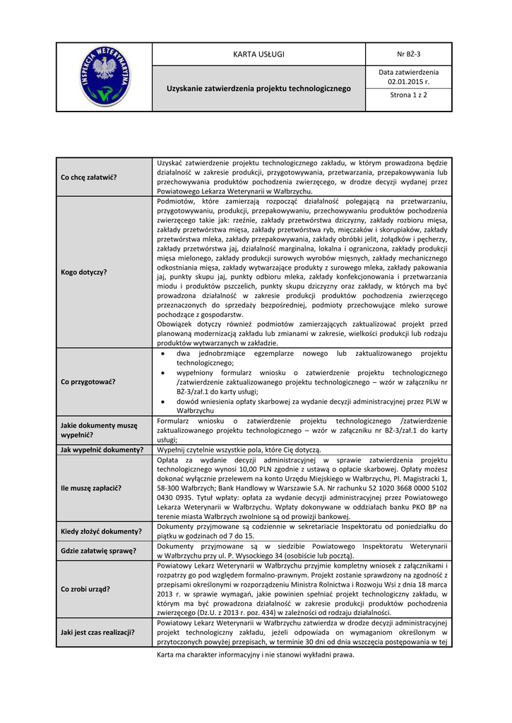 KARTA USŁUGI Uzyskanie zatwierdzenia projektu technologicznego Co chcę załatwić? Kogo dotyczy? Co przygotować? Jakie dokumenty muszę wypełnić? Jak wypełnić dokumenty? Ile muszę zapłacić? Kiedy złożyć dokumenty? Gdzie załatwię sprawę? Co zrobi urząd? Jaki jest czas realizacji? Nr BŻ-3 Data zatwierdzenia 02.01.2015 r. Strona 1 z 2 Uzyskać zatwierdzenie projektu technologicznego zakładu, w którym prowadzona będzie działalność w zakresie produkcji, przygotowywania, przetwarzania, przepakowywania lub przechowywania produktów pochodzenia zwierzęcego, w drodze decyzji wydanej przez Powiatowego Lekarza Weterynarii w Wałbrzychu. Podmiotów, które zamierzają rozpocząć działalność polegającą na przetwarzaniu, przygotowywaniu, produkcji, przepakowywaniu, przechowywaniu produktów pochodzenia zwierzęcego takie jak: rzeźnie, zakłady przetwórstwa dziczyzny, zakłady rozbioru mięsa, zakłady przetwórstwa mięsa, zakłady przetwórstwa ryb, mięczaków i skorupiaków, zakłady przetwórstwa mleka, zakłady przepakowywania, zakłady obróbki jelit, żołądków i pęcherzy, zakłady przetwórstwa jaj, działalność marginalna, lokalna i ograniczona, zakłady produkcji mięsa mielonego, zakłady produkcji surowych wyrobów mięsnych, zakłady mechanicznego odkostniania mięsa, zakłady wytwarzające produkty z surowego mleka, zakłady pakowania jaj, punkty skupu jaj, punkty odbioru mleka, zakłady konfekcjonowania i przetwarzania miodu i produktów pszczelich, punkty skupu dziczyzny oraz zakłady, w których ma być prowadzona działalność w zakresie produkcji produktów pochodzenia zwierzęcego przeznaczonych do sprzedaży bezpośredniej, podmioty przechowujące mleko surowe pochodzące z gospodarstw. Obowiązek dotyczy również podmiotów zamierzających zaktualizować projekt przed planowaną modernizacją zakładu lub zmianami w zakresie, wielkości produkcji lub rodzaju produktów wytwarzanych w zakładzie. dwa jednobrzmiące egzemplarze nowego lub zaktualizowanego projektu technologicznego; wypełniony formularz wniosku o zatwierdzenie projektu technologicznego /zatwierdzenie zaktualizowanego projektu technologicznego – wzór w załączniku nr BŻ-3/zał.1 do karty usługi; dowód wniesienia opłaty skarbowej za wydanie decyzji administracyjnej przez PLW w Wałbrzychu Formularz wniosku o zatwierdzenie projektu technologicznego /zatwierdzenie zaktualizowanego projektu technologicznego – wzór w załączniku nr BŻ-3/zał.1 do karty usługi; Wypełnij czytelnie wszystkie pola, które Cię dotyczą. Opłata za wydanie decyzji administracyjnej w sprawie zatwierdzenia projektu technologicznego wynosi 10,00 PLN zgodnie z ustawą o opłacie skarbowej. Opłaty możesz dokonać wyłącznie przelewem na konto Urzędu Miejskiego w Wałbrzychu, Pl. Magistracki 1, 58-300 Wałbrzych; Bank Handlowy w Warszawie S.A. Nr rachunku 52 1020 3668 0000 5102 0430 0935. Tytuł wpłaty: opłata za wydanie decyzji administracyjnej przez Powiatowego Lekarza Weterynarii w Wałbrzychu. Wpłaty dokonywane w oddziałach banku PKO BP na terenie miasta Wałbrzych zwolnione są od prowizji bankowej. Dokumenty przyjmowane są codziennie w sekretariacie Inspektoratu od poniedziałku do piątku w godzinach od 7 do 15. Dokumenty przyjmowane są w siedzibie Powiatowego Inspektoratu Weterynarii w Wałbrzychu przy ul. P. Wysockiego 34 (osobiście lub pocztą). Powiatowy Lekarz Weterynarii w Wałbrzychu przyjmie kompletny wniosek z załącznikami i rozpatrzy go pod względem formalno-prawnym. Projekt zostanie sprawdzony na zgodność z przepisami określonymi w rozporządzeniu Ministra Rolnictwa i Rozwoju Wsi z dnia 18 marca 2013 r. w sprawie wymagań, jakie powinien spełniać projekt technologiczny zakładu, w którym ma być prowadzona działalność w zakresie produkcji produktów pochodzenia zwierzęcego (Dz.U. z 2013 r. poz. 434) w zależności od rodzaju działalności. Powiatowy Lekarz Weterynarii w Wałbrzychu zatwierdza w drodze decyzji administracyjnej projekt technologiczny zakładu, jeżeli odpowiada on wymaganiom określonym w przytoczonych powyżej przepisach, w terminie 30 dni od dnia wszczęcia postępowania w tej Karta ma charakter informacyjny i nie stanowi wykładni prawa. KARTA USŁUGI Uzyskanie zatwierdzenia projektu technologicznego Jak się odwołać? Informacje dodatkowe Podstawa prawna Nr BŻ-3 Data zatwierdzenia 02.01.2015 r. Strona 2 z 2 sprawie. Od decyzji w sprawie odmowy zatwierdzenia projektu technologicznego przysługuje wnioskodawcy odwołanie do Dolnośląskiego Wojewódzkiego Lekarza Weterynarii we Wrocławiu za pośrednictwem organu wydającego decyzję w terminie 14 dni od dnia jej doręczenia. Wszystkie dodatkowe informacje dostępne są pod numerem telefonu 74 848 11 70. Do Państwa dyspozycji jest również faks nr 74 842 69 21 oraz poczta internetowa e-mail: [email protected]. Karta usługi zawiera załączniki: załącznik nr BŻ-3/zał.1- wniosek o zatwierdzenie projektu technologicznego /zatwierdzenie zaktualizowanego projektu technologicznego ustawa z dnia 29 stycznia 2004 r. o Inspekcji Weterynaryjnej (tekst jednolity Dz.U. z 2010 r. Nr 112 poz, 744 z późn. zm.); ustawa z dnia 16 grudnia 2005 r. o produktach pochodzenia zwierzęcego (Dz.U. z 2006 r. Nr 17 poz. 127 z późn. zm.); rozporządzenie Ministra Rolnictwa i Rozwoju Wsi z dnia 18 marca 2013 r. w sprawie wymagań, jakie powinien spełniać projekt technologiczny zakładu, w którym ma być prowadzona działalność w zakresie produkcji produktów pochodzenia zwierzęcego (Dz.U. z 2013 r. poz. 434); Ustawa o opłacie skarbowej z 16 listopada 2006r. ( Dz.U.2014 poz.1628) Karta ma charakter informacyjny i nie stanowi wykładni prawa.
