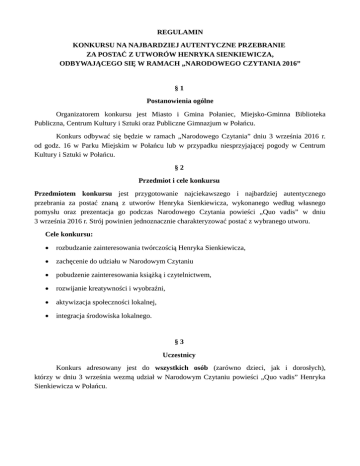 REGULAMIN KONKURSU NA NAJBARDZIEJ AUTENTYCZNE PRZEBRANIE ZA POSTAĆ Z UTWORÓW HENRYKA SIENKIEWICZA, ODBYWAJĄCEGO SIĘ W RAMACH „NARODOWEGO CZYTANIA 2016” §1 Postanowienia ogólne Organizatorem konkursu jest Miasto i Gmina Połaniec, Miejsko-Gminna Biblioteka Publiczna, Centrum Kultury i Sztuki oraz Publiczne Gimnazjum w Połańcu. Konkurs odbywać się będzie w ramach „Narodowego Czytania” dniu 3 września 2016 r. od godz. 16 w Parku Miejskim w Połańcu lub w przypadku niesprzyjającej pogody w Centrum Kultury i Sztuki w Połańcu. §2 Przedmiot i cele konkursu Przedmiotem konkursu jest przygotowanie najciekawszego i najbardziej autentycznego przebrania za postać znaną z utworów Henryka Sienkiewicza, wykonanego według własnego pomysłu oraz prezentacja go podczas Narodowego Czytania powieści „Quo vadis” w dniu 3 września 2016 r. Strój powinien jednoznacznie charakteryzować postać z wybranego utworu. Cele konkursu: rozbudzanie zainteresowania twórczością Henryka Sienkiewicza, zachęcenie do udziału w Narodowym Czytaniu pobudzenie zainteresowania książką i czytelnictwem, rozwijanie kreatywności i wyobraźni, aktywizacja społeczności lokalnej, integracja środowiska lokalnego. §3 Uczestnicy Konkurs adresowany jest do wszystkich osób (zarówno dzieci, jak i dorosłych), którzy w dniu 3 września wezmą udział w Narodowym Czytaniu powieści „Quo vadis” Henryka Sienkiewicza w Połańcu. §4 Warunki udziału Warunkiem udziału w konkursie jest: zapoznanie się z regulaminem konkursu i akceptacja jego warunków, zgłoszenie udziału w konkursie w wyznaczonym przez organizatorów miejscu i czasie, wykonanie przebrania według własnego pomysłu i zaprezentowanie go na sobie podczas Narodowego Czytania 2016, krótka prezentacja ustna postaci, za którą uczestnik się przebrał (kim jest postać, z jakiego utworu pochodzi, czym się wsławiła itp.). Dopuszcza się, by prezentacji postaci dokonywali rodzice, którzy do udziału w konkursie zgłoszą dziecko. Zgłoszenia udziału w konkursie przyjmowane będą w dniu Narodowego Czytania (3 września 2016 r.) od godz. 15.30 do godz. 16.00 w miejscu, w którym będzie się ono odbywać. §5 Przebieg konkursu 1. Uczestnicy konkursu przebierają się za dowolną postać znaną z utworów Henryka Sienkiewicza. 2. W dniu 3 września 2016 r. od godz. 15.30 do godz. 16.00 uczestnicy (lub opiekunowie dzieci) zgłaszają udział w konkursie poprzez podanie swojego imienia i nazwiska (oraz wieku w przypadku dzieci i młodzieży) organizatorom konkursu. 3. W chwili ogłoszenia konkursu uczestnicy prezentują przebranie i dokonują krótkiej charakterystyki wybranej postaci literackiej w wyznaczonym do tego miejscu. 4. Po zaprezentowaniu się wszystkich uczestników konkursu komisja konkursowa dokonuje oceny poprzez oddanie głosu na przebrania, które jej zdaniem zasługują na nagrodę. 5. Komisję konkursową powołają organizatorzy akcji w czasie trwania Narodowego Czytania. 6. Ogłoszenie wyników konkursu i wręczenie nagród nastąpi w czasie trwania imprezy. §6 Kryteria oceny konkursu 1. Przebrania będą oceniane według podziału na kategorie wiekowe: osoby dorosłe, młodzież i dzieci. 2. Przebrania będą oceniane według następujących kryteriów: pomysłowość i wkład pracy, autentyczność stroju, najciekawsza prezentacja ustna postaci. 3. Komisja Konkursowa, oceniając uczestników konkursu, przyznawać będzie miejsca i nagrody rzeczowe zgodnie z powyższymi kryteriami oceny. 4. W przypadku małej ilości uczestników zwycięzców konkursu wybierze publiczność poprzez aplauz w określonym przez prowadzącego czasie. §7 Zasady przyznawania nagród 1. Organizator przewiduje nagrody i wyróżnienia dla laureatów konkursu w wyżej wymienionych kategoriach wiekowych. 2. Decyzje Komisji Konkursowej są ostateczne i nieodwołalne. 3. Komisja zastrzega sobie prawo do zmiany liczby przyznanych nagród i wyróżnień. §8 Ogłoszenie wyników 1. Ogłoszenie wyników konkursu oraz wręczenie nagród nastąpi w dniu imprezy. 2. Laureaci konkursu są zobowiązani do osobistego odbioru nagrody. W przypadku dzieci odbioru nagród dokonują rodzice lub opiekunowie. 3. Relacja z imprezy, w tym wyniki konkursu wraz ze zdjęciami uczestników, zostaną opublikowane na stronach internetowych oraz profilach na Facebooku organizatorów konkursu oraz podane do wiadomości publicznej (lokalne serwisy informacyjne). §9 Postanowienia końcowe 1. Udział w konkursie jest jednoznaczny z akceptacją niniejszego regulaminu i wyrażeniem zgody przez prawnego opiekuna uczestnika konkursu na wykorzystanie danych osobowych (imię i nazwisko, wiek) i wizerunku uczestnika w celu wyłonienia zwycięzcy konkursu i przyznania nagrody. 2. Opiekun prawny uczestnika konkursu wyraża zgodę na umieszczenia danych osobowych i wizerunku uczestnika w materiałach publikowanych przez organizatorów. 3. Opiekun prawny uczestnika konkursu ma prawo wglądu do danych osobowych uczestnika oraz ich weryfikacji. 4. Regulamin konkursu opublikowany jest m.in. na stronie internetowej organizatorów konkursu. 5. Organizator zastrzega sobie prawo do zmiany regulaminu w każdym czasie bez podania przyczyny.